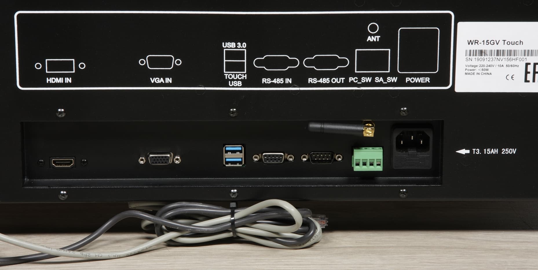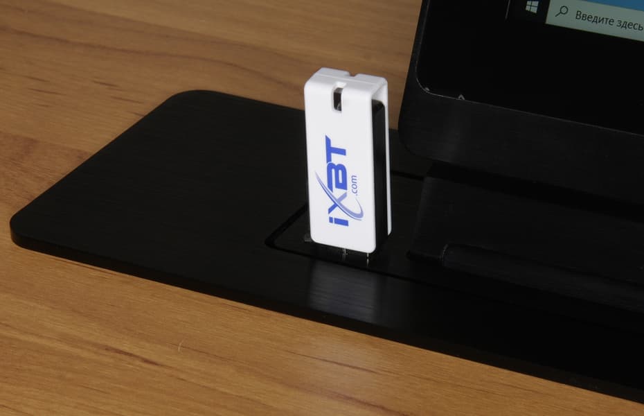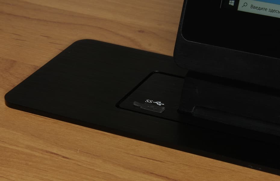 Верхний разъем USB тип А (3,0) предназначен для сквозного подключения USB-входа, расположенного рядом с экраном монитора, а нижний — для подключения сенсорной панели монитора к ПК. Неудобства с этими разъемами два: во-первых, придется использовать довольно редкие USB-кабели, у которых с двух сторон разъемы-вилки USB типа А; во-вторых, кабелей нужно два. Было бы гораздо удобнее, если производитель оснастил систему одним привычным гнездом USB типа B и встроил USB-концентратор, тогда для подключения USB-входа и сенсорной панели можно было бы использовать один стандартный кабель с разъемами типа A и B.