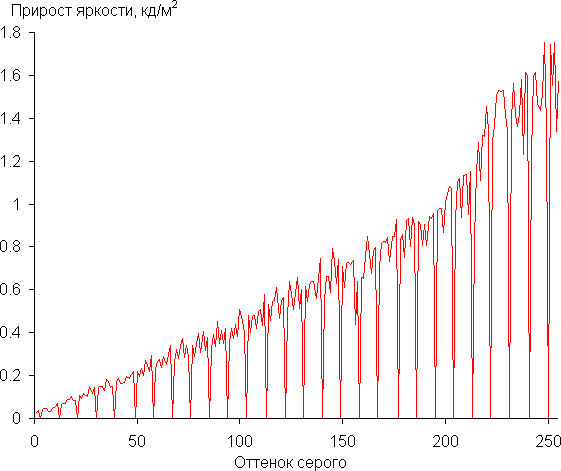 Далее мы измерили яркость 256 оттенков серого (от 0, 0, 0 до 255, 255, 255) в случае выбранного по умолчанию профиля цветовой температуры. График ниже показывает прирост (не абсолютное значение!) яркости между соседними полутонами: