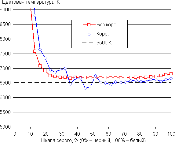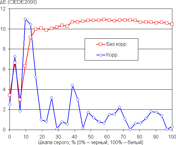 Самый близкий к черному диапазон можно не учитывать, так как в нем цветопередача не так важна, а погрешность измерения цветовых характеристик высокая. По потребительским критериям встроенный заводской профиль User и без коррекции достаточно хорош, хотя ΔE в нем все же высоковата. Ручная коррекция на большей части шкалы серого существенно уменьшила ΔE, но выполнять такую коррекцию особого смысла все равно нет.