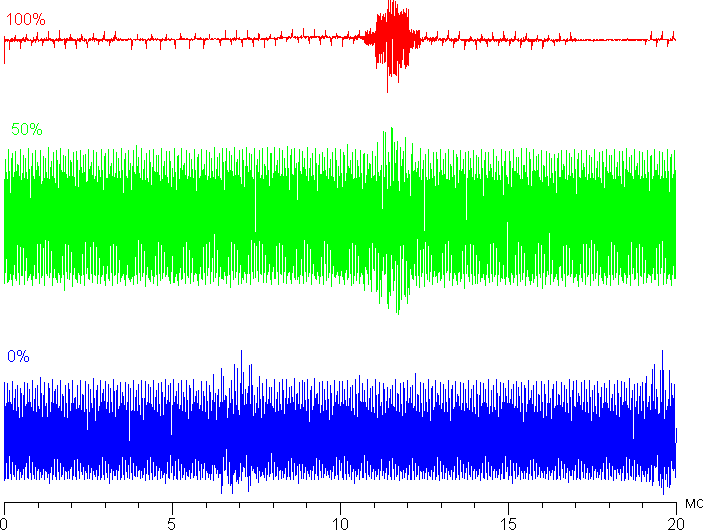 На среднем и низком уровне яркости есть значимая модуляция подсветки, но ее относительно небольшая амплитуда и очень высокая частота (порядка 22 кГц) исключают видимое мерцание, которое не обнаруживается даже в тесте на стробоскопический эффект. В доказательство приведем графики зависимости яркости (вертикальная ось) от времени (горизонтальная ось) при различных значениях настройки яркости: