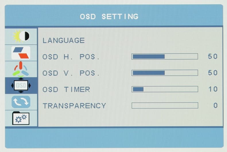 Настроек монитора немного, и все их можно оставить на заводских значениях. Для меню можно выбрать один из 12 языков, среди которых русского нет.