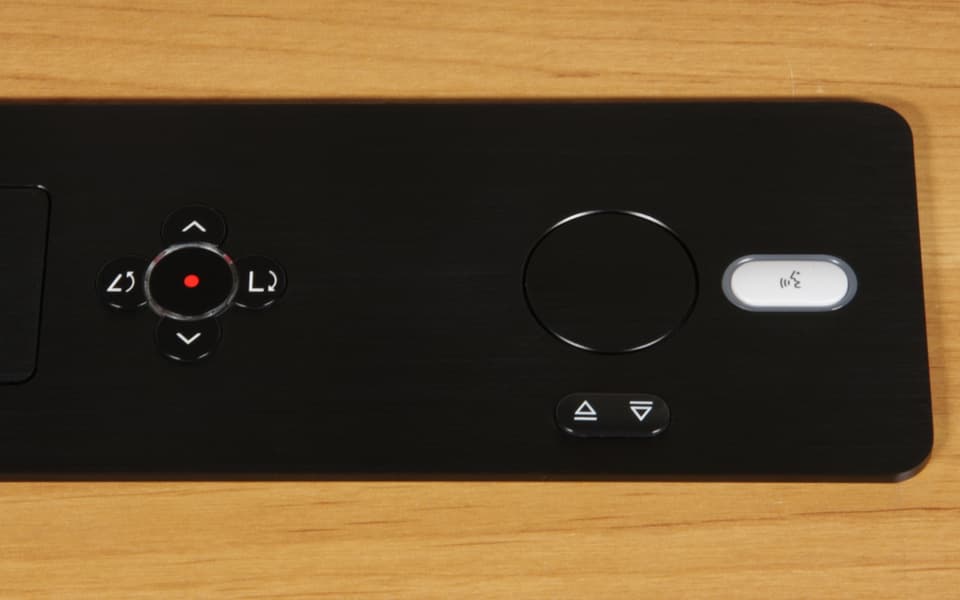 Из такого же материала изготовлены крышки люков монитора и микрофона, корпус экрана и панель основания экрана. В итоге верхняя панель выглядит аккуратно, строго и не привлекает к себе внимания, особенно, если ее цвет совпадает с цветом столешницы, а строгость дизайна сохраняется, когда монитор поднят в рабочее положение.
