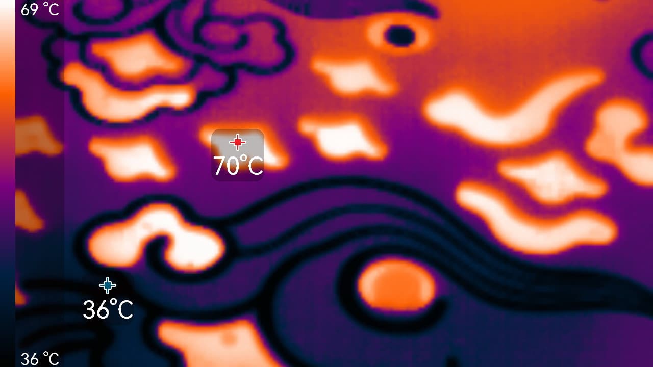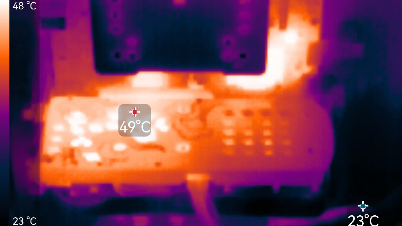 Максимум нагрева — около GPU и у преобразователей питания.