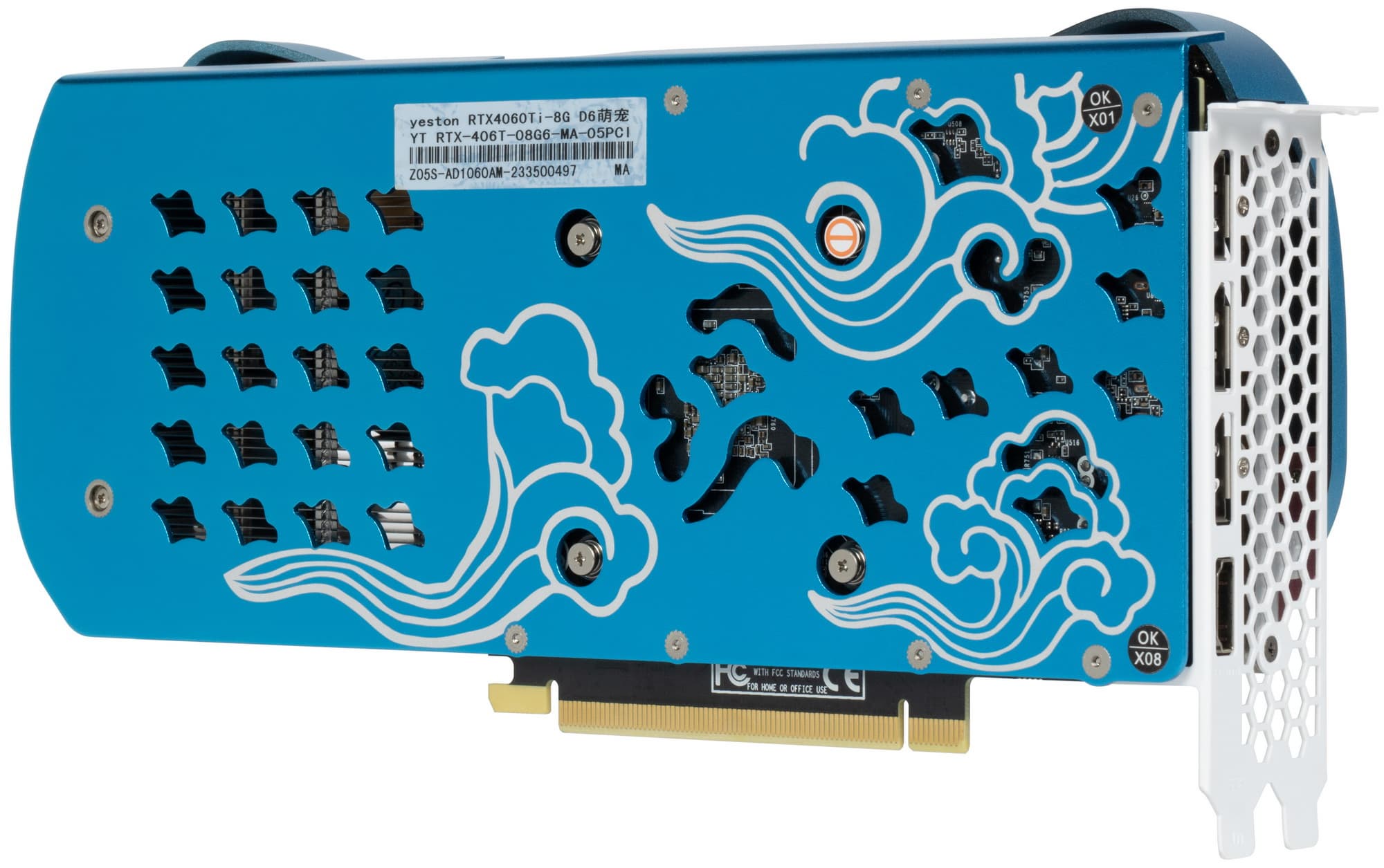 Yeston GeForce RTX 4060 Ti Cute Pet 8GD6 (8 ГБ) — оригинальный внешне представитель среднебюджетного видеоускорителя, очень привлекательный, если играть на нем в игры с DLSS (особенно с DLSS 3): умеренное потребление (до 145 Вт), не слишком шумная система охлаждения, почти стандартные габариты (25×11×5,5 см, 3 слота). Набор видеовыходов стандартный: 3 DP и 1 HDMI. Карта имеет обычный 8-контактный разъем питания. Ключевая особенность этой модели — оформление карты под мордочку животного, поддерживаемое подсветкой, однако подсветка не отключается.