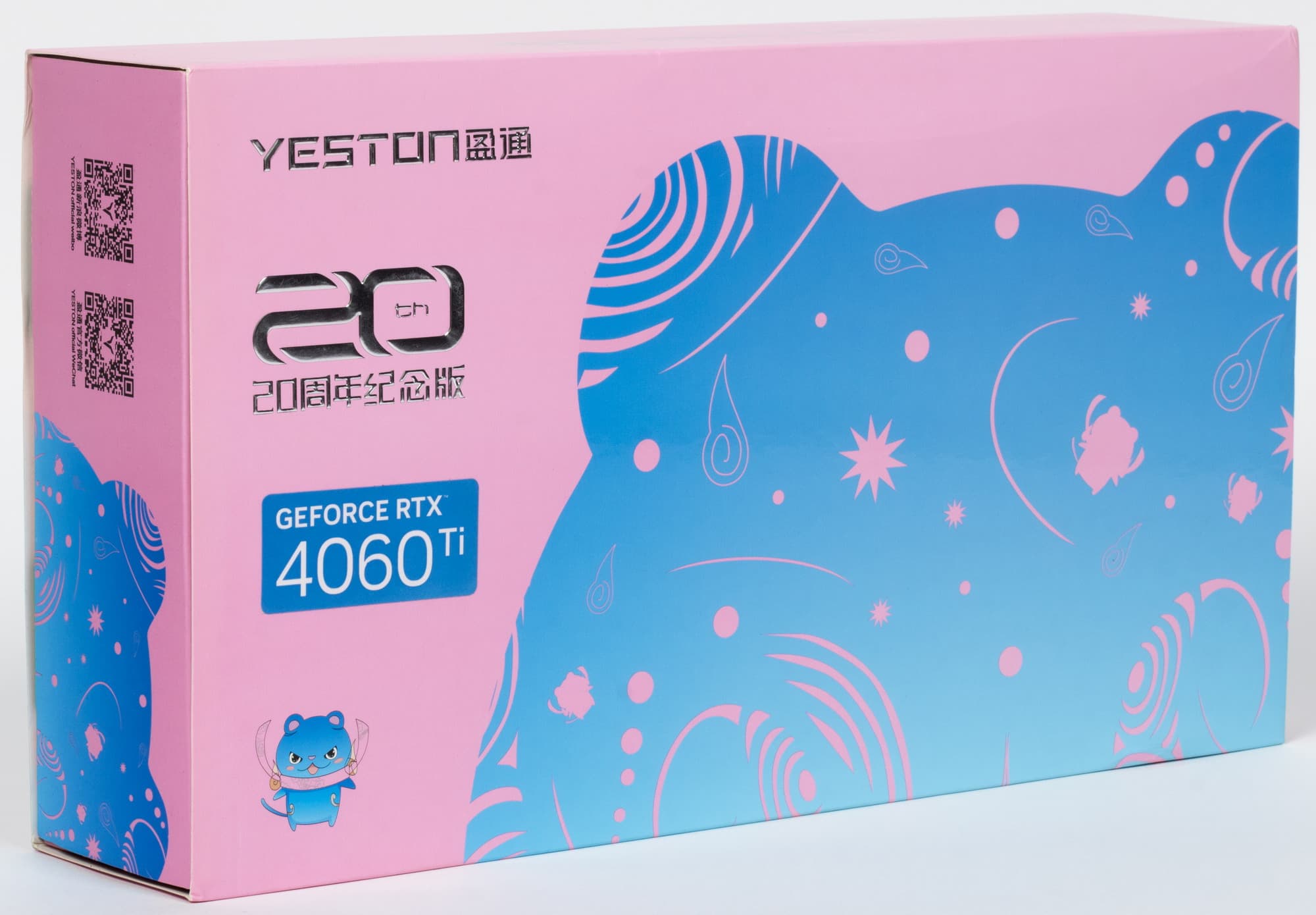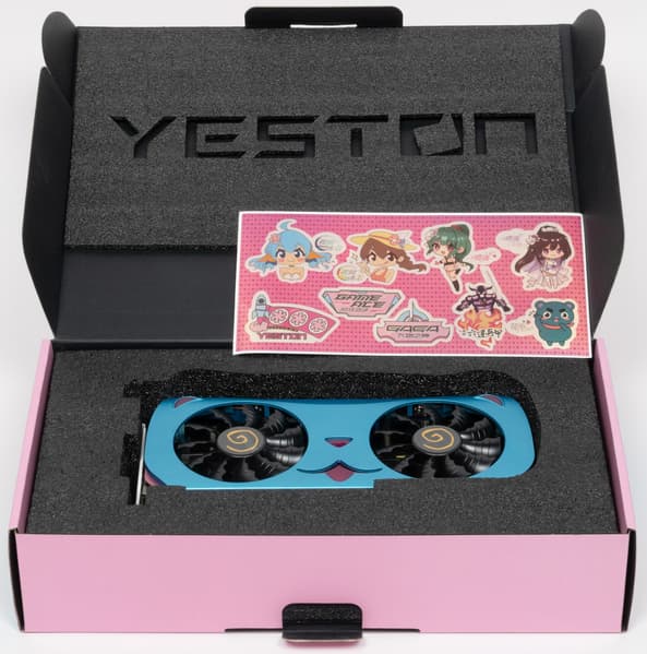 Комплект поставки включает только набор стикеров из любимых китайцами мультфильмов. Красивая коробка в честь 20-летия начала выпуска видеокарт Yeston упакована в дополнительную белую картонную коробку (по крайней мере, в таком виде ее можно купить в России).