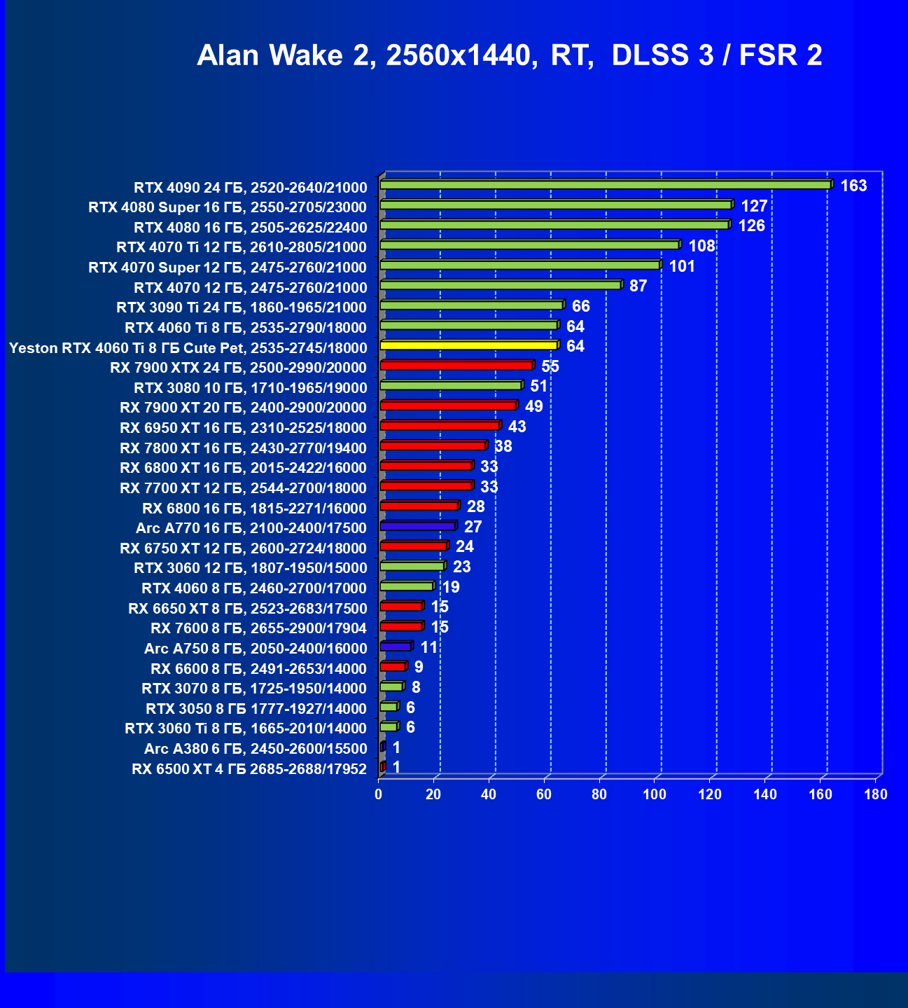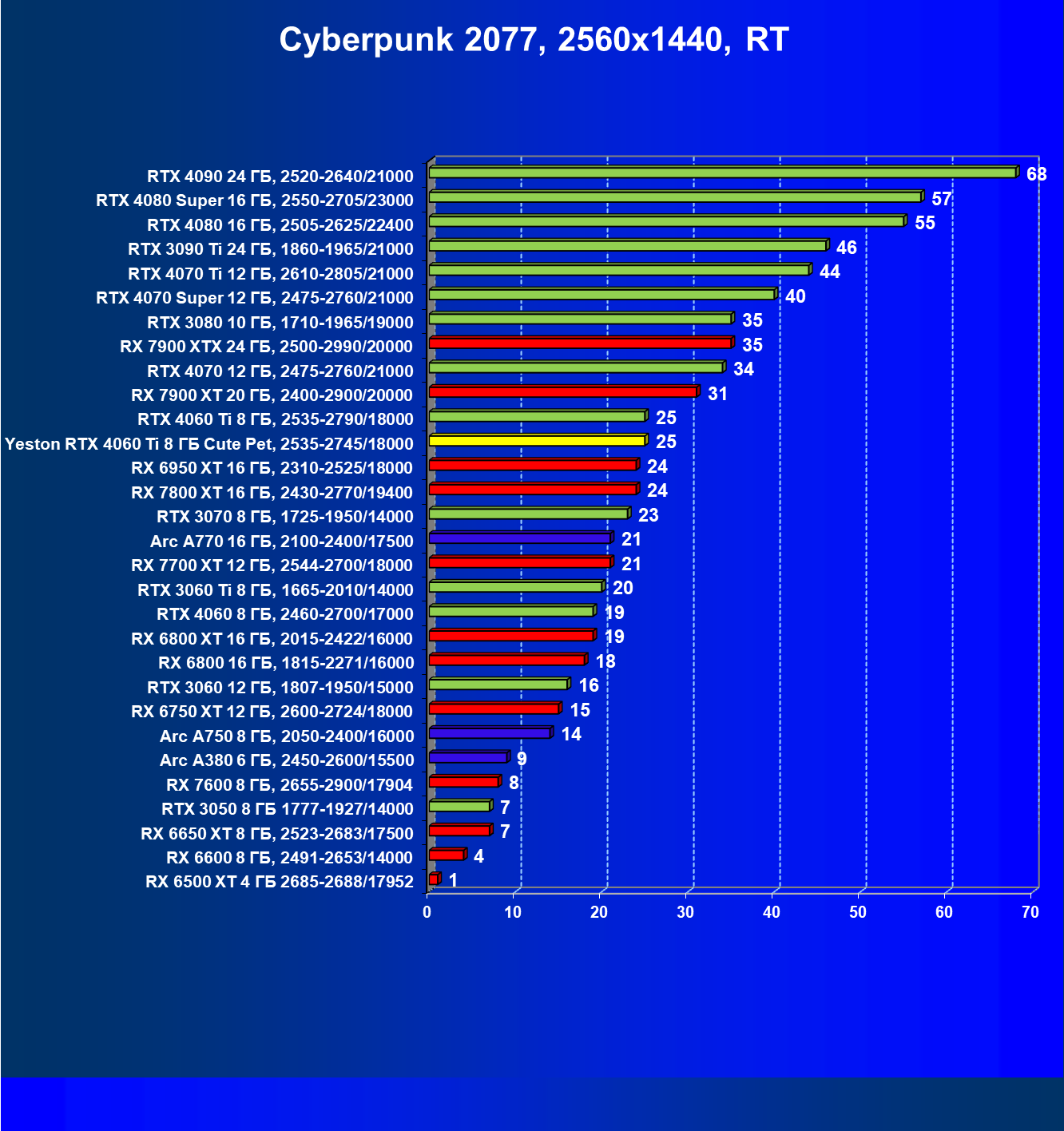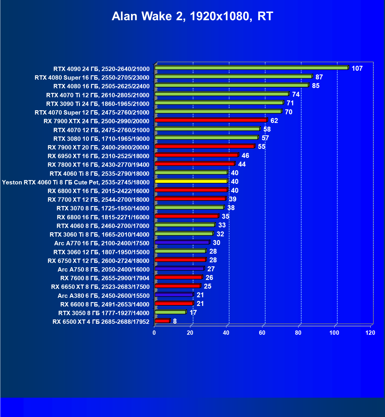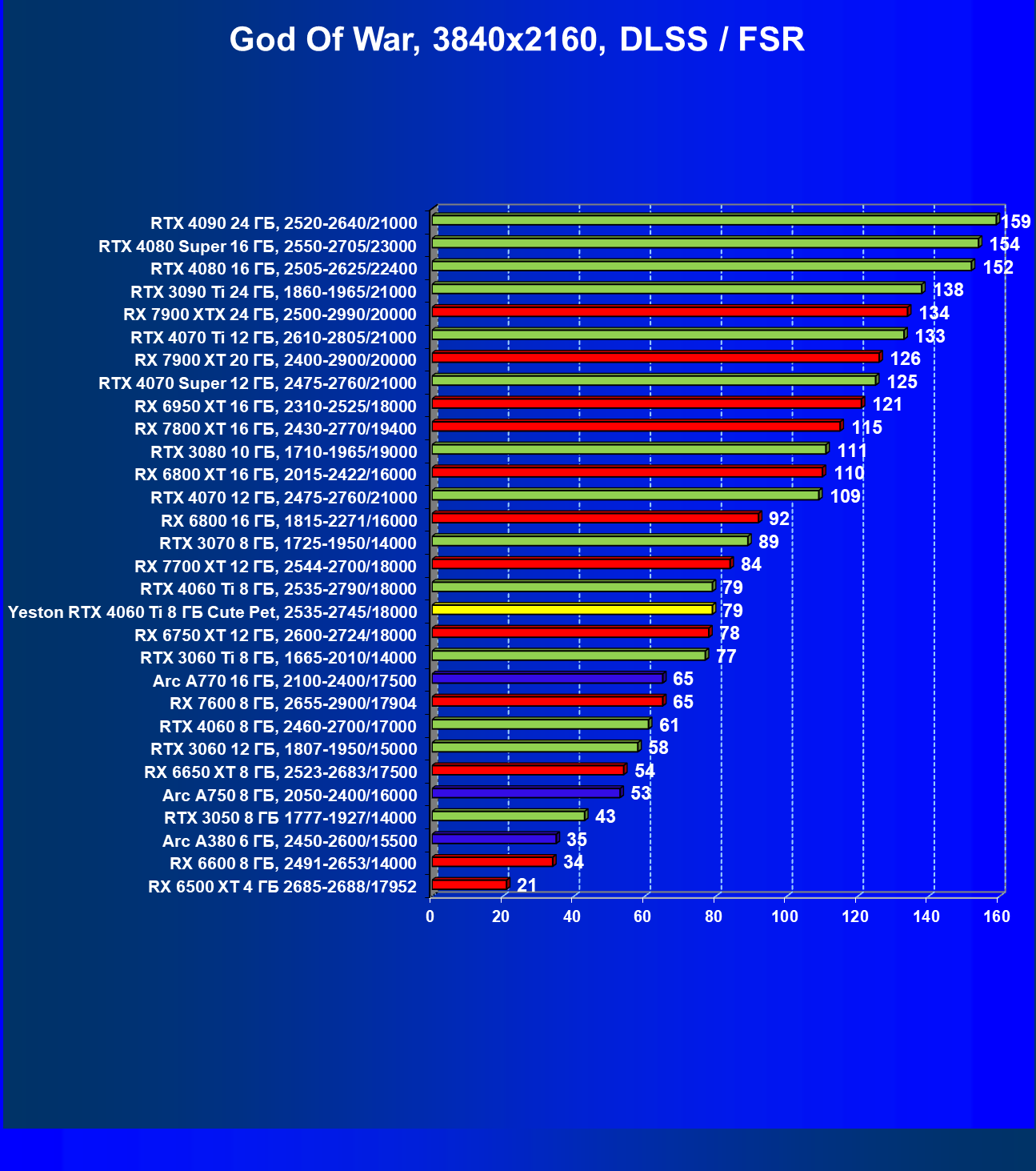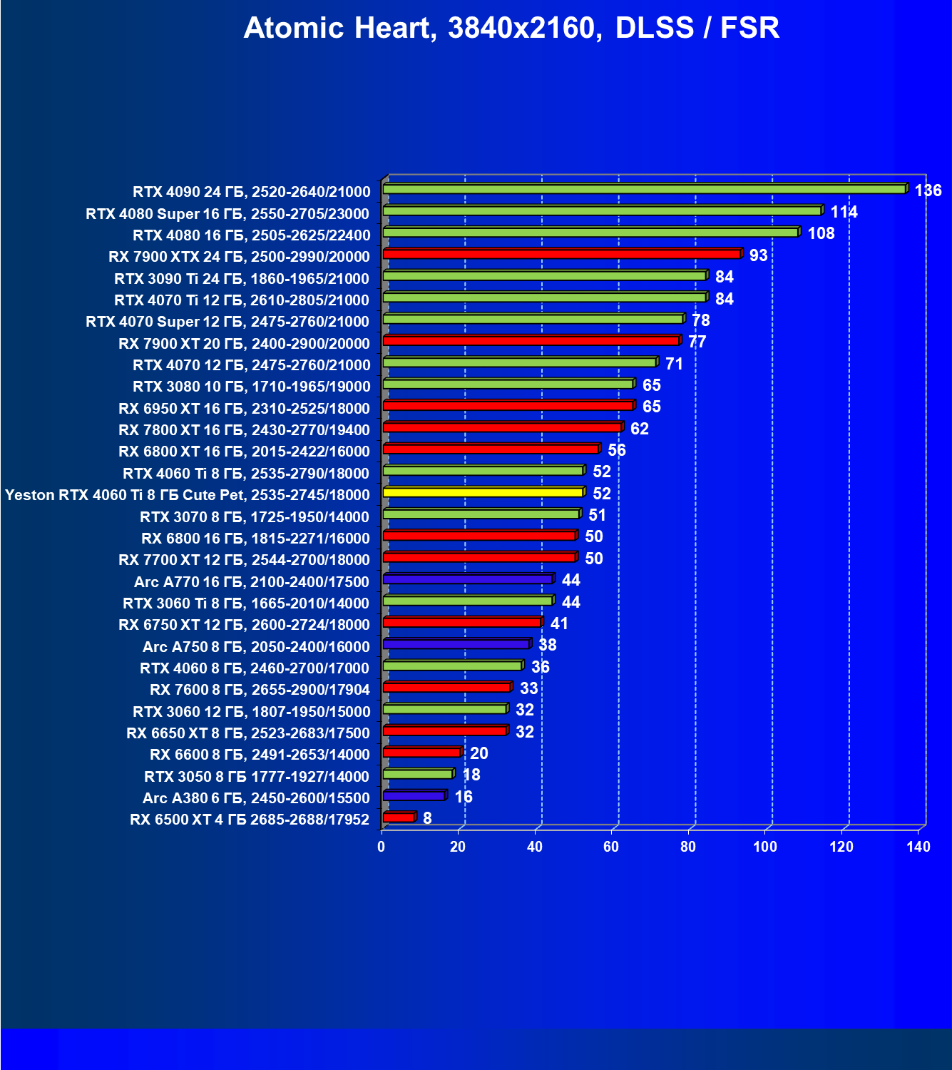 За счет того, что GeForce RTX 4060 Ti поддерживает DLSS 3, а у нас в списке тестовых игр имеется уже пять игр с поддержкой этой технологии, карта Yeston вышла в лидеры (да и базовая GeForce RTX 4060 Ti тоже).