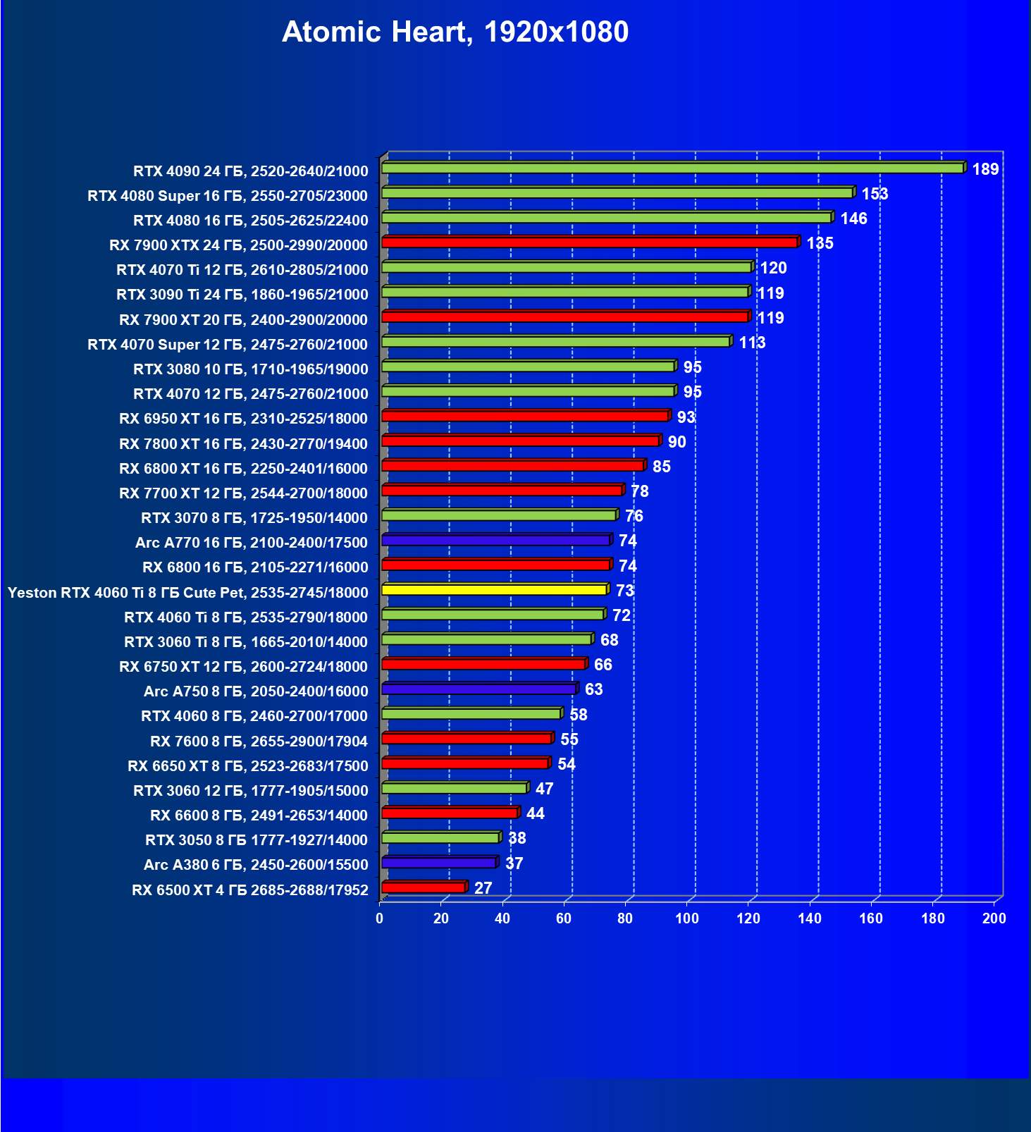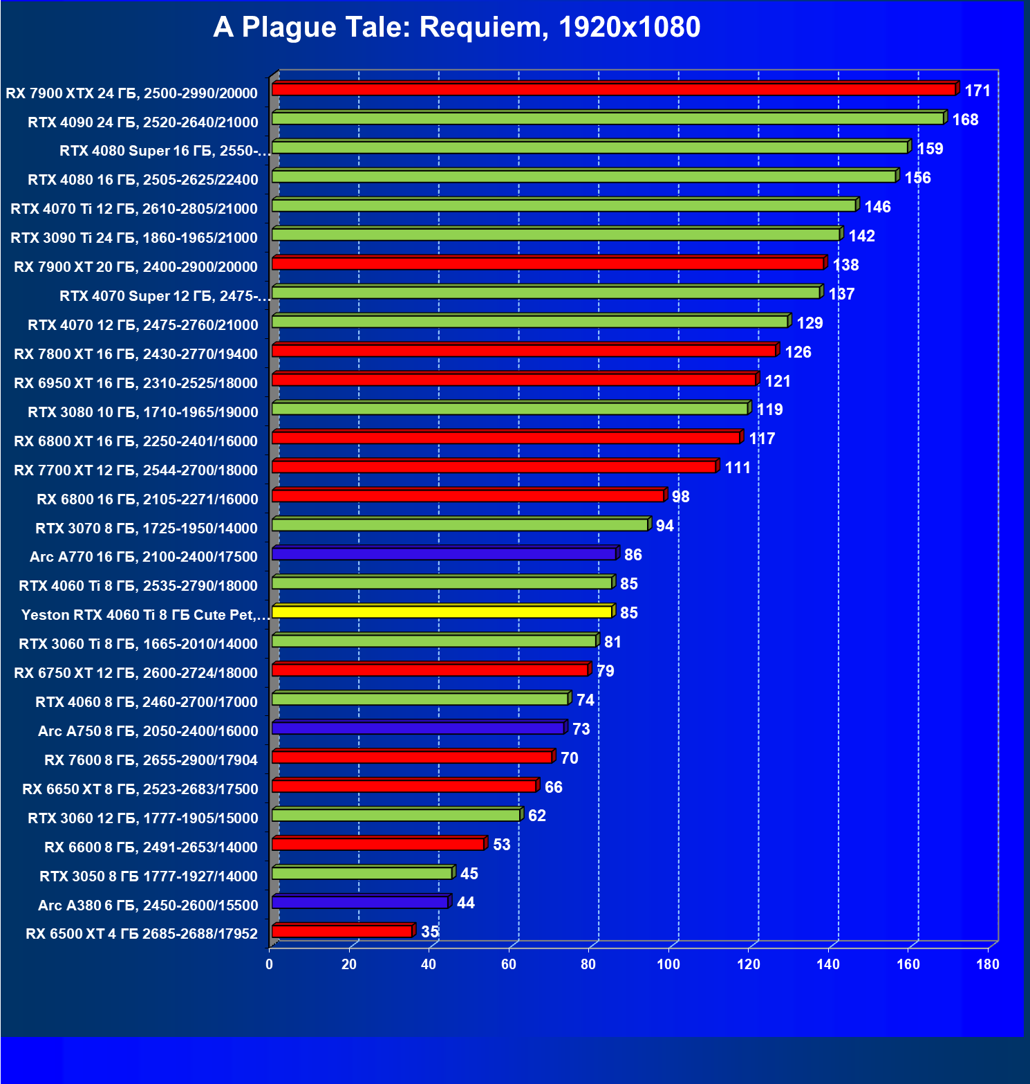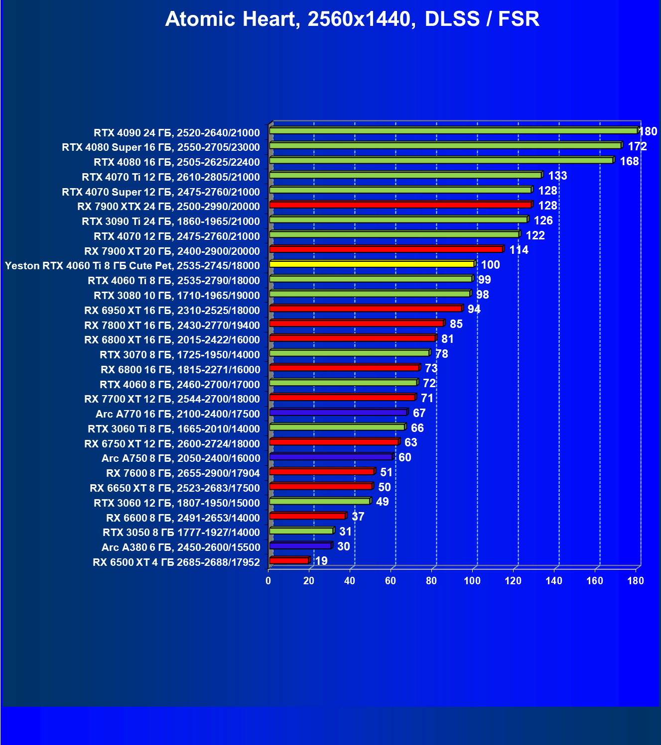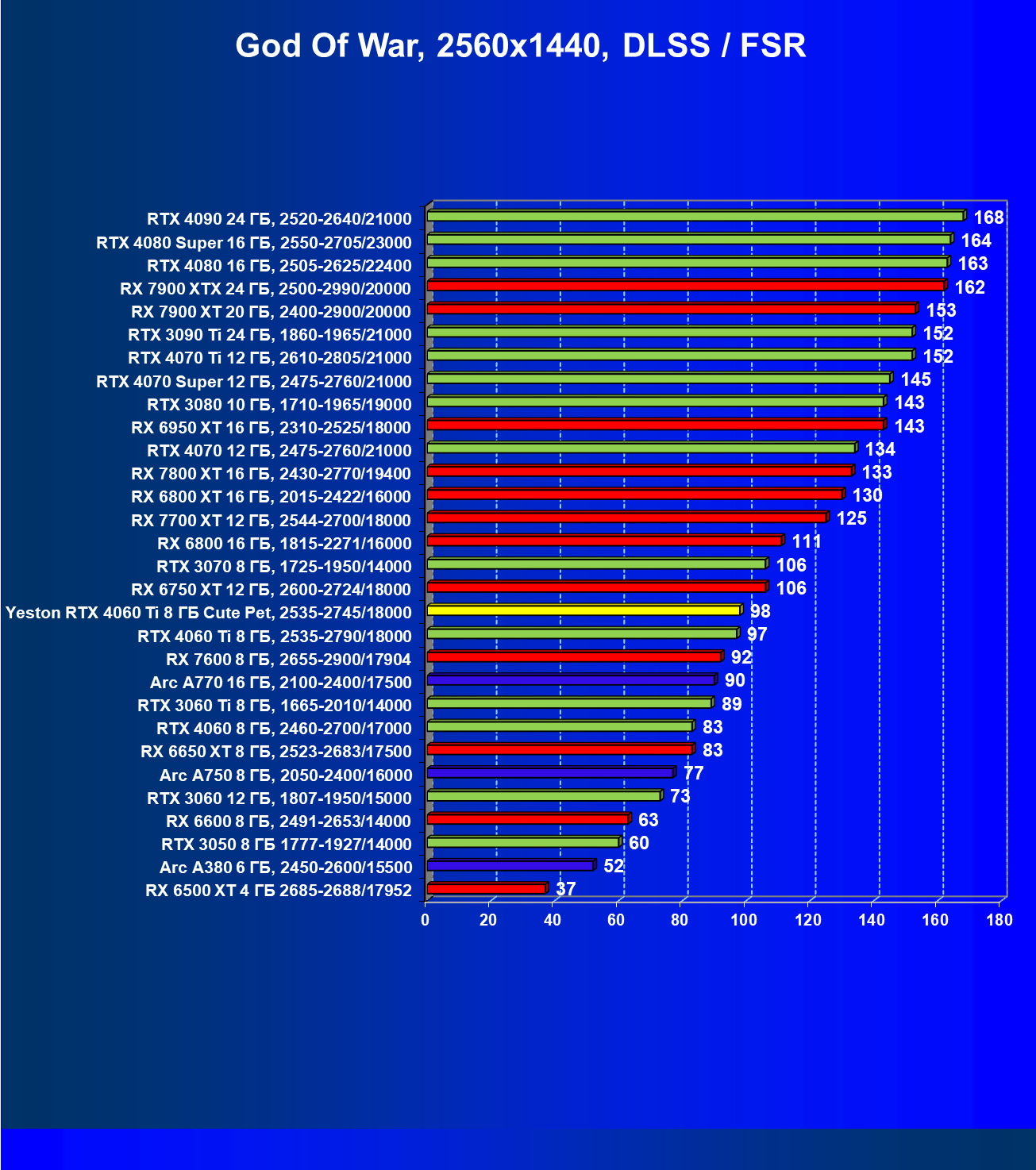 За счет того, что GeForce RTX 4060 Ti поддерживает DLSS 3, а у нас в списке тестовых игр имеется уже пять игр с поддержкой этой технологии, карта Yeston вышла в лидеры (да и базовая GeForce RTX 4060 Ti тоже).