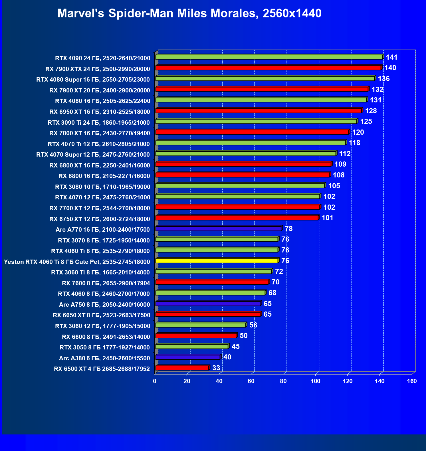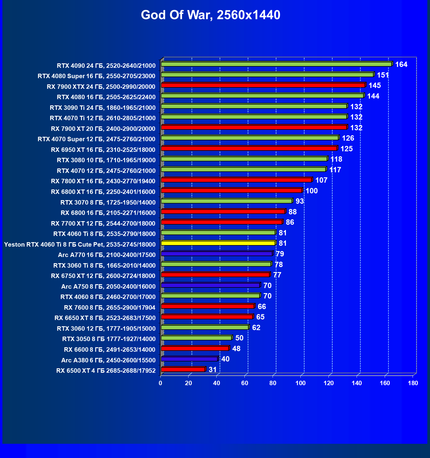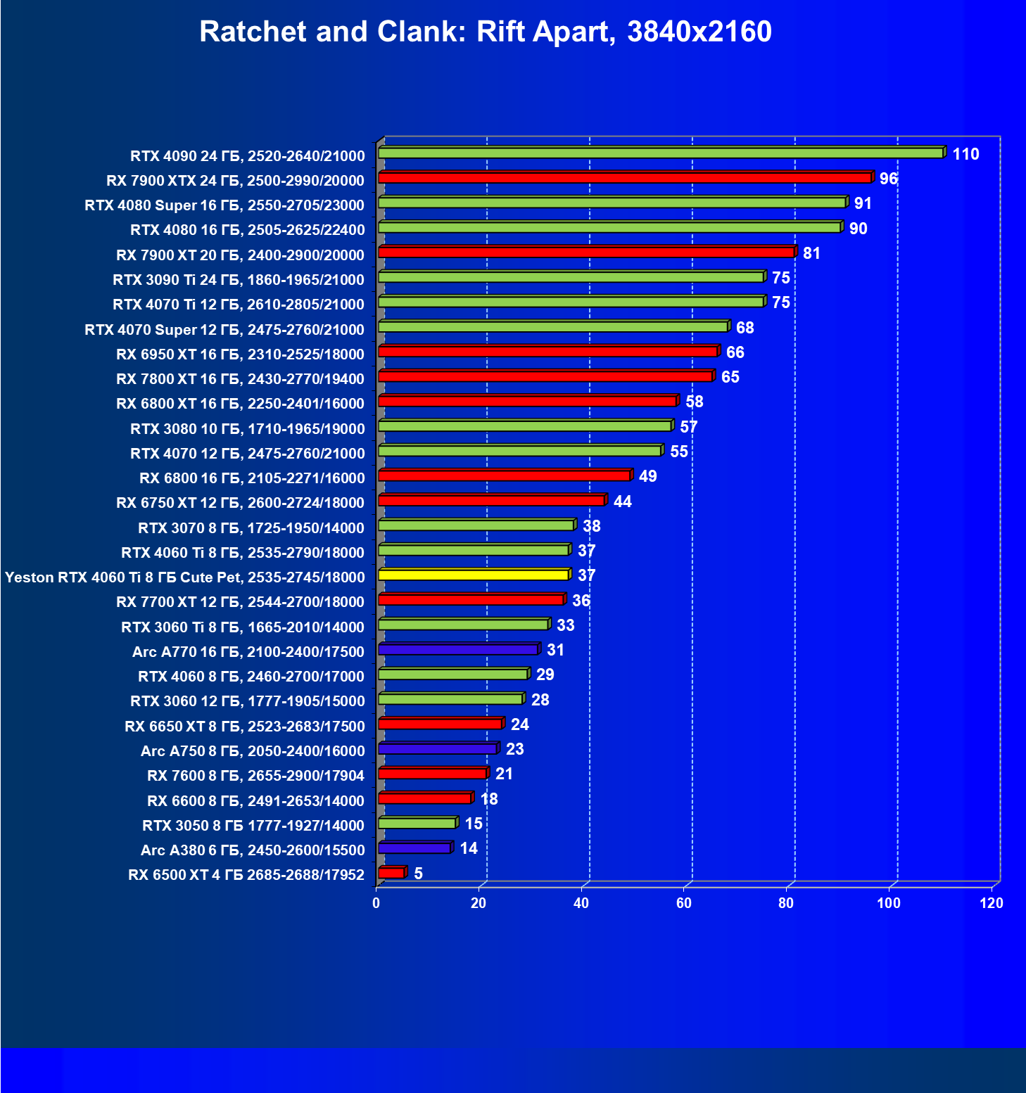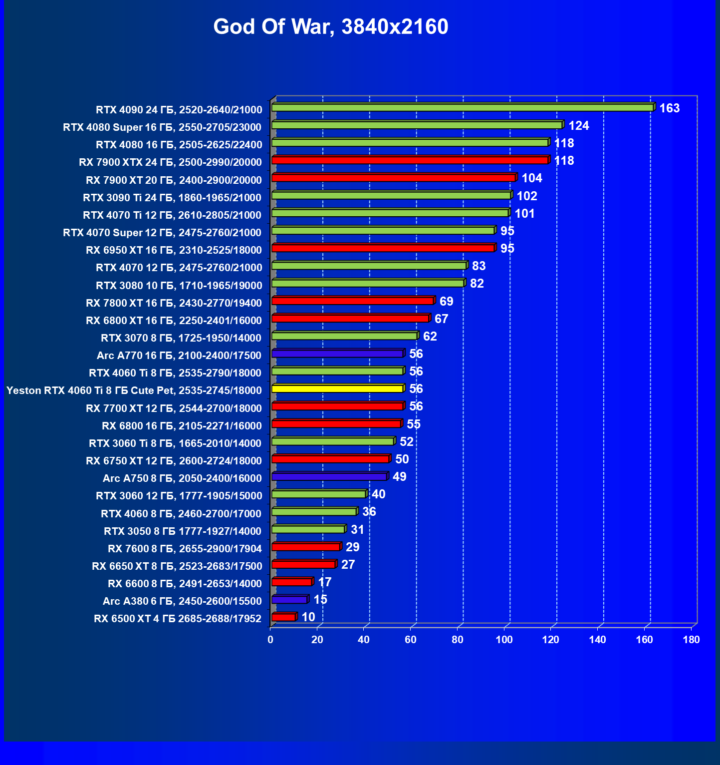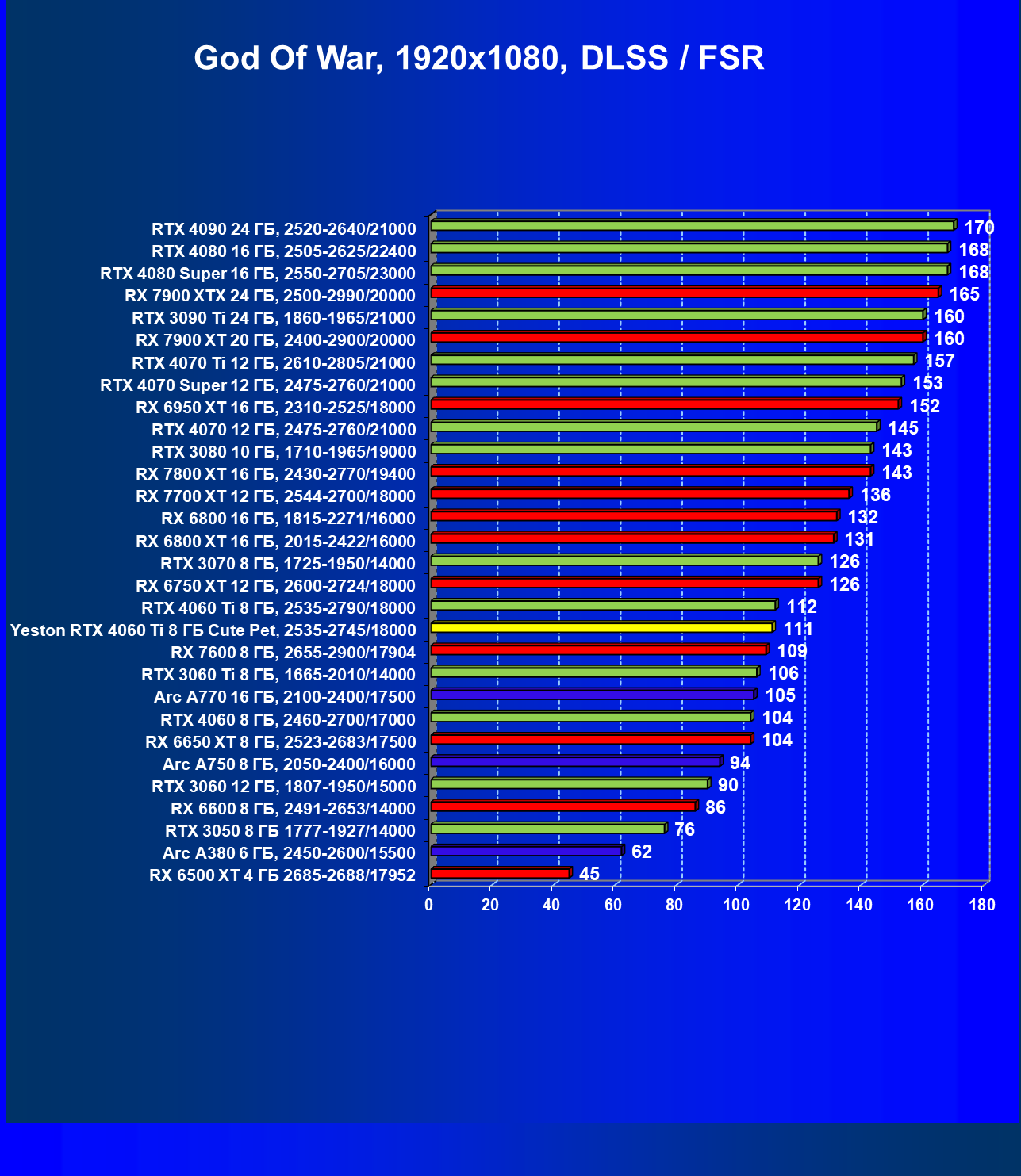За счет того, что GeForce RTX 4060 Ti поддерживает DLSS 3, а у нас в списке тестовых игр имеется уже пять игр с поддержкой этой технологии, карта Yeston вышла в лидеры (да и базовая GeForce RTX 4060 Ti тоже).