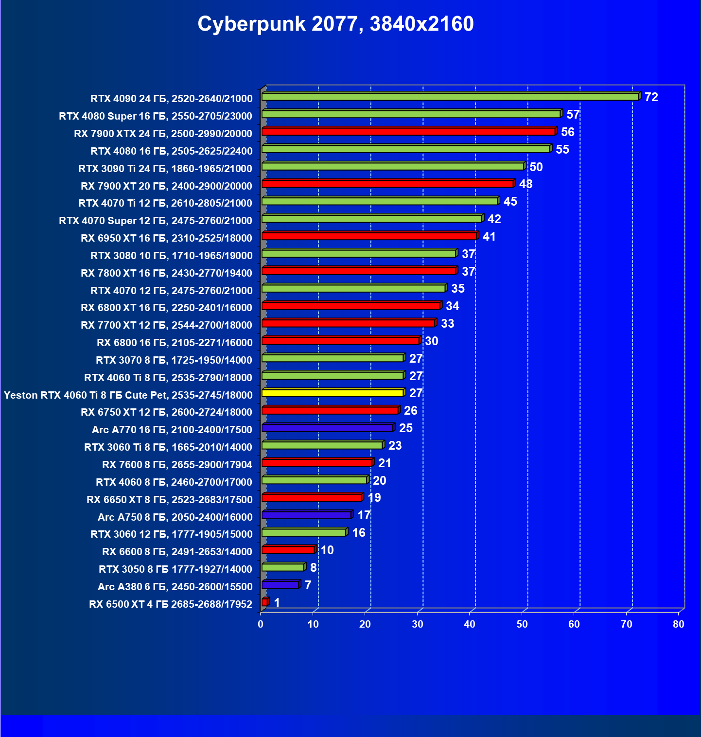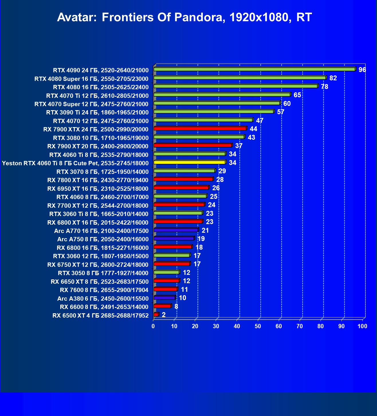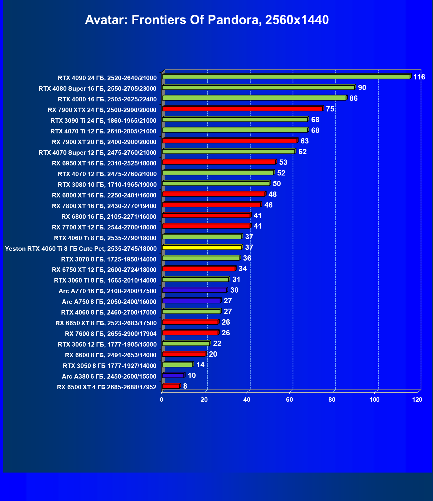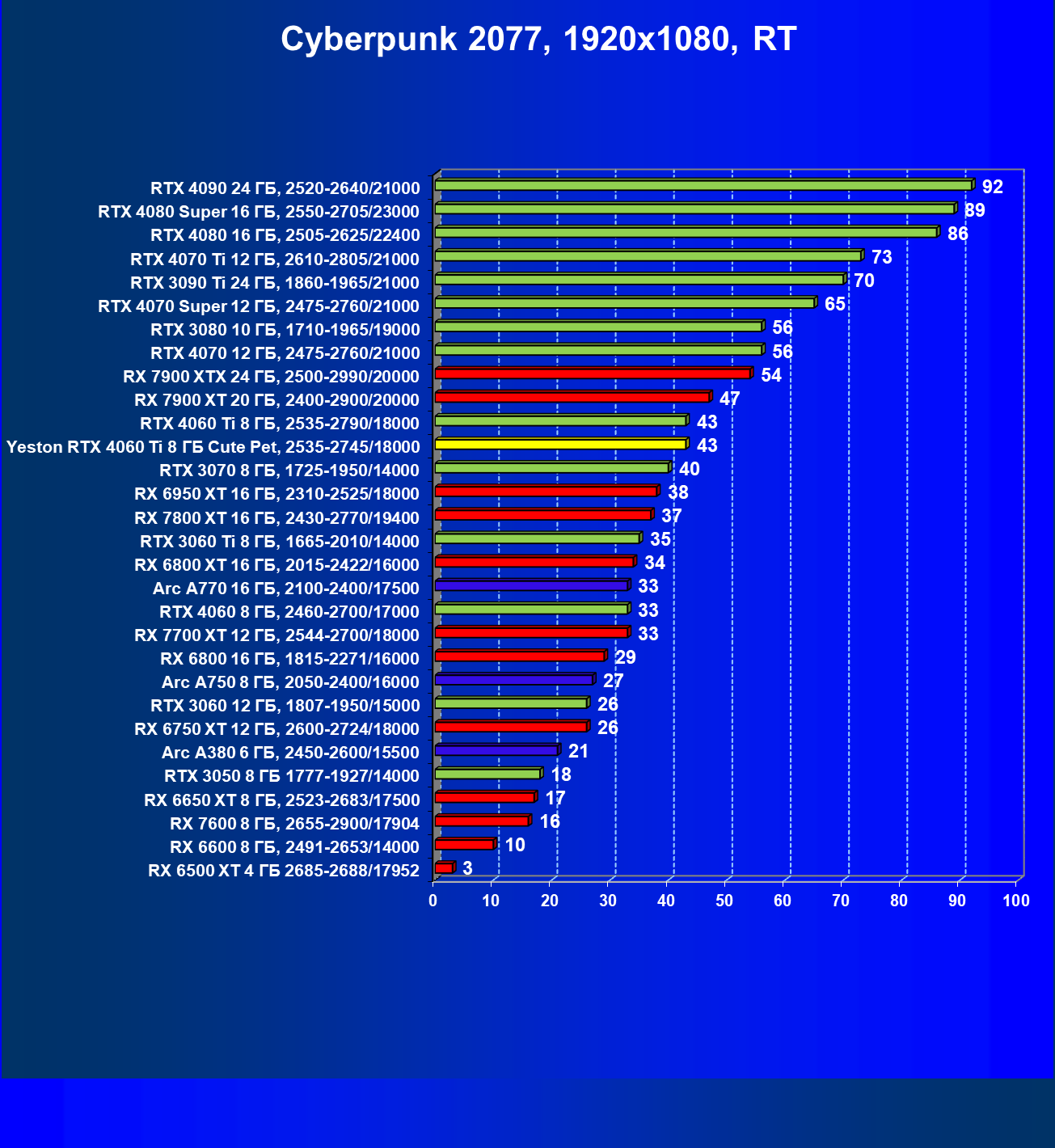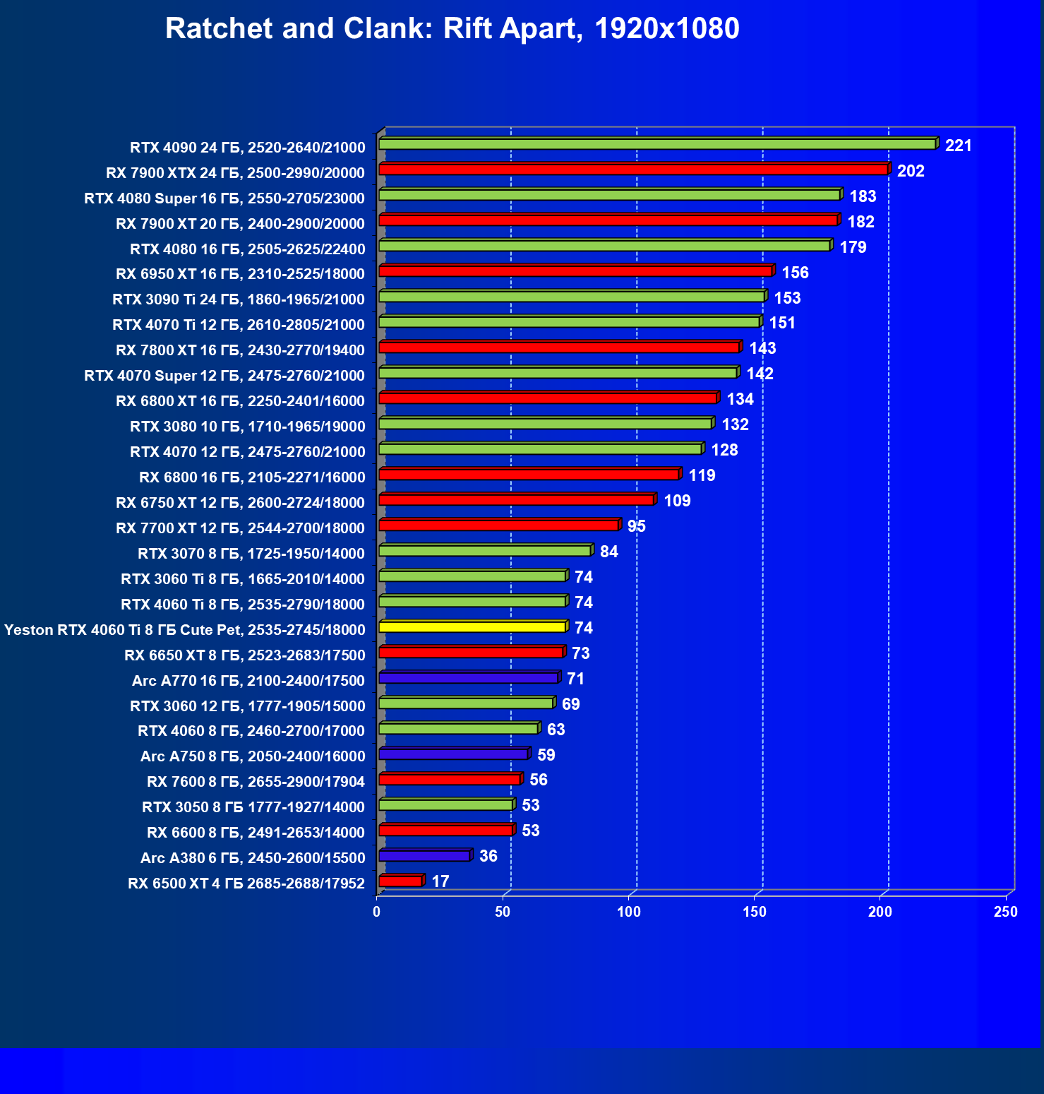 | 12 | Yeston RTX 4060 Ti 8 ГБ Cute Pet, 2535—2745/18000 | 973 | 243 | 40 000 |