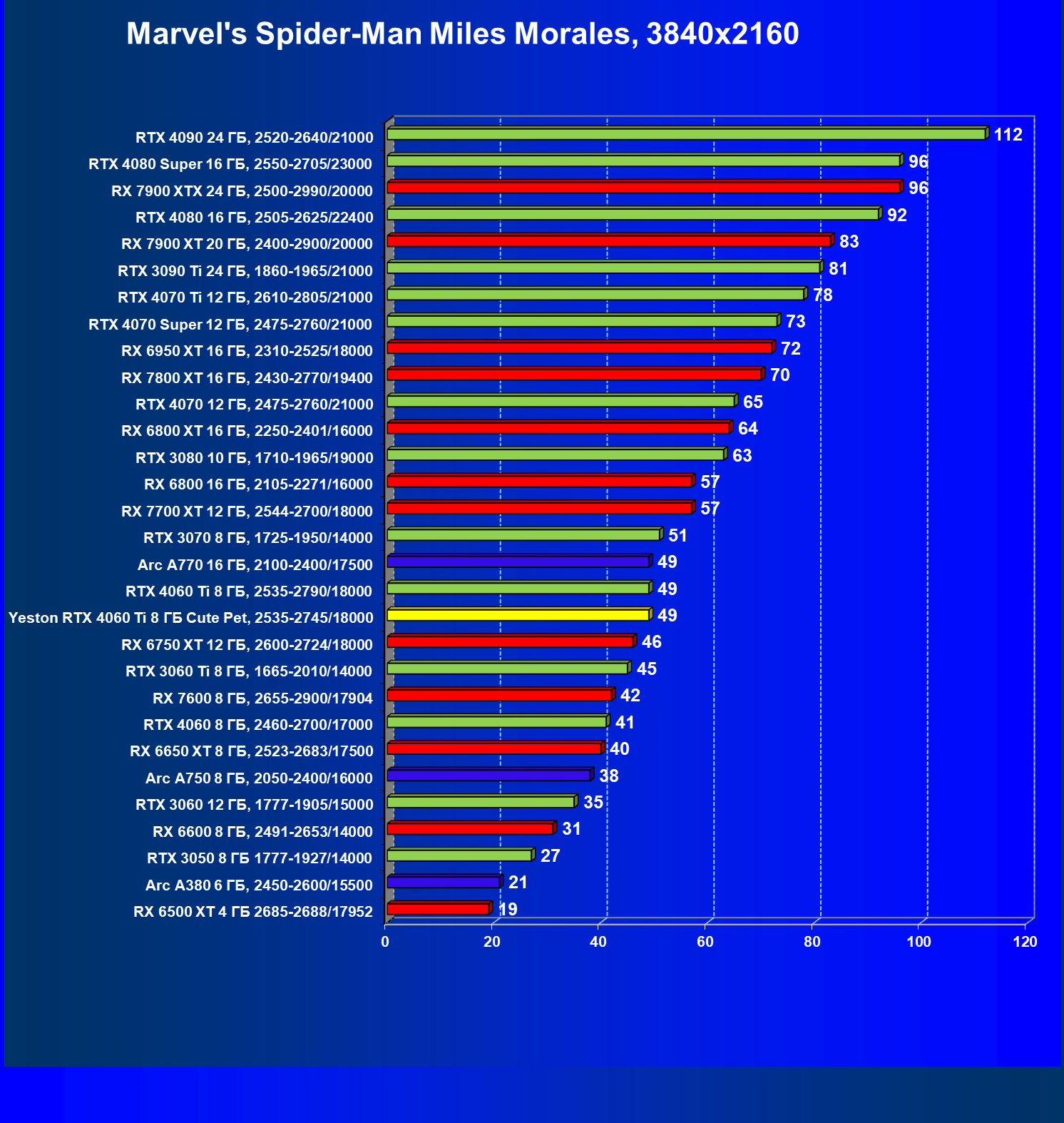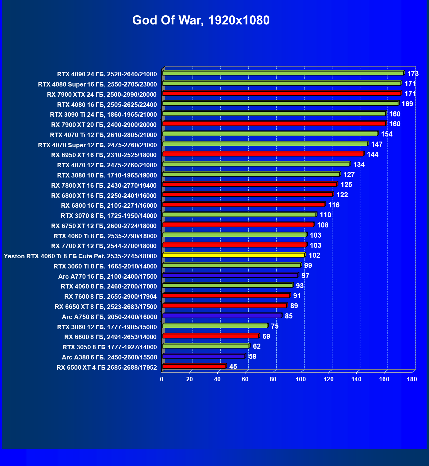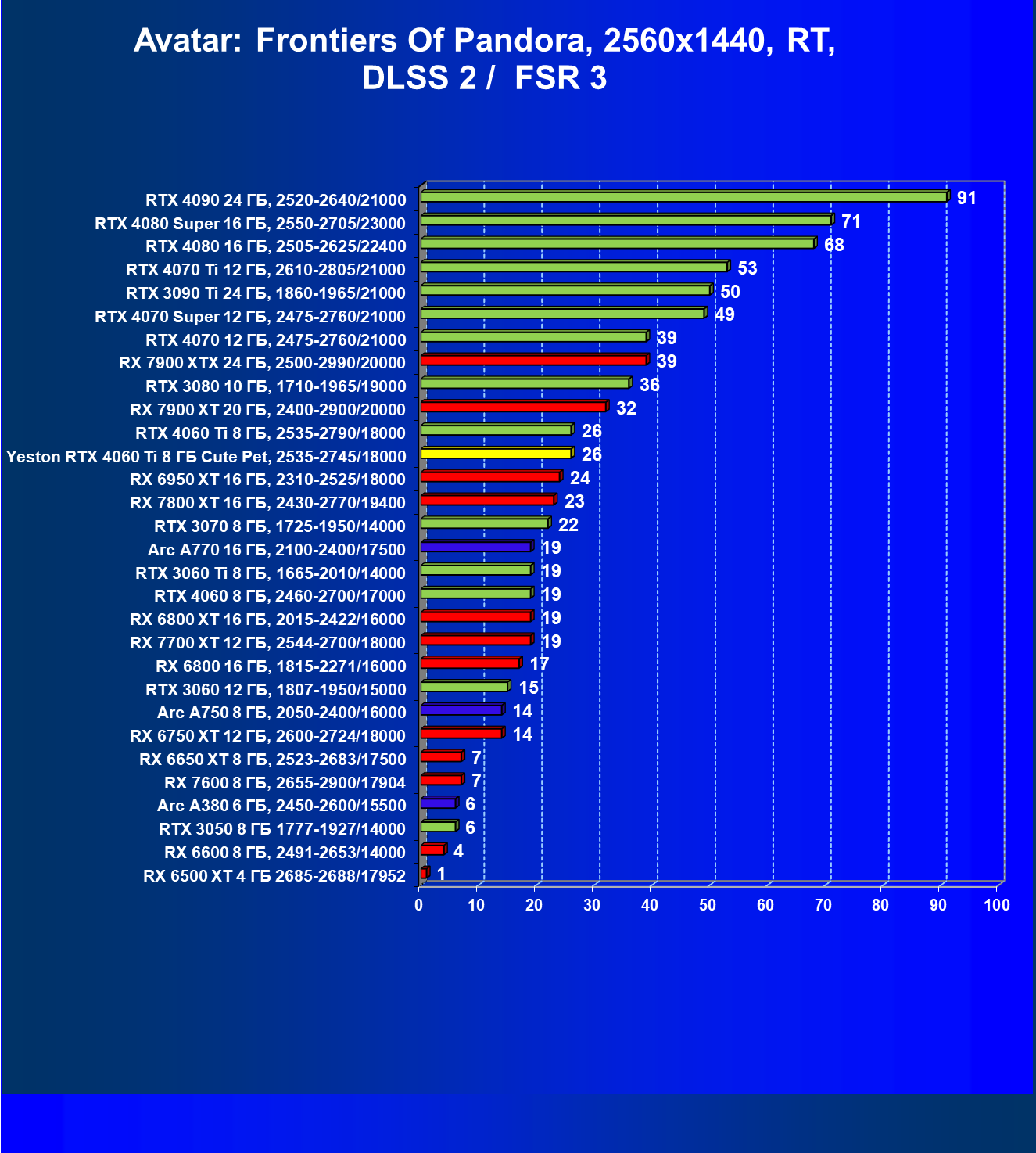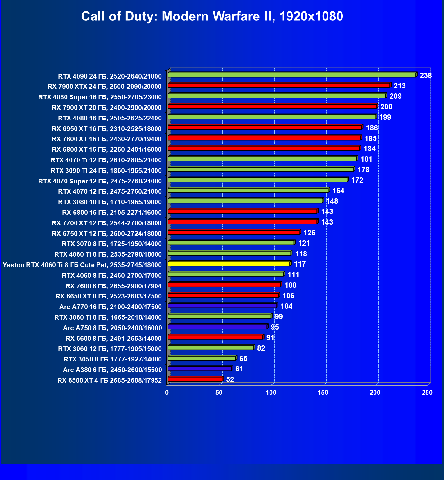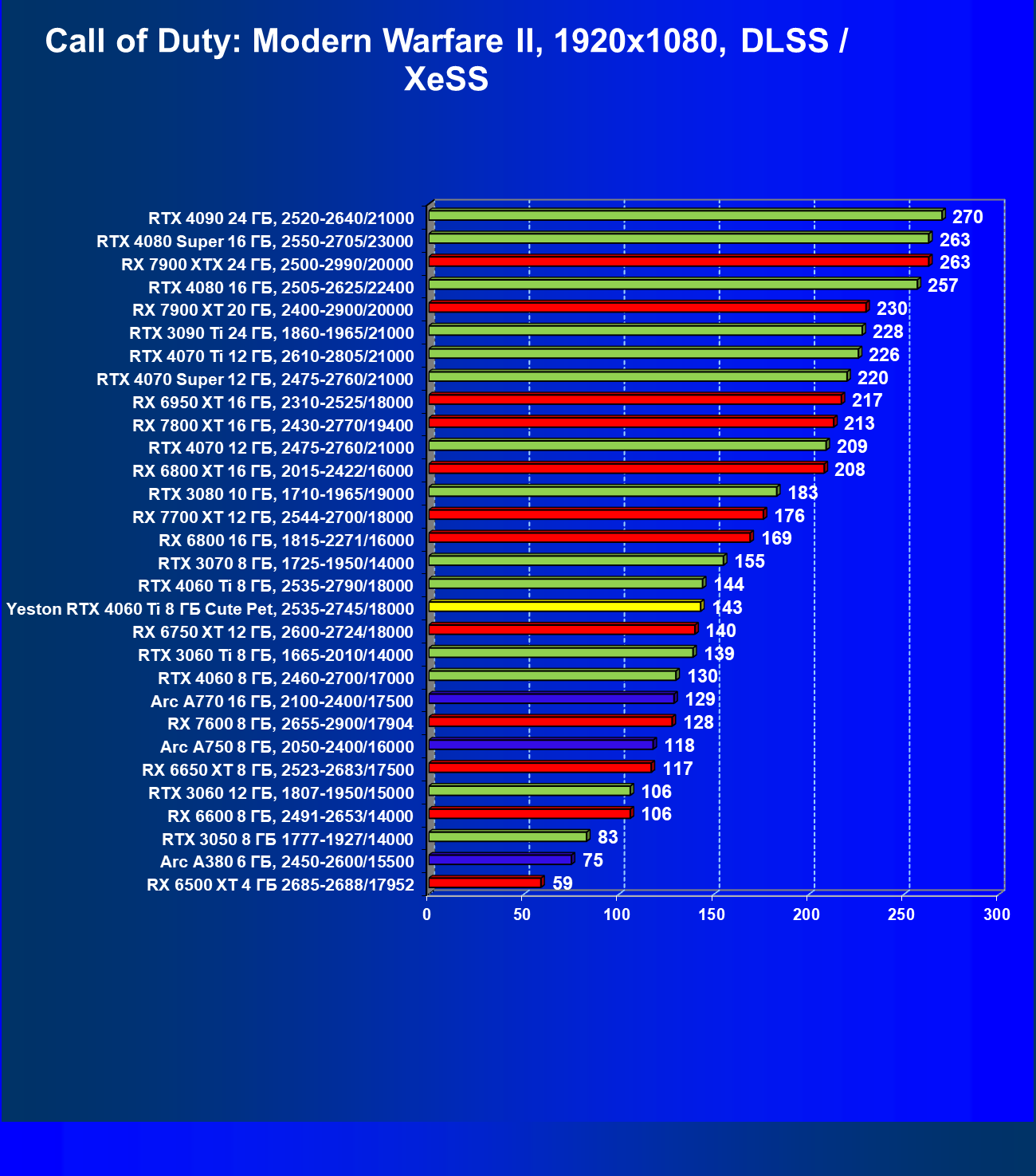| 12 | Yeston RTX 4060 Ti 8 ГБ Cute Pet, 2535—2745/18000 | 973 | 243 | 40 000 |