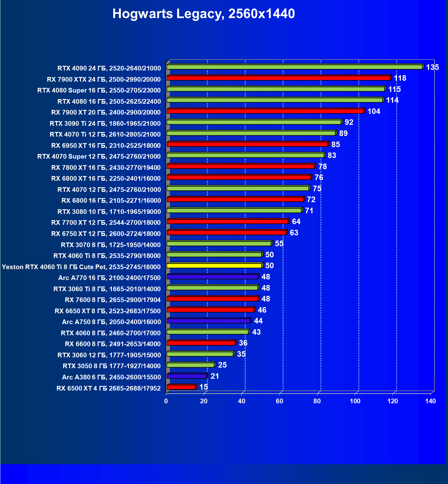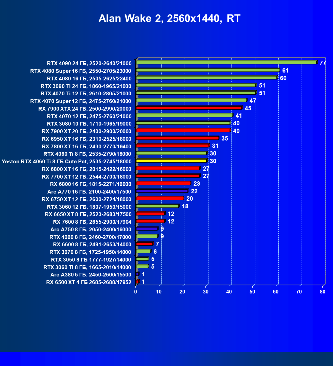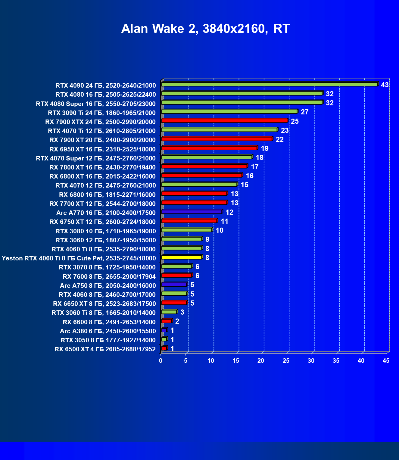 | 05 | Arc A770 16 ГБ, 2100—2400/17500 | 212 | 677 | 32 000 |