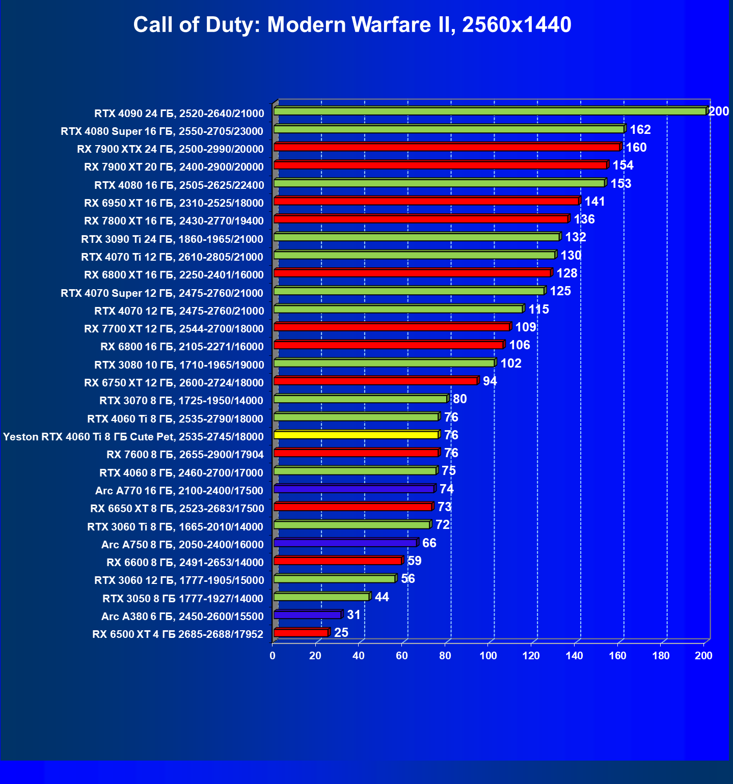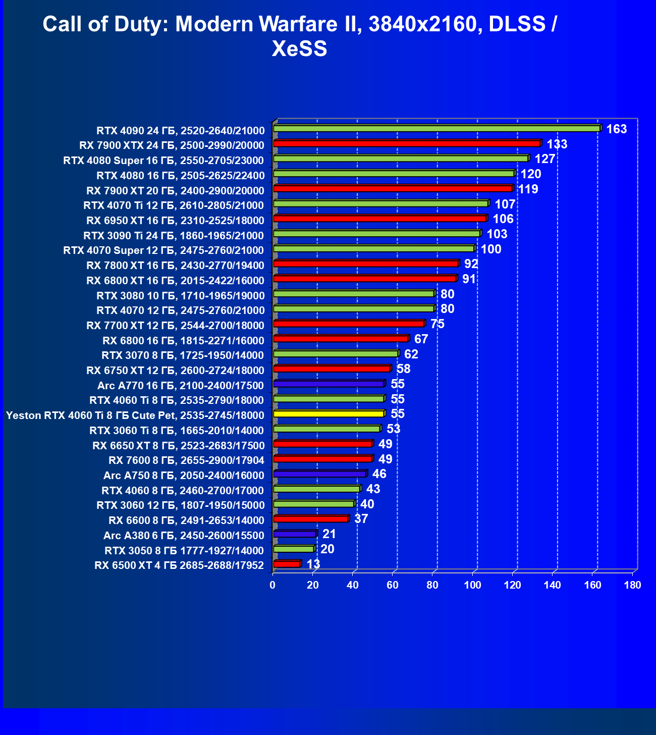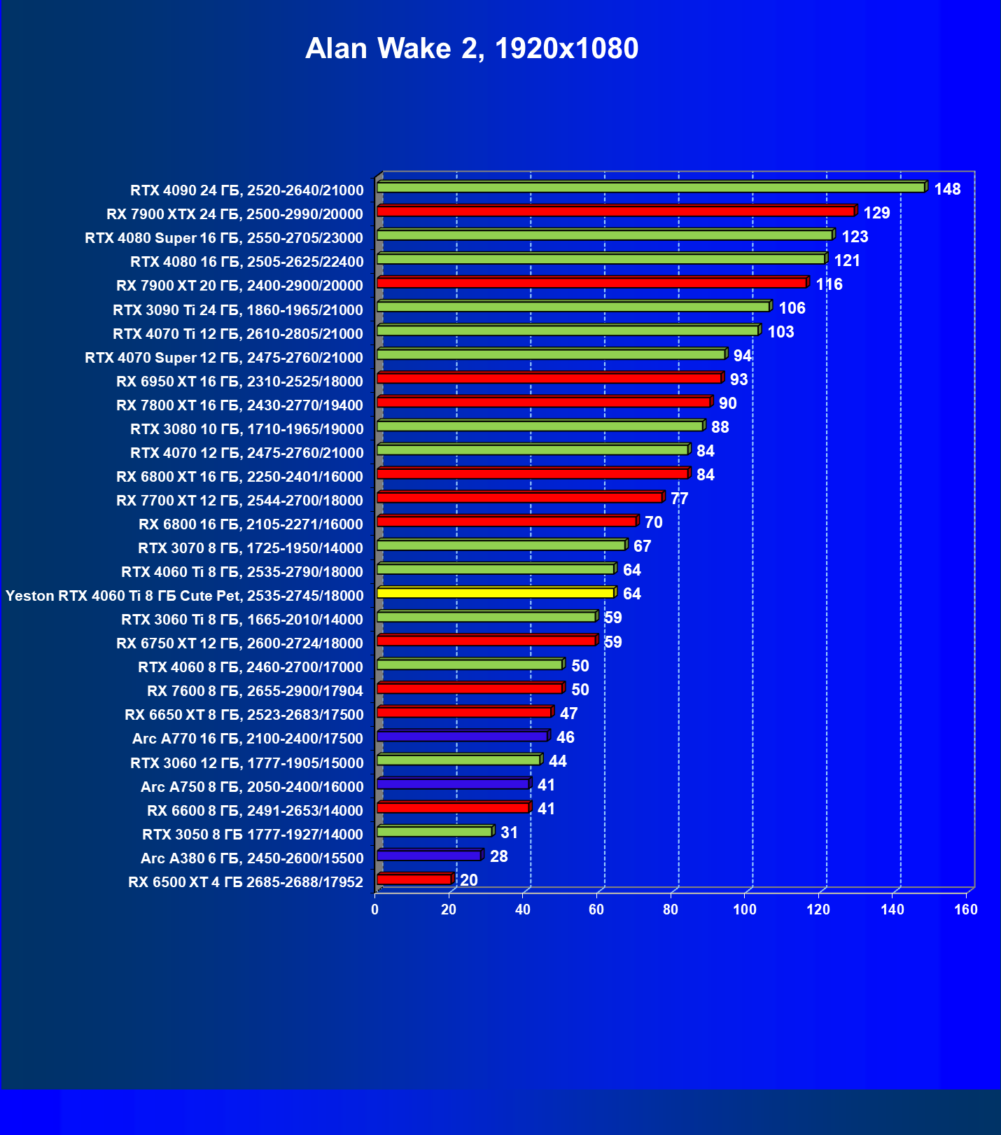 | 05 | Arc A770 16 ГБ, 2100—2400/17500 | 212 | 677 | 32 000 |