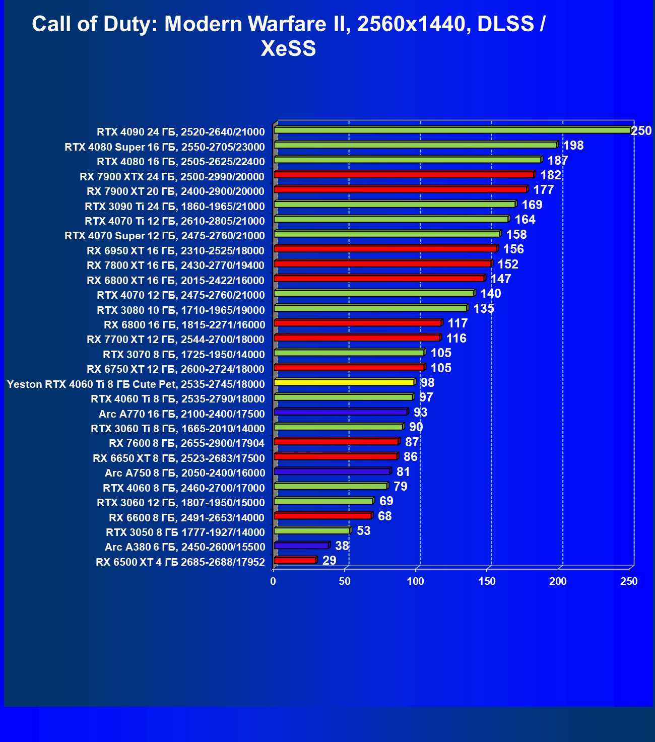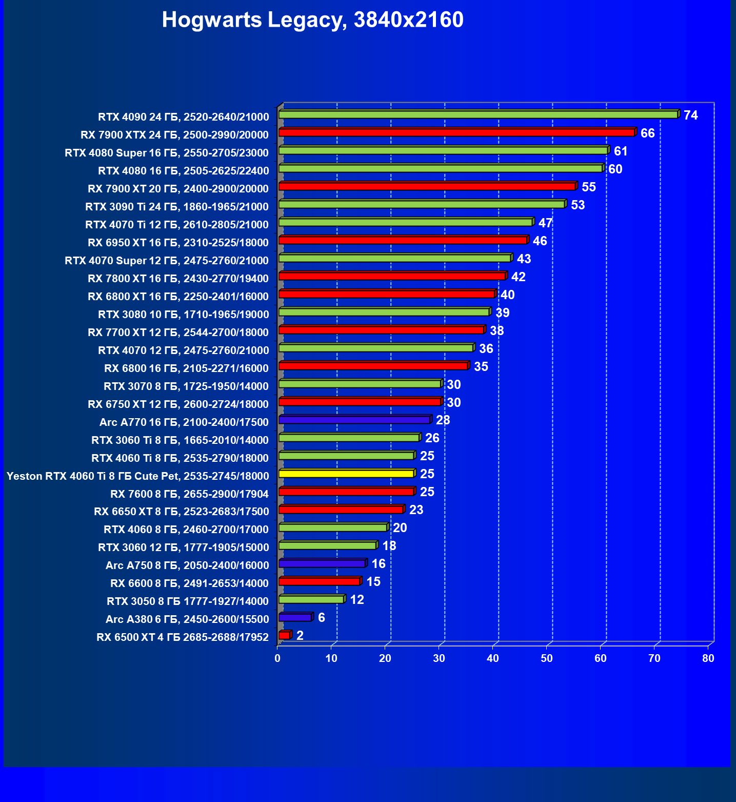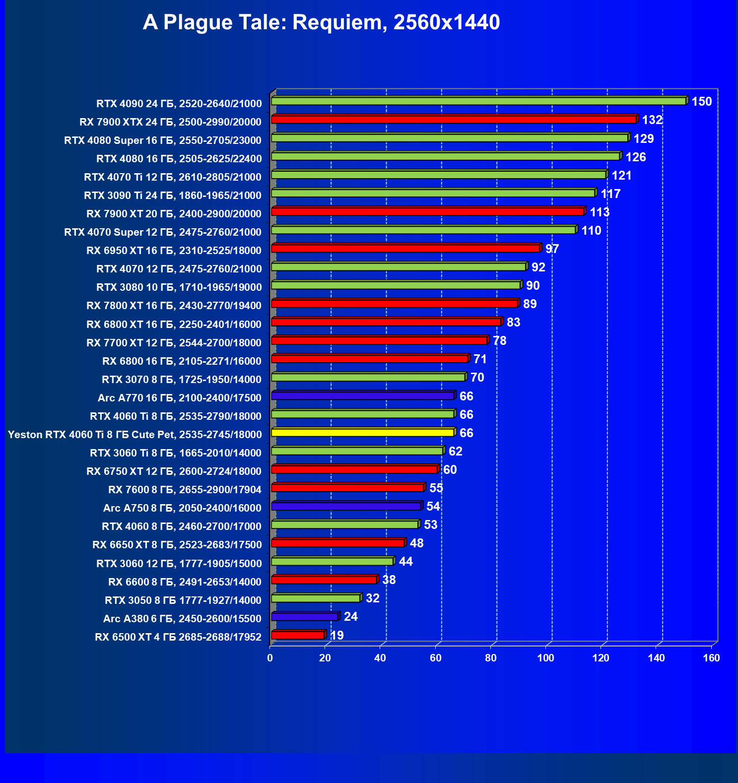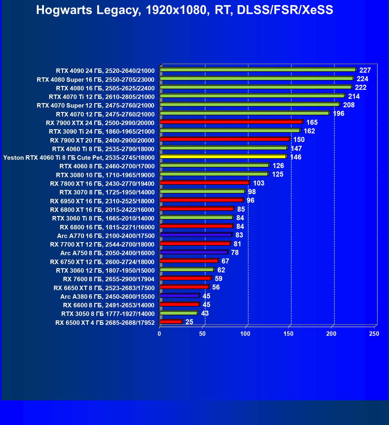 | 20 | Arc A770 16 ГБ, 2100—2400/17500 | 677 | 212 | 32 000 |