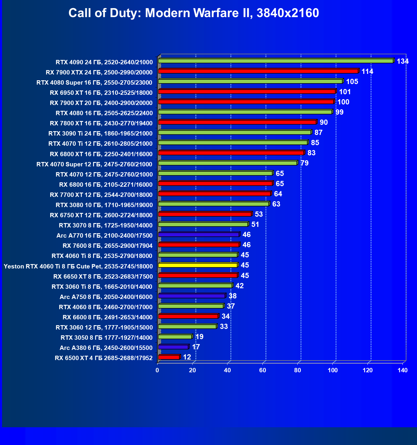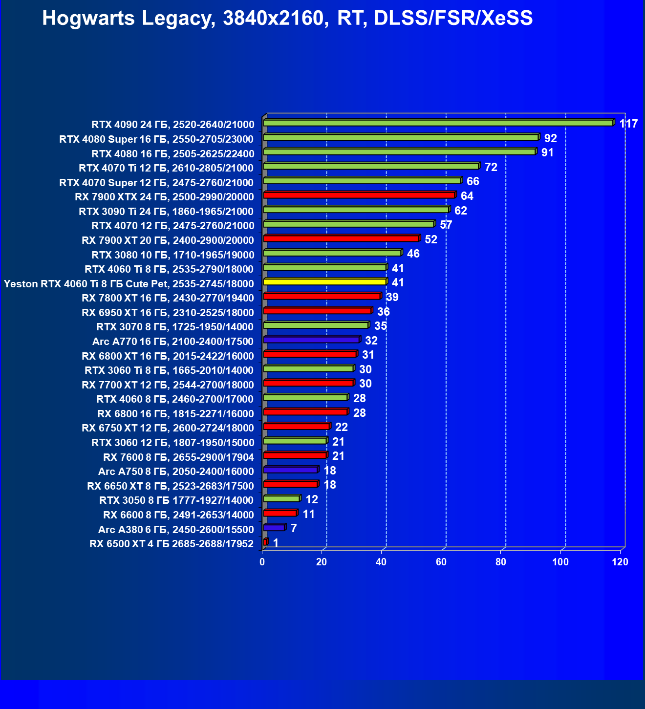 | 20 | Arc A770 16 ГБ, 2100—2400/17500 | 391 | 122 | 32 000 |