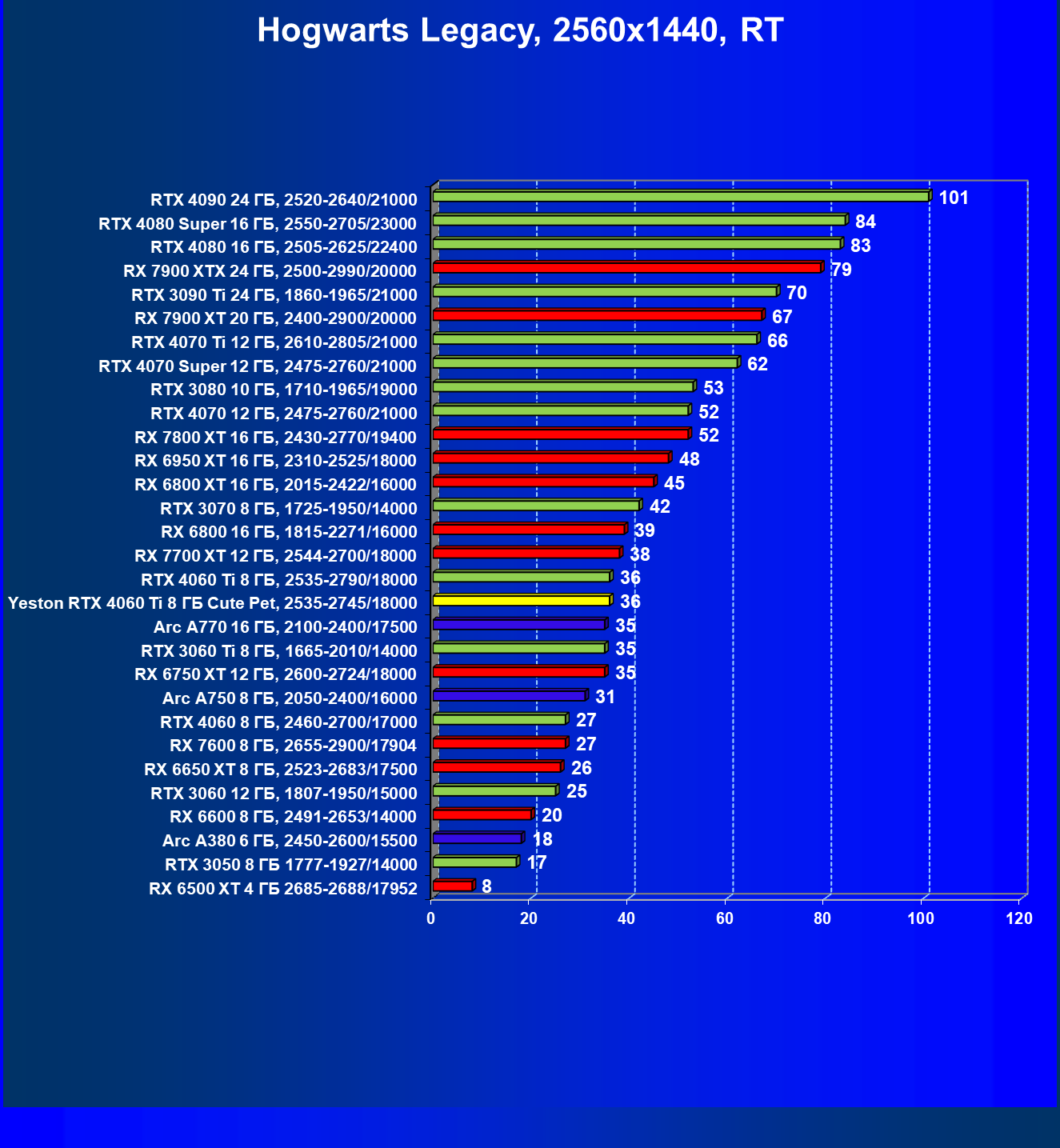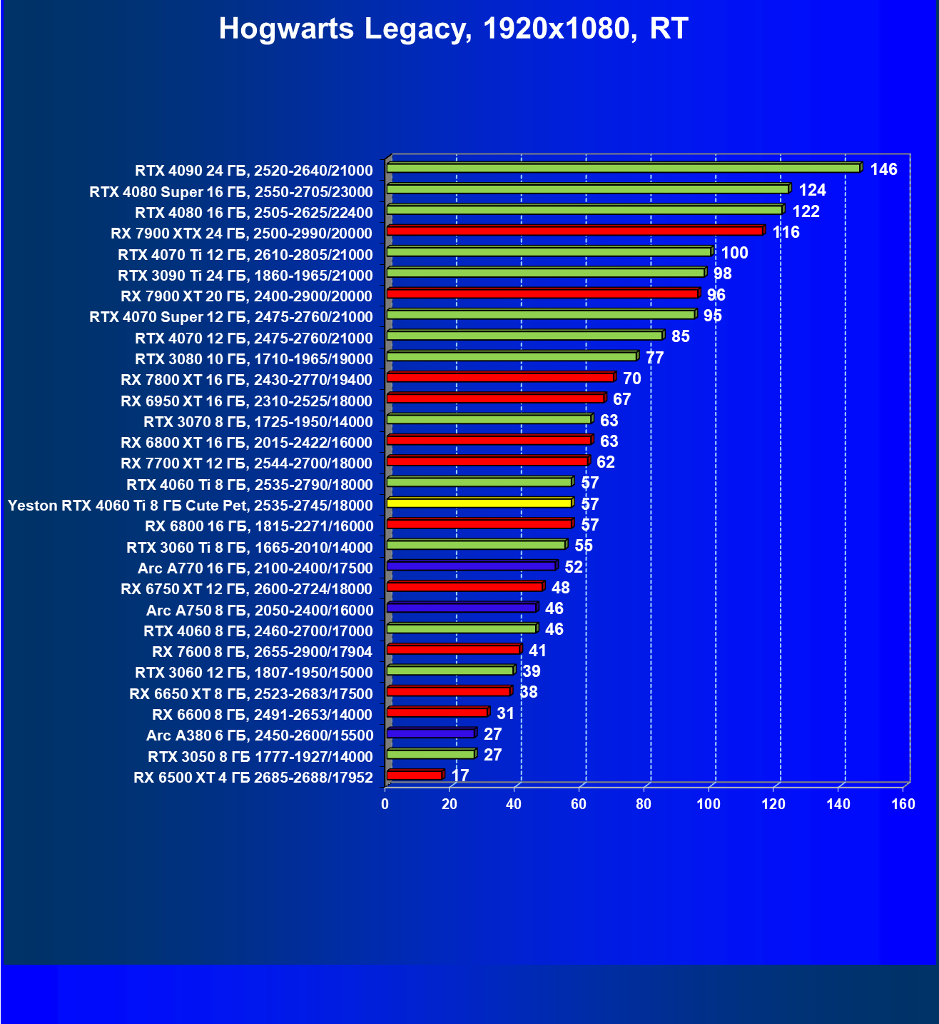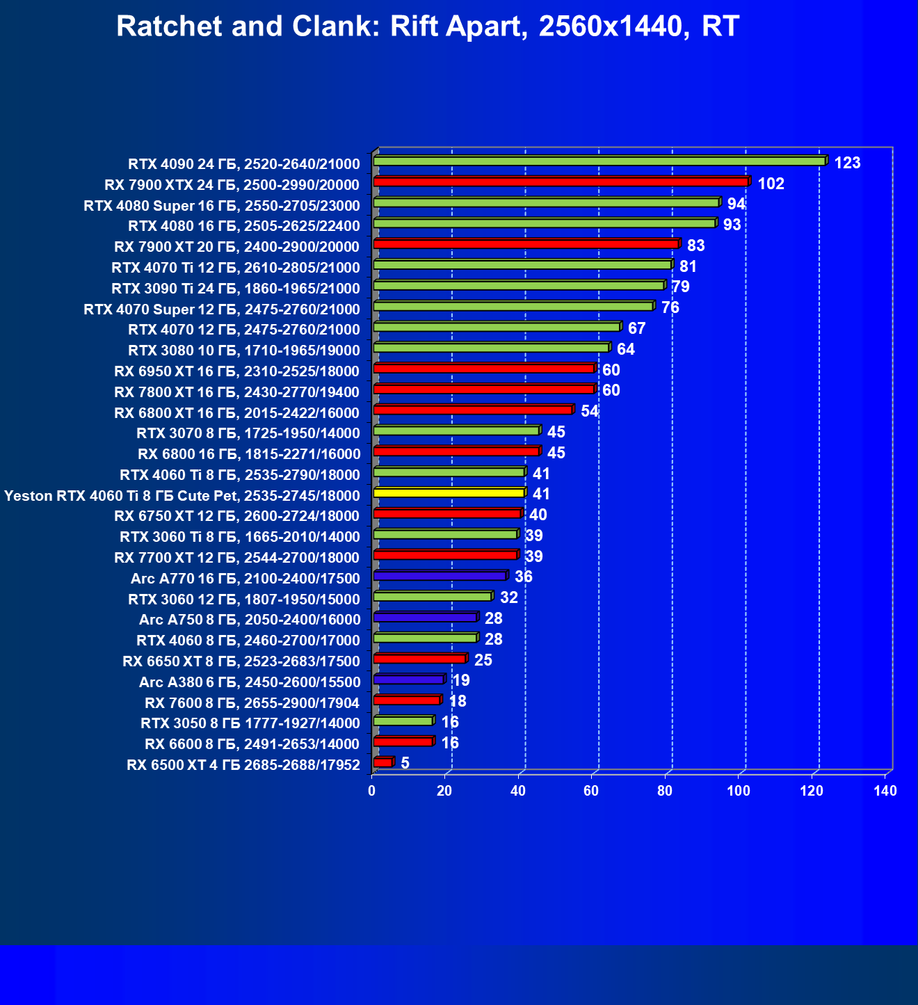 | 01 | Arc A770 16 ГБ, 2100—2400/17500 | 122 | 391 | 32 000 |
