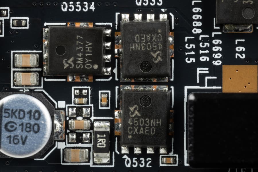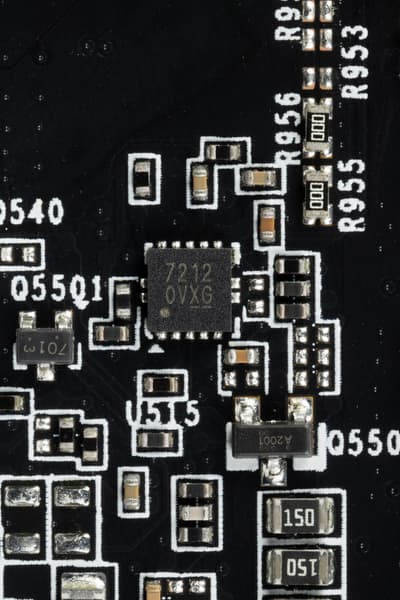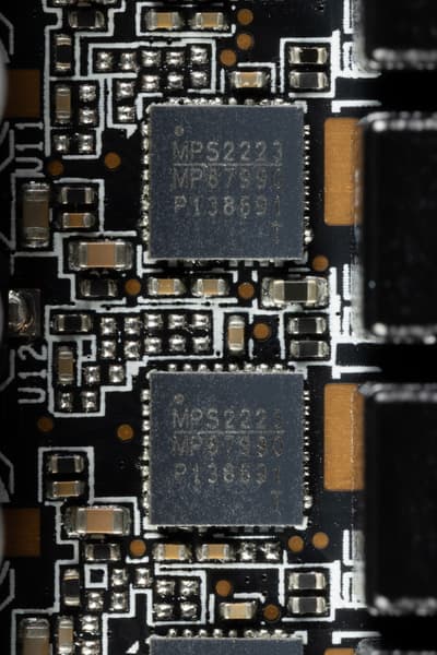 В преобразователе питания ядра используются транзисторные сборки DrMOS — в данном случае MP87990 (Monolith Power Systems), каждая из которых рассчитана максимально на 70 А.