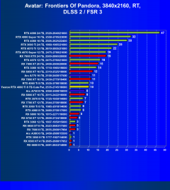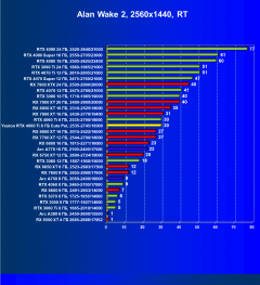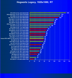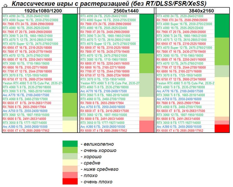 Карты Radeon в данном наборе тестов проявляют себя гораздо хуже из-за меньшей производительности в играх с RT, а GeForce RTX 30 чуть проседают из-за отсутствия поддержки DLSS 3, так что GeForce RTX 4060 Ti вышел в лидеры.