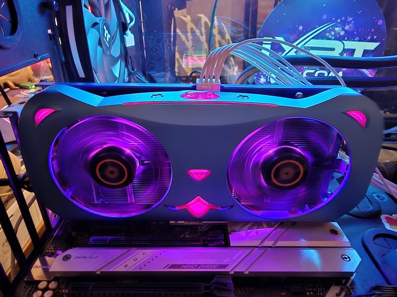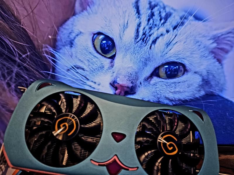 У карты подсвечиваются вентиляторы, а также акриловые вставки на кожухе СО, обозначающие «рот», «нос» и «уши» кота.