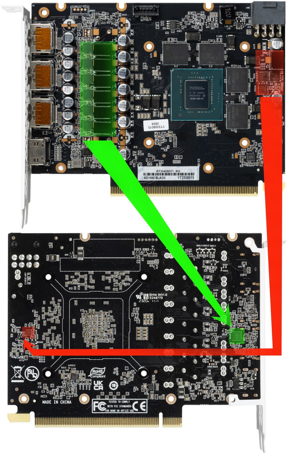 Зеленым цветом отмечена схема питания ядра, красным — памяти. Все ШИМ-контроллеры расположены на оборотной стороне PCB.