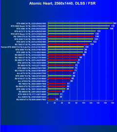 Рейтинг составлен по 9 тестам, в которых используется технология трассировки лучей и одновременно технология Nvidia DLSS, AMD FSR или Intel XeSS. Этот рейтинг нормирован по самому слабому ускорителю в данной группе — Radeon RX 6500 XT (то есть сочетание скорости и функций Radeon RX 6500 XT приняты за 100%).