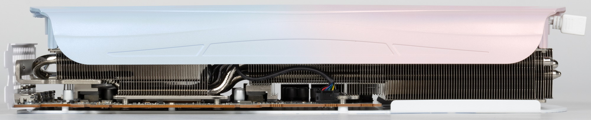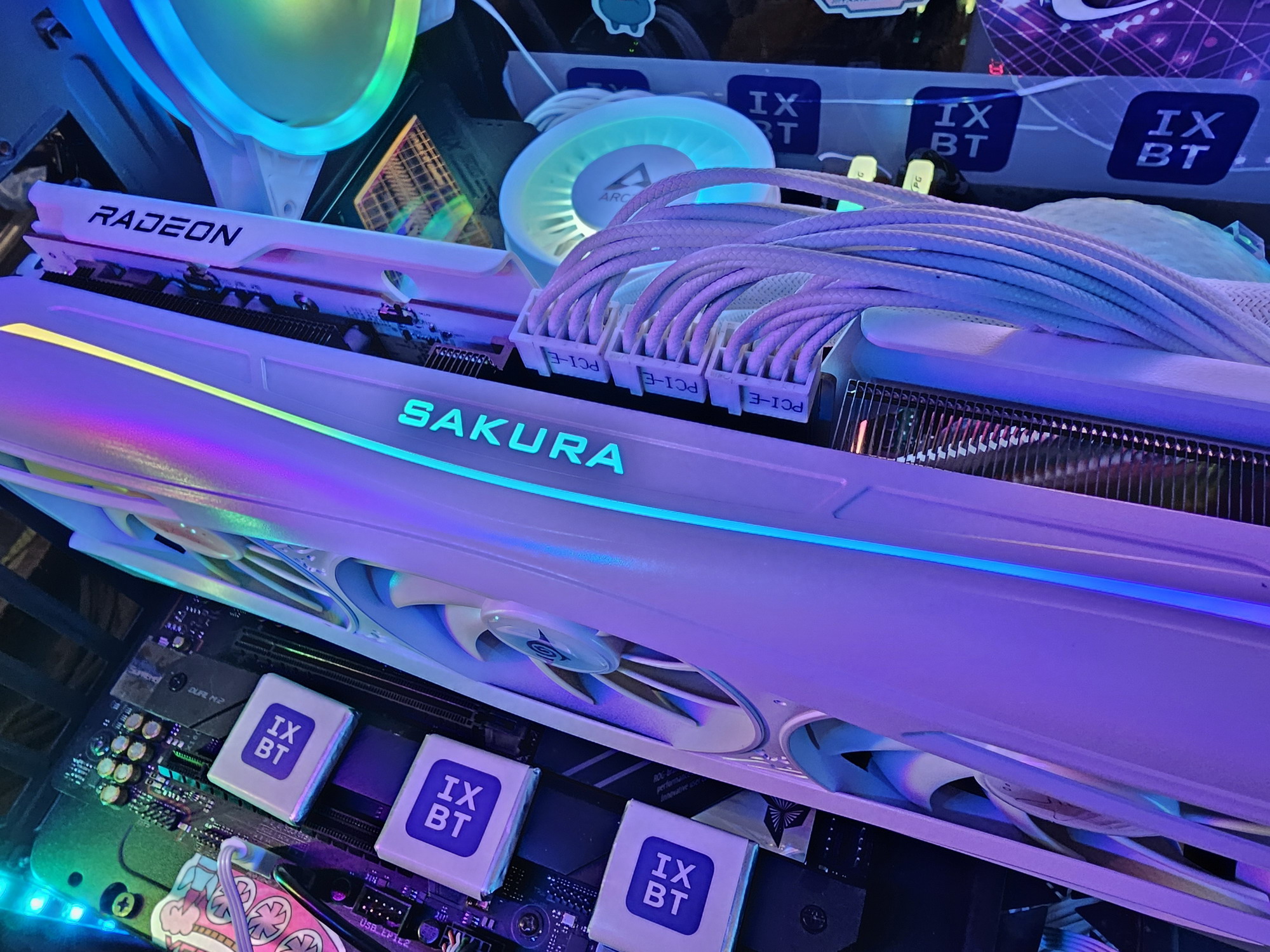 Ну и наконец нельзя не сказать еще раз про оригинальный дизайн самой карты в бело-розово-голубых тонах, при этом печатная плата — белого цвета (впрочем, ее почти не видно под кулером). Карта может отлично подойти для сборки ПК в подобных цветах, особенно с акцентом на китайские аниме. Опять же, карта распространяет внутри корпуса аромат, который разносится вентиляторами. Аромат не стойкий, по ароматизатор многоразового использования.