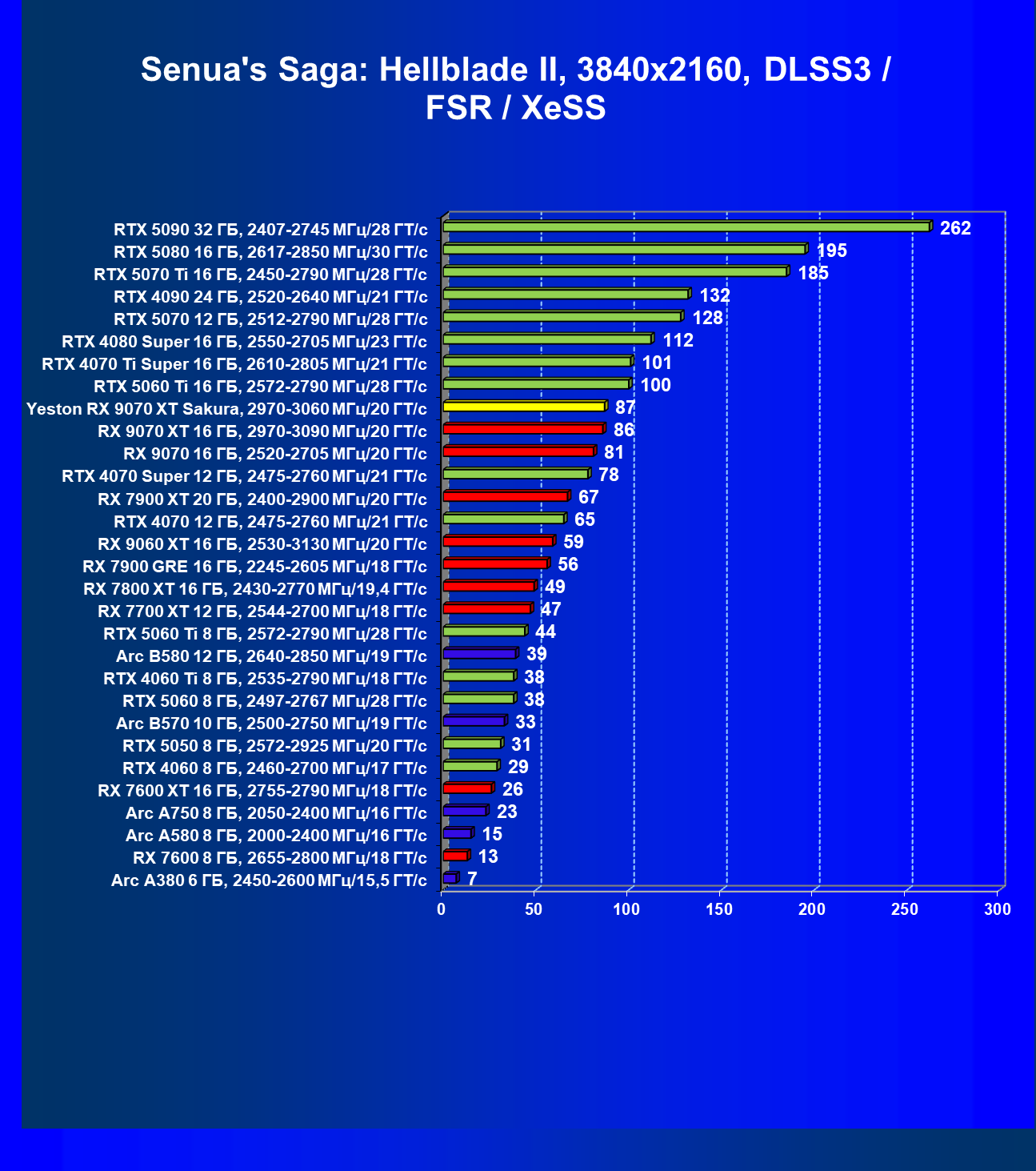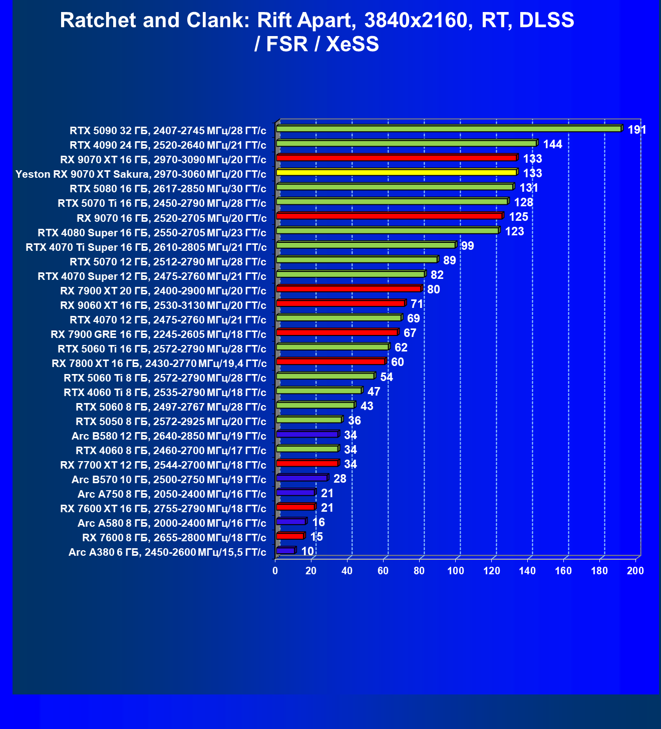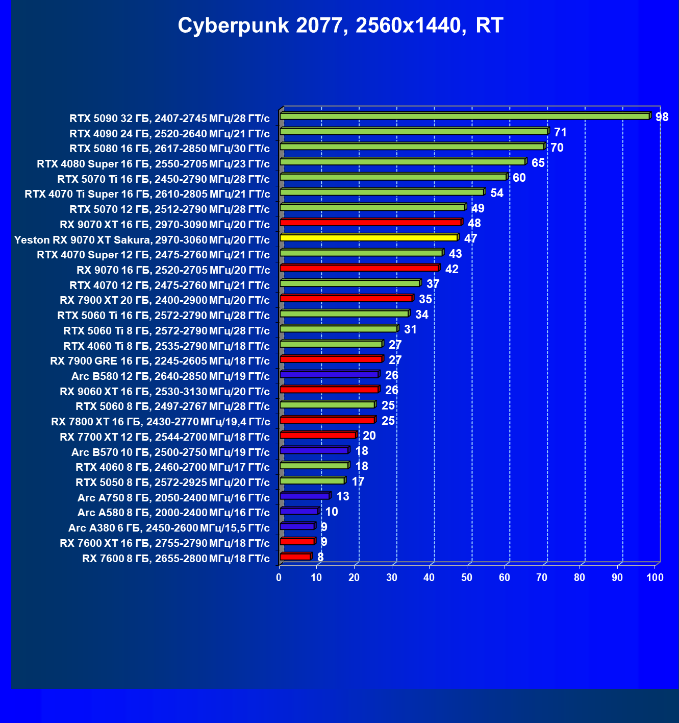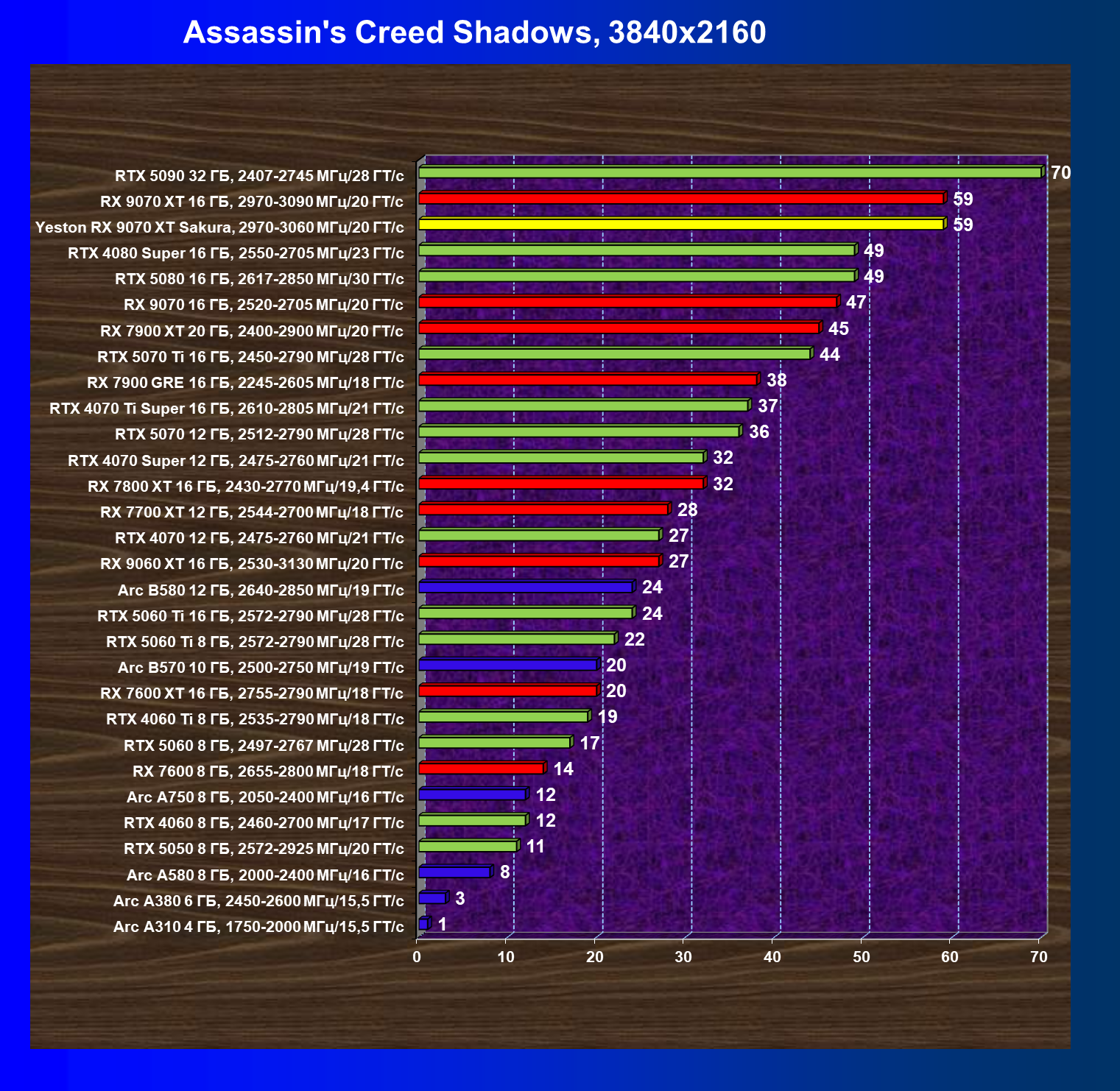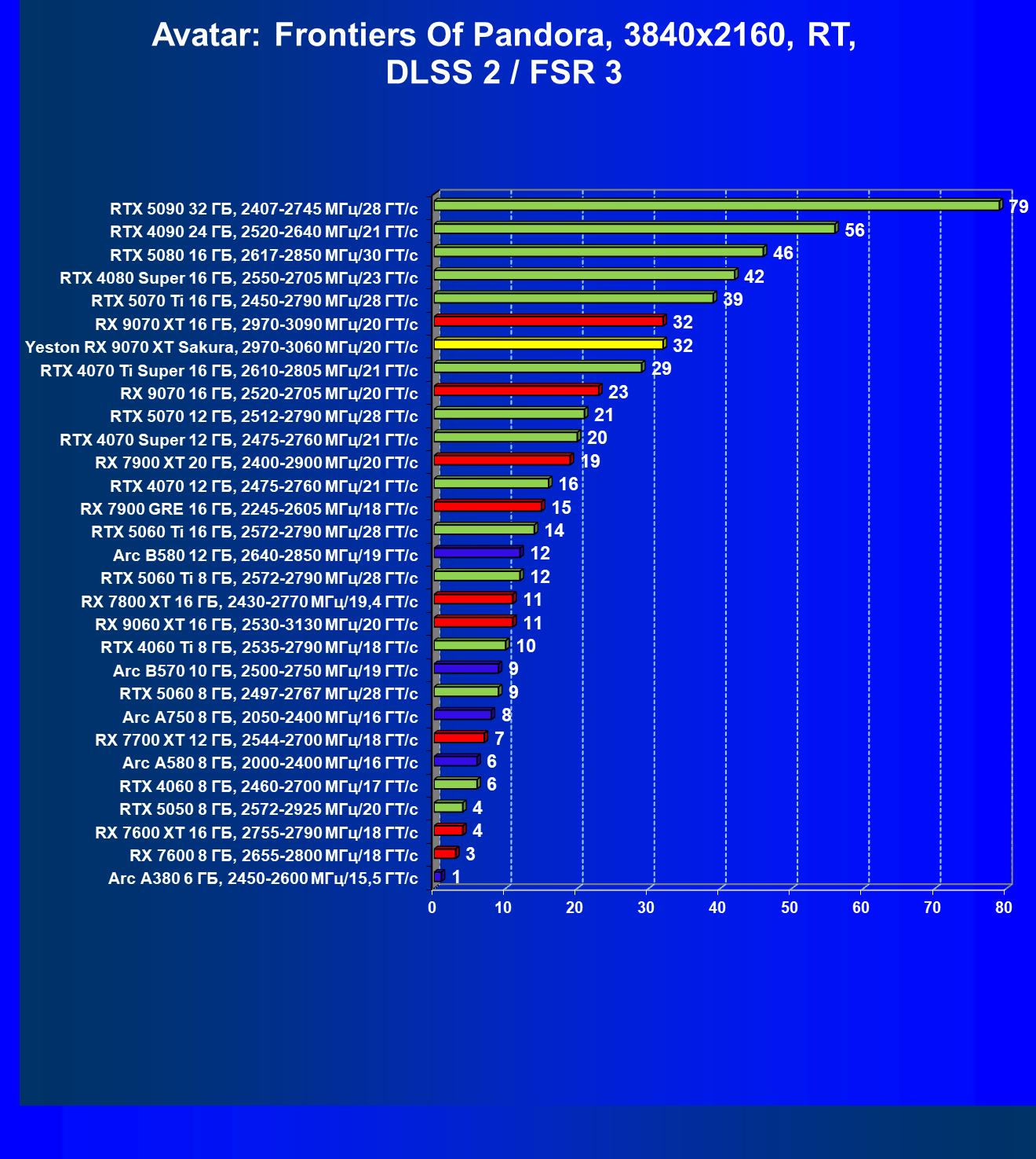 | 07 | Yeston RX 9070 XT Sakura, 2970—3060 МГц/20 ГТ/с | 5000 | 649 | 77 000 |