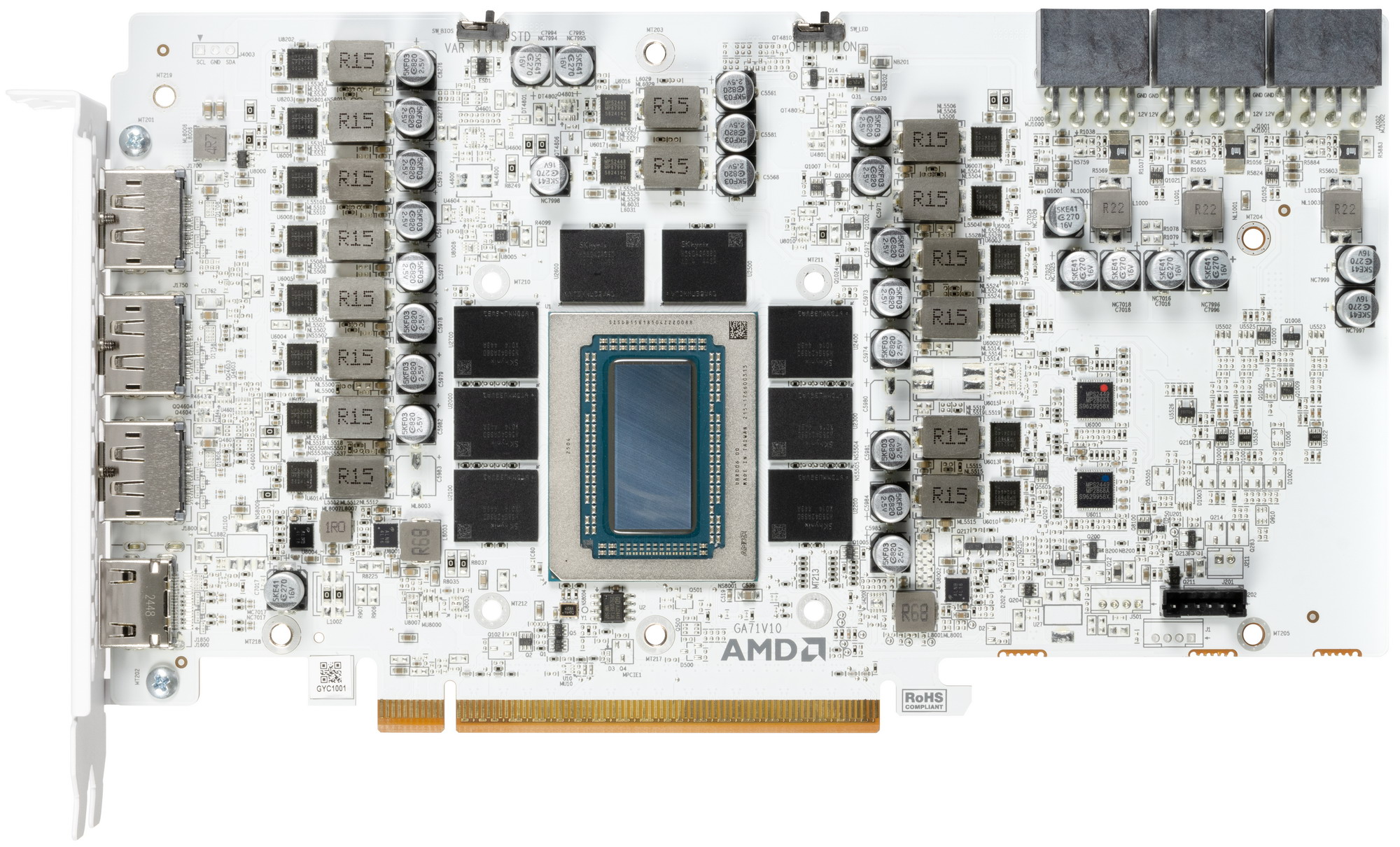 Карта имеет два режима работы, они заложены в двух вариантах BIOS, которые переключаются с помощью переключателя на переднем торце карты: VAR (производительный) и STD (стандартный). Ранее мы наблюдали, что так называемый «производительный» режим получается с помощью повышения частот работы GPU, а стандартный — по сути референсные частоты работы. В данном же случае режим VAR — это по сути аналог референсной карты по частотам работы, а STD — чуть сниженная частота работы ядра. Зачем так сделано — малопонятно. Предел энергопотребления в обоих случаях составляет 350 Вт.