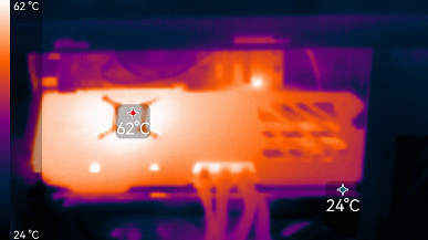 После прогона под нагрузкой максимальная температура ядра не превысила 62 градусов (hot spot — 91 °C), а микросхем памяти — 85 градусов, что также является хорошим результатом. Энергопотребление карты доходило до 304 Вт.