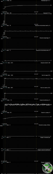 В режиме максимальной нагрузки в 3D температура достигала 63 °C. Вентилятор при этом раскручивался до 68%, а шум вырастал до 35,4 дБА, так что шум у данной СО повышенный, но еще не раздражающий. В данном случае рекомендуем использовать утилиту Fire Storm для фиксации частоты вращения вентиляторов на более низком уровне, поскольку имеется значительный резерв по нагреву, вполне можно позволить температуре GPU подниматься и до, скажем, 70 градусов.