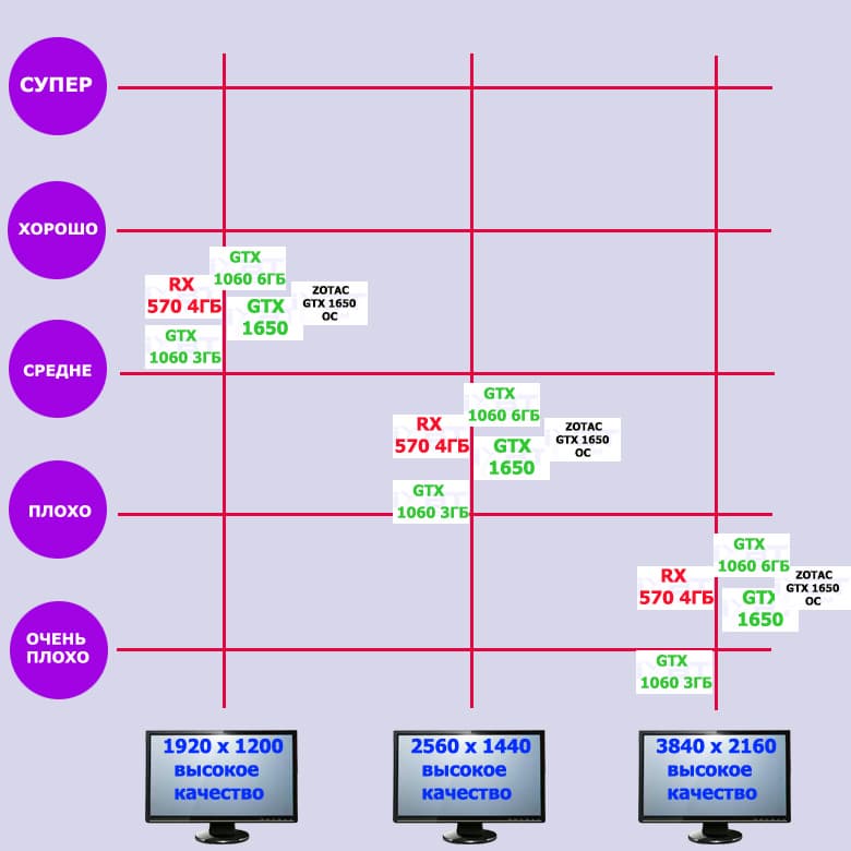 Видеоускоритель Nvidia GeForce GTX 1650 вышел недавно (мы подготовили по нему базовый материал) и позиционируется как решение базового среднего уровня. Его уже нельзя рекомендовать для использования на максимальных настройках качества в играх даже в разрешении Full HD, не говоря о более высоких. Комфортную производительность при максимальном качестве графики GeForce GTX 1650 может обеспечить в лучшем случае в 1680×1050, хотя, конечно, найдутся игры, в которые удастся поиграть с максимальными настройками качества и в Full HD. В целом же для 1920×1080 надо снижать настройки до средних. Из соперников лучше всего выглядит GeForce GTX 1060 6 ГБ, который с высокими настройками качества выдает хорошую скорость в 1920×1200/1080. Radeon RX 570 4 ГБ оказался между GeForce GTX 1650 и GeForce GTX 1060 6 ГБ. А вот GeForce GTX 1060 3 ГБ максимальные настройки качества в Full HD вообще не тянет. Конкретная карта Zotac GTX 1650 чуть быстрее референсной, так что, возможно, она является лучшим кандидатом для покупки — посмотрим в подробном тестировании.
