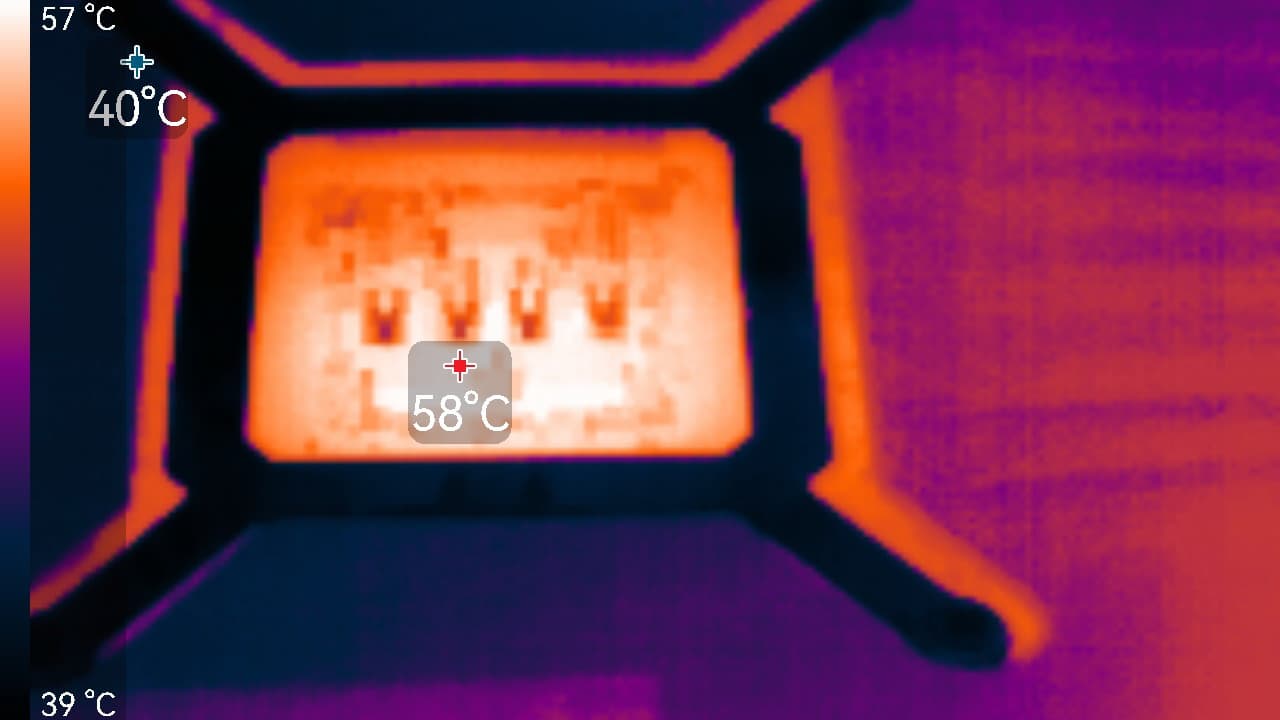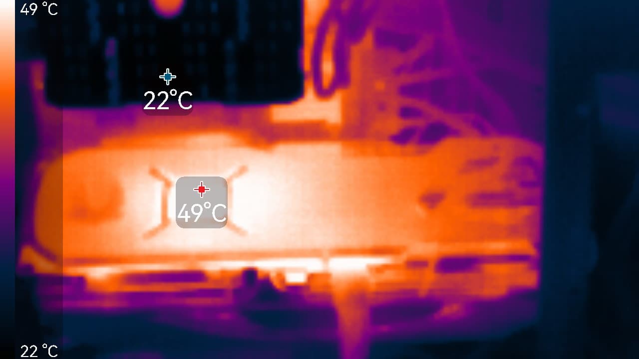 После 2-часового прогона под нагрузкой максимальная температура ядра не превысила 67 градусов (самой горячей точки — 80 °C), а температура микросхем памяти — 60 градусов, что является отличным результатом для видеокарт такого уровня. Энергопотребление карты доходило до 317 Вт. Напомним, что безопасный предел нагрева памяти GDDR6X — 105 °C.