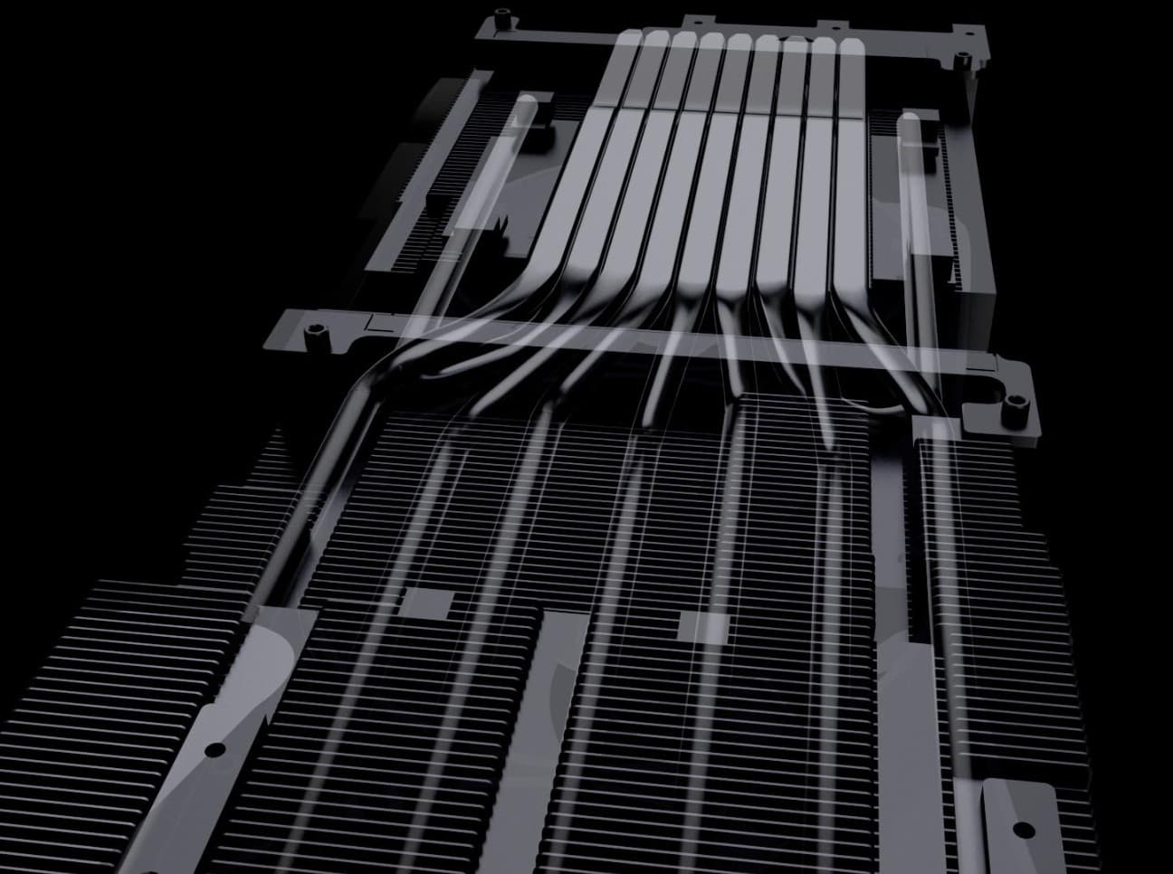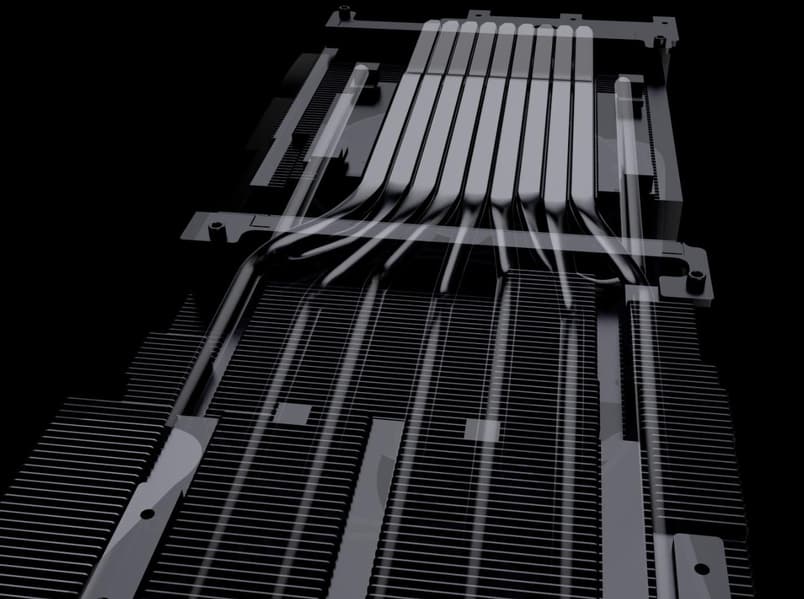 Девять трубок из композитных материалов припаяны к огромному медному никелированному плато, которое охлаждает GPU.