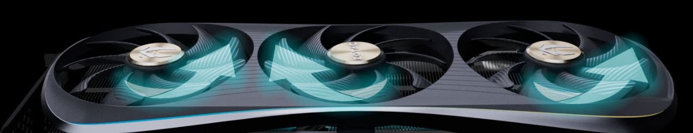 Поверх радиатора установлен кожух с тремя вентиляторами ∅110 мм, у которых имеются рифленые лопасти. Центральный вентилятор вращается в противоположную сторону относительно крайних, что обеспечивает эдакий «эффект шестеренок», помогая бороться с турбулентностью потока воздуха.