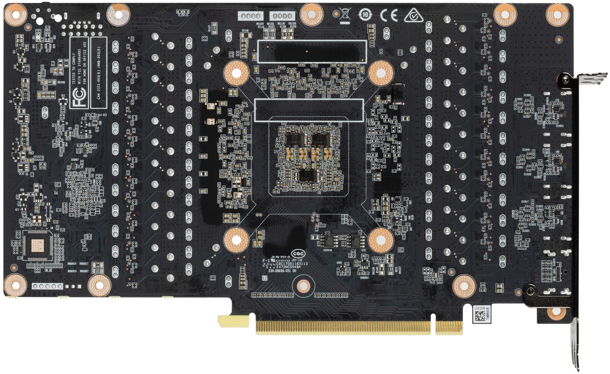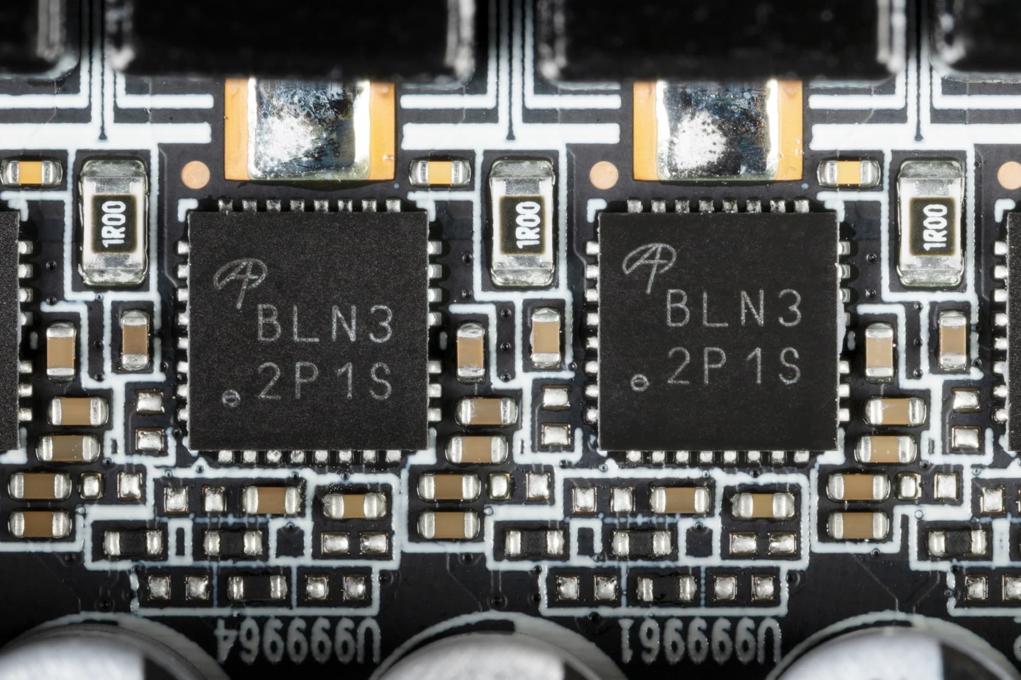 В преобразователе питания, традиционно для всех видеокарт Nvidia, используются транзисторные сборки DrMOS — в данном случае AOZ5316 (Alpha&Omega Semi), каждая из которых рассчитана максимально на 55 А.