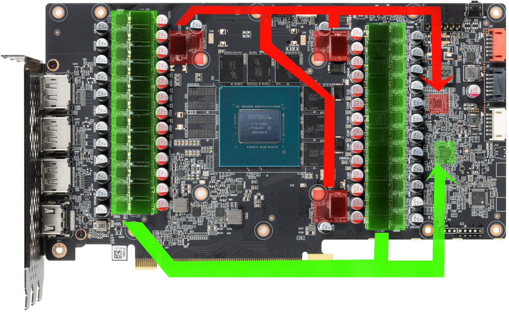 Зеленым цветом отмечена схема питания ядра, красным — памяти. Все контроллеры расположены на лицевой стороне PCB.