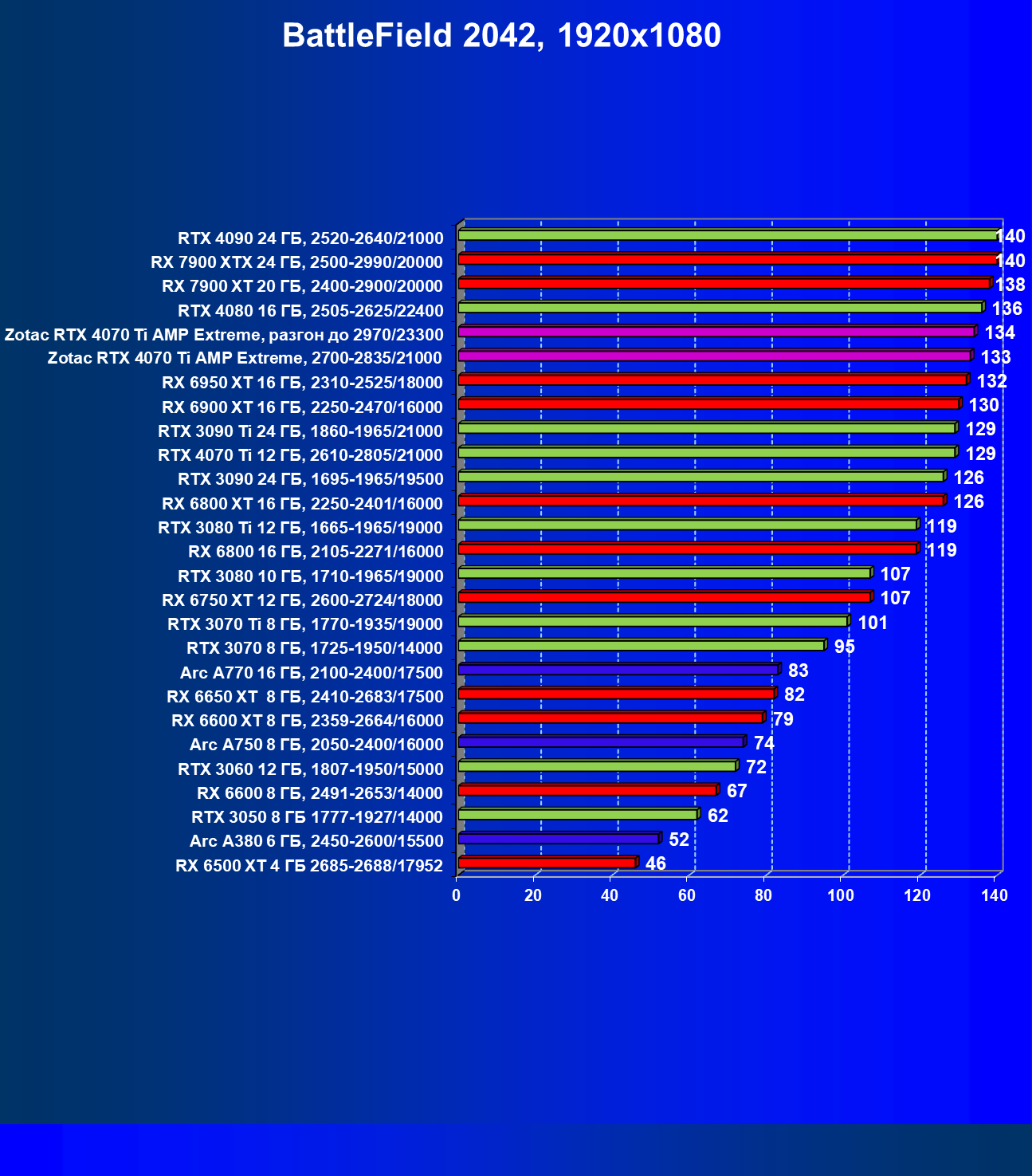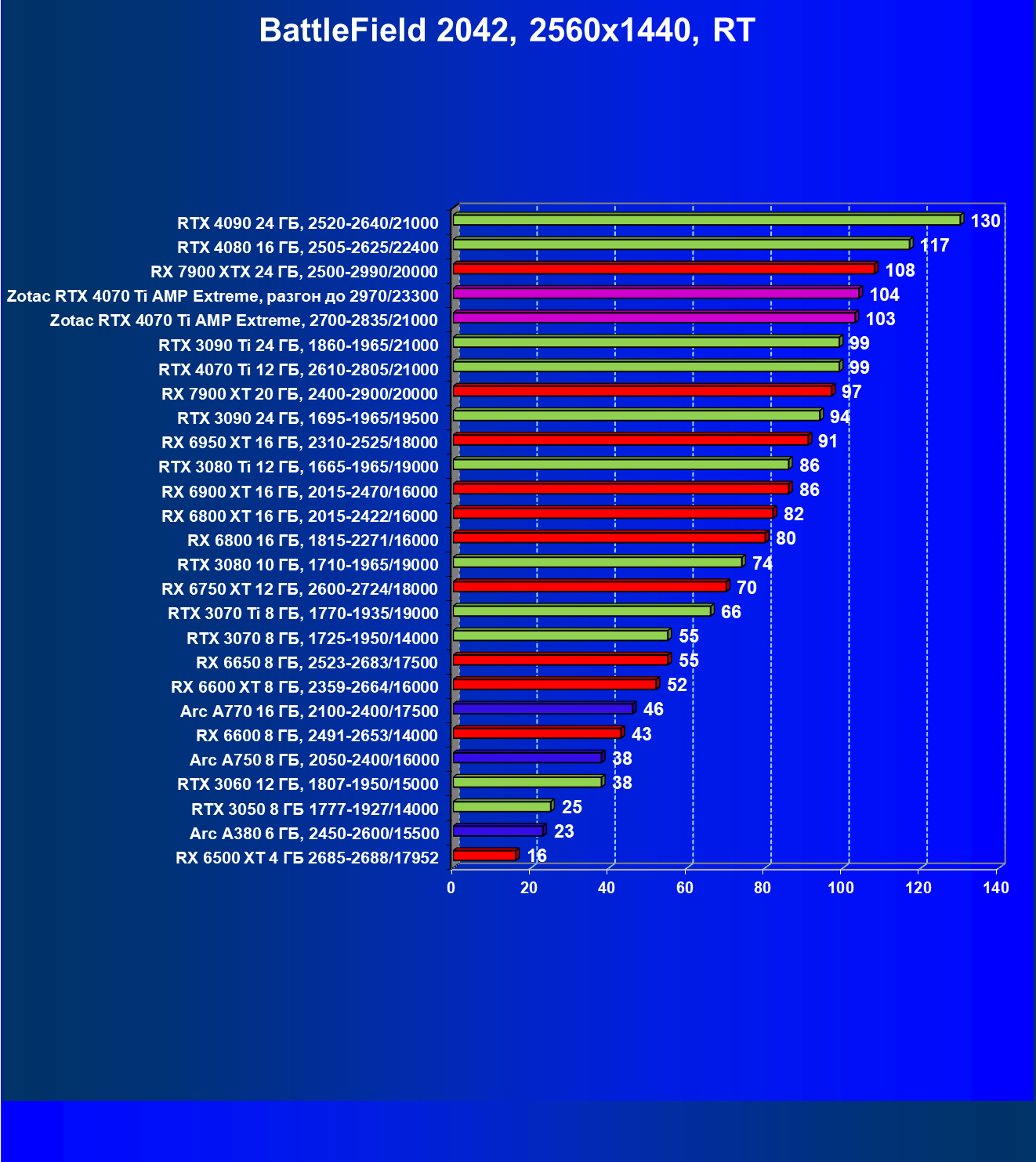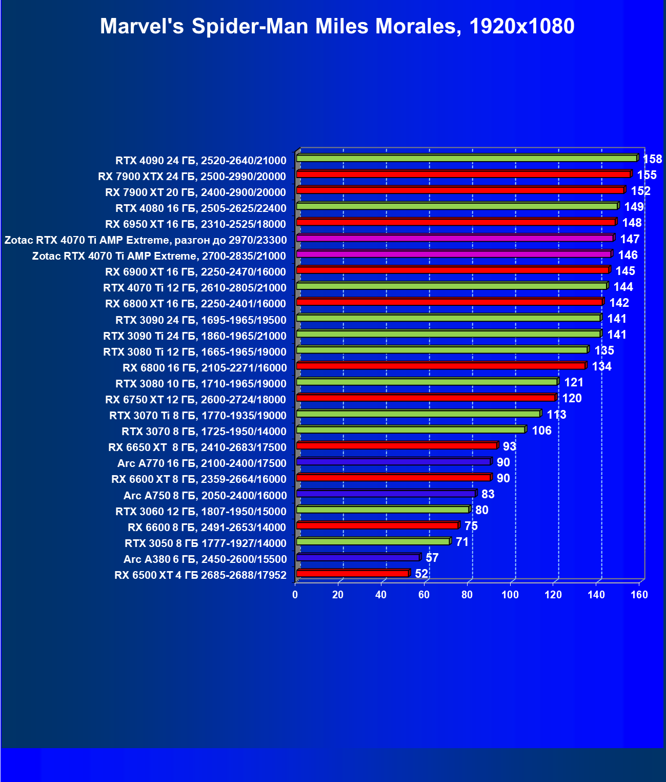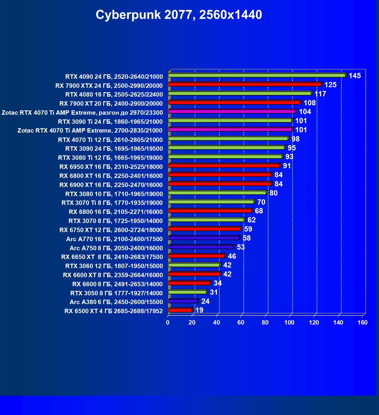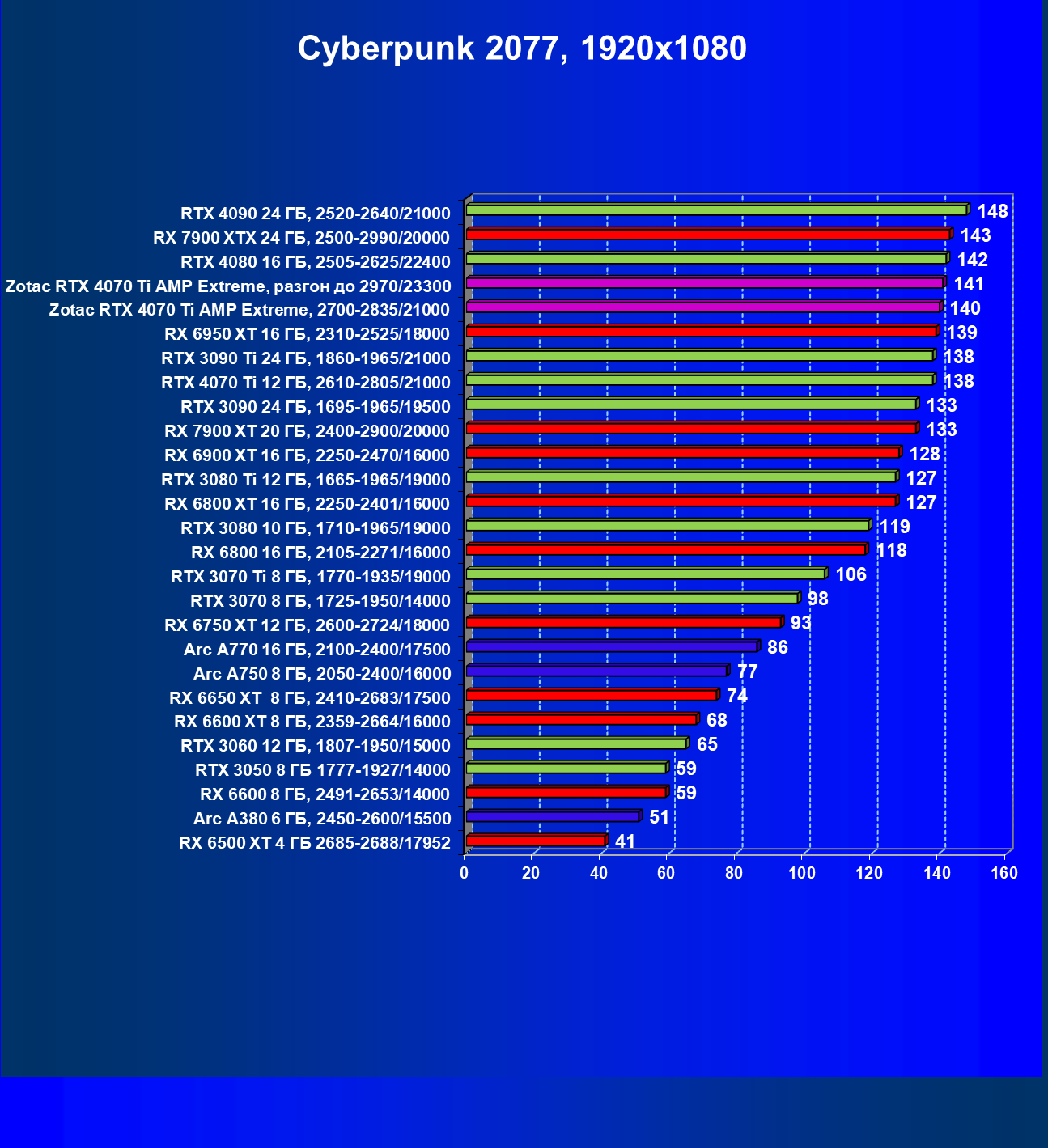 | 03 | Zotac RTX 4070 Ti Amp Extreme, разгон до 2970/23300 | 163 | 1340 | 82 000 |