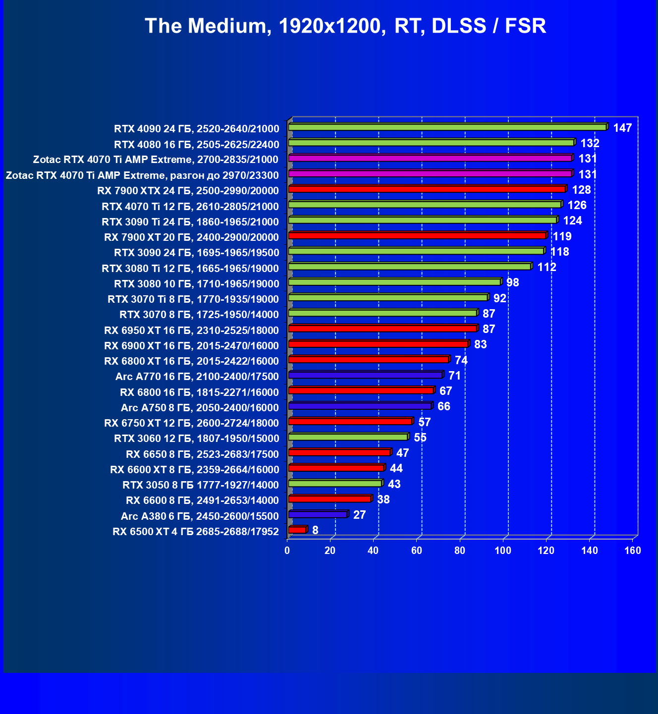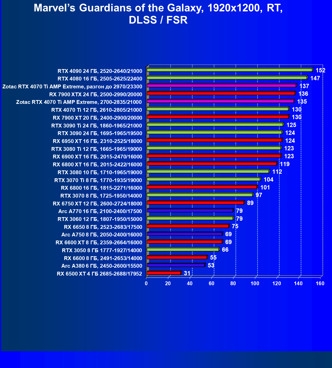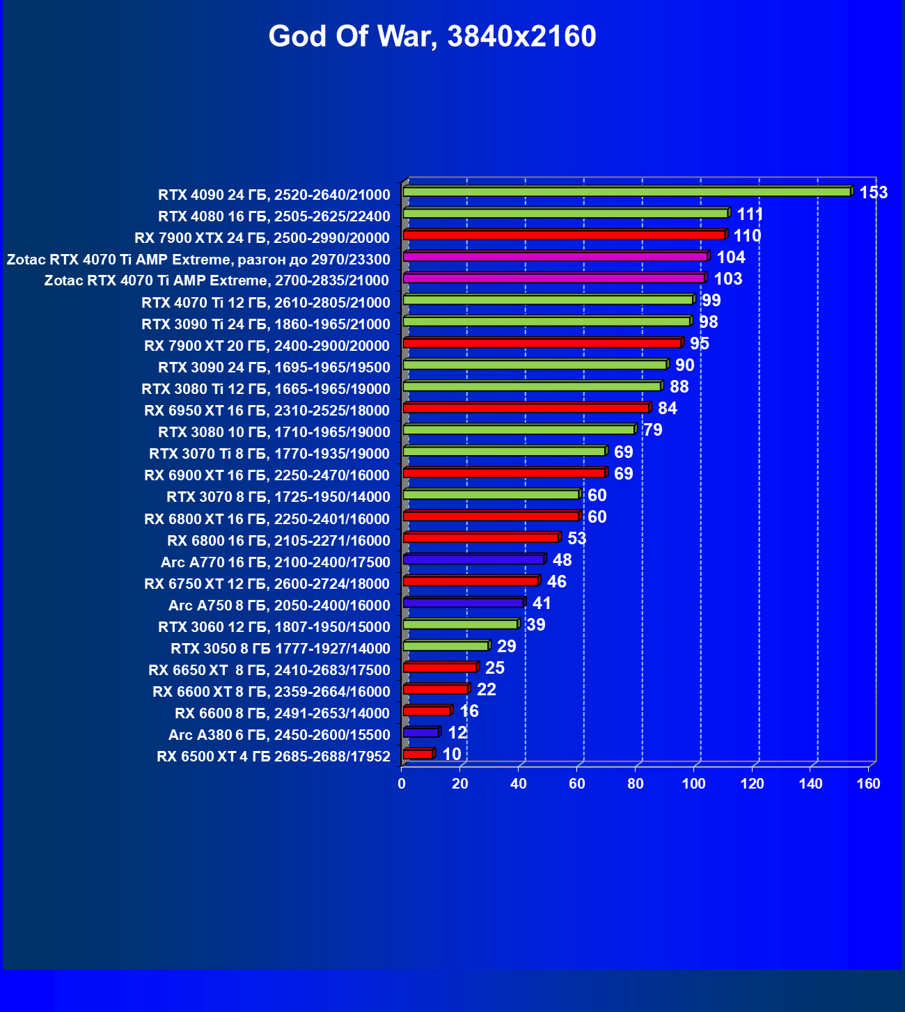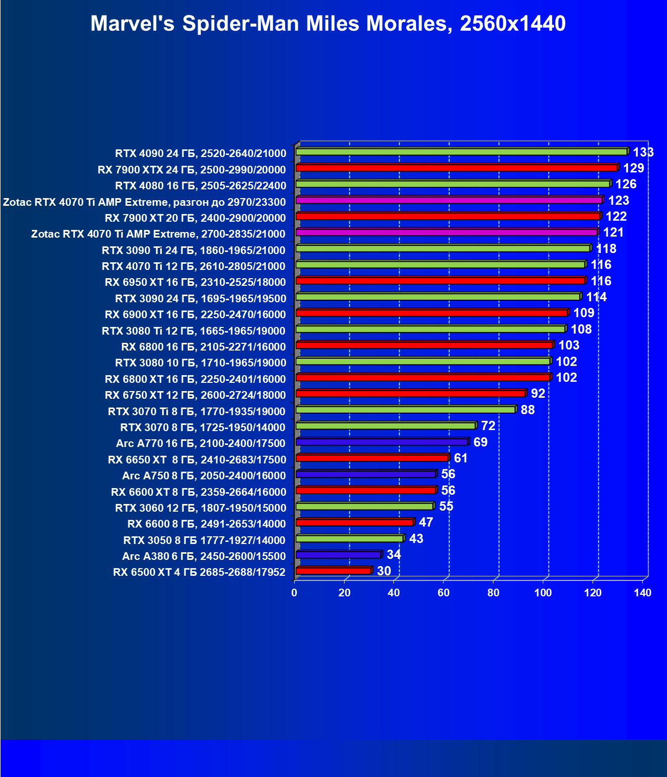 | 03 | Zotac RTX 4070 Ti Amp Extreme, разгон до 2970/23300 | 163 | 1340 | 82 000 |