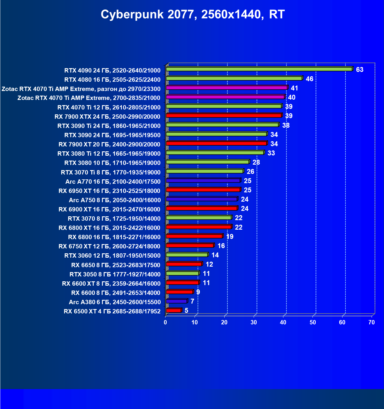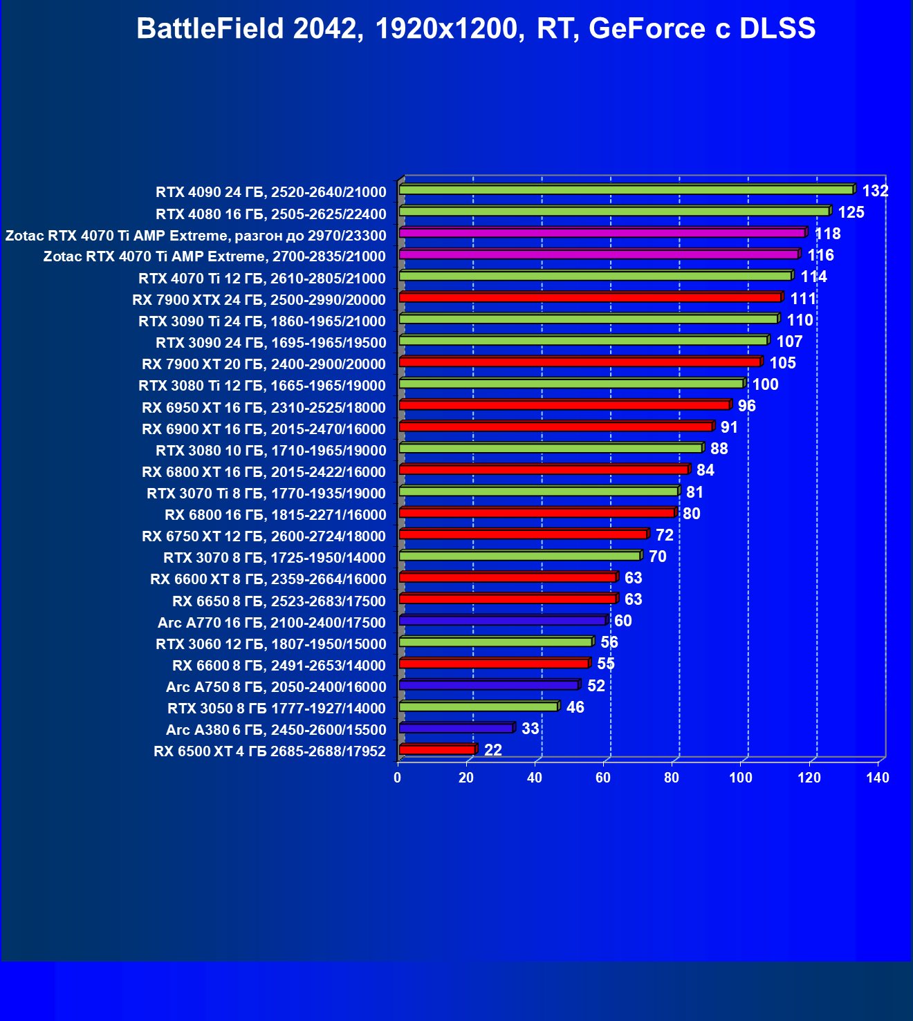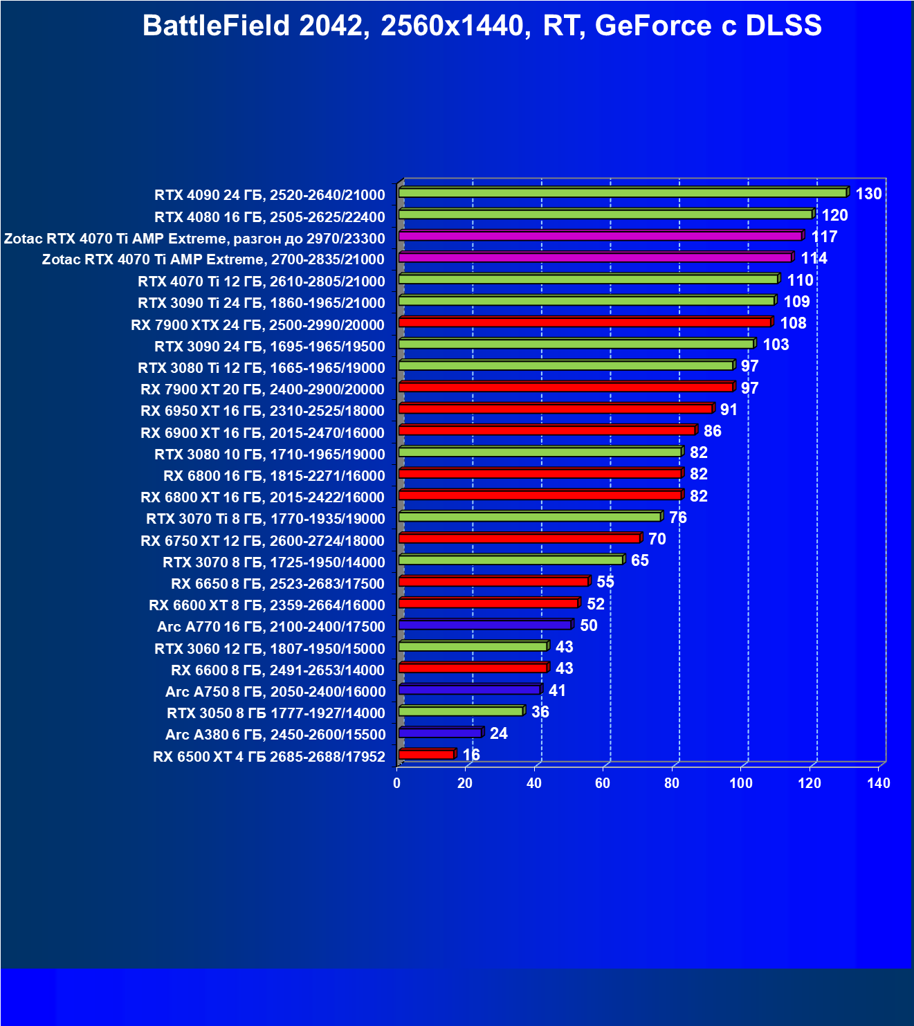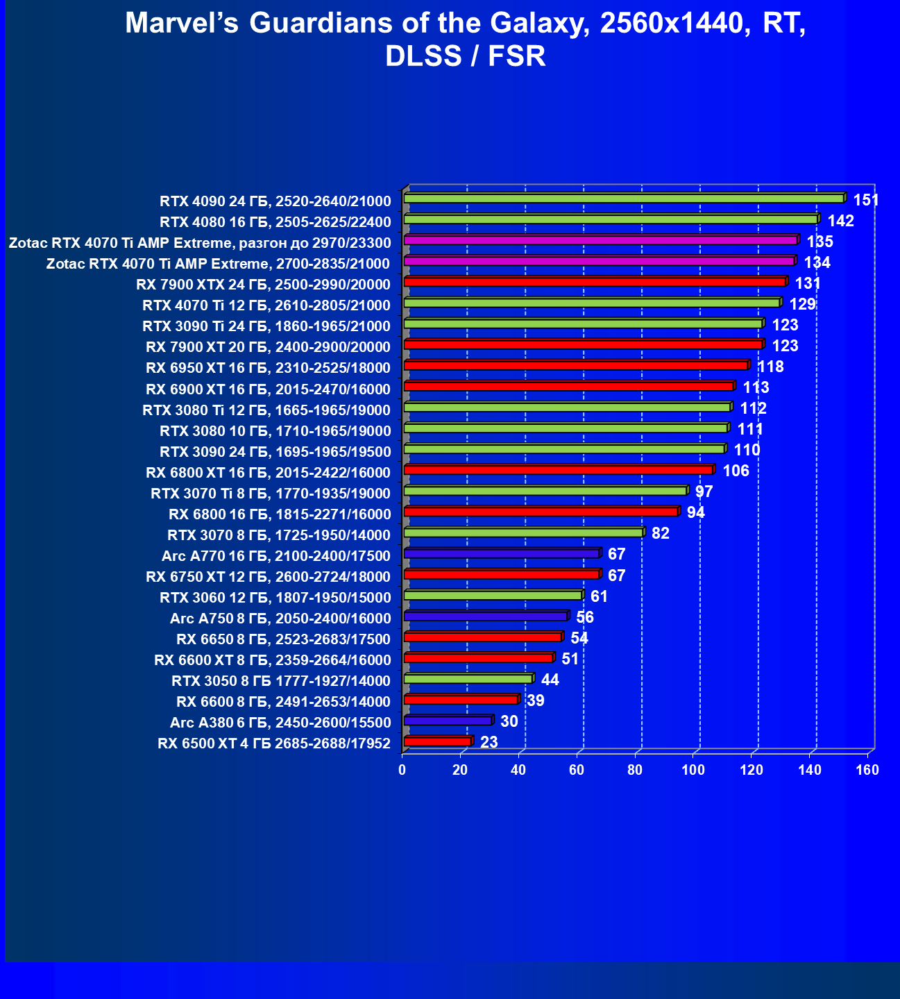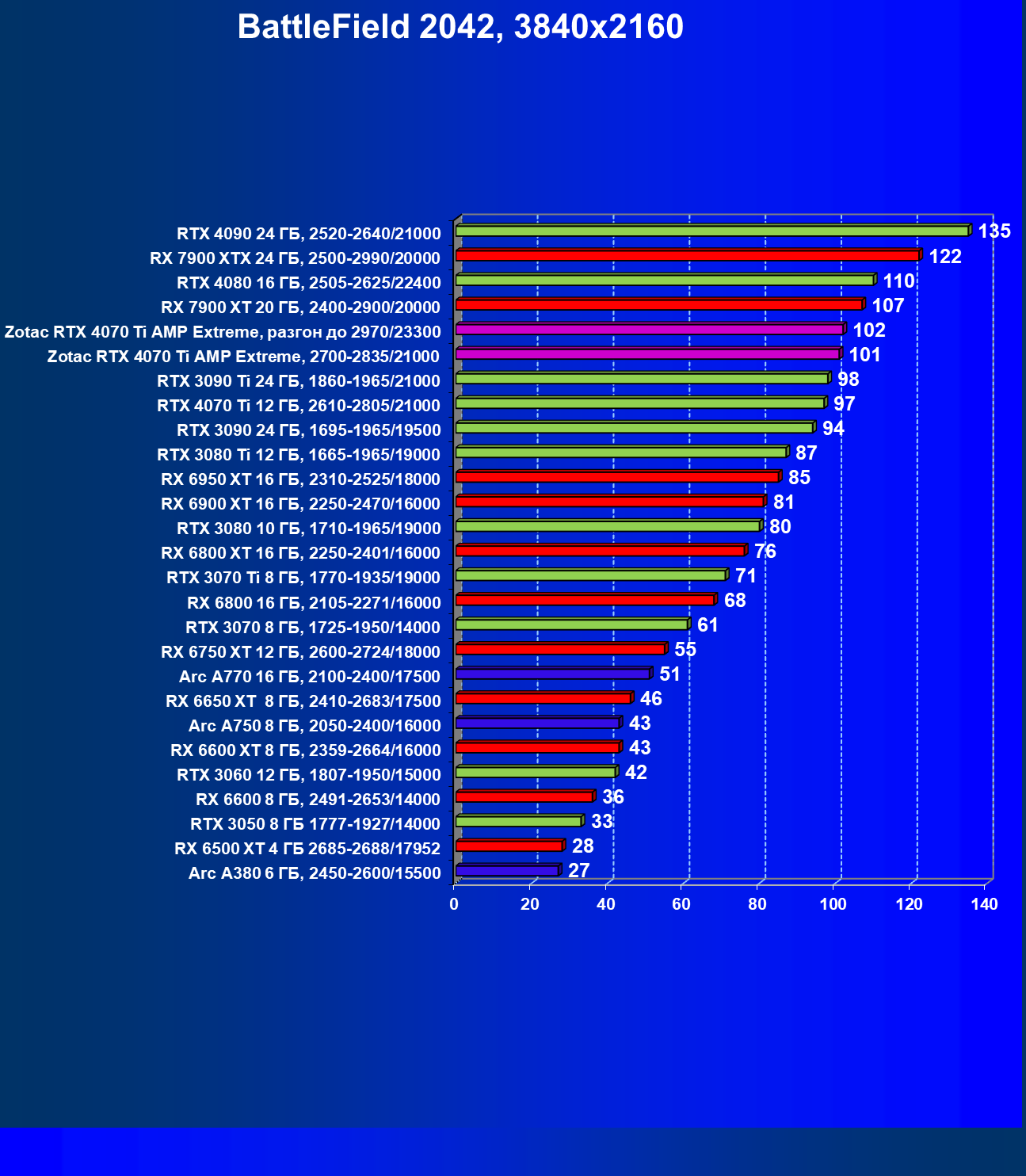 | 03 | Zotac RTX 4070 Ti Amp Extreme, разгон до 2970/23300 | 163 | 1340 | 82 000 |