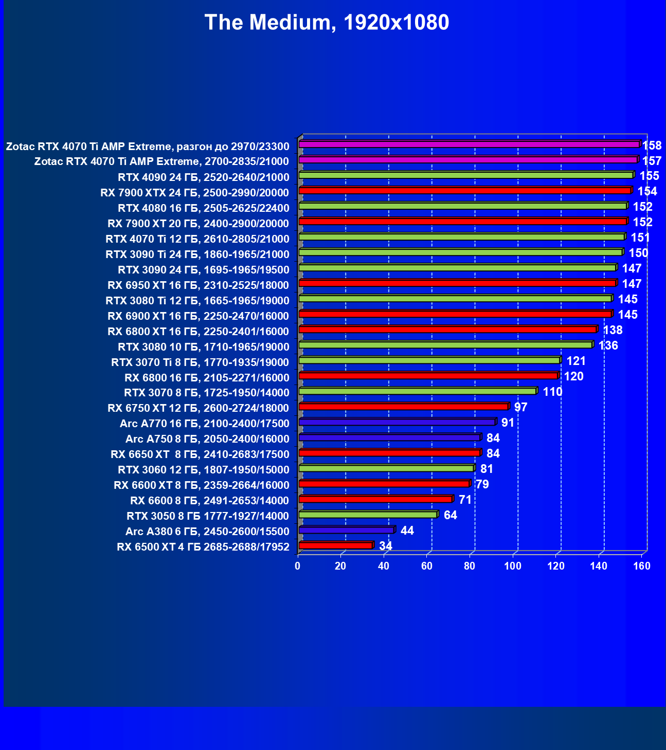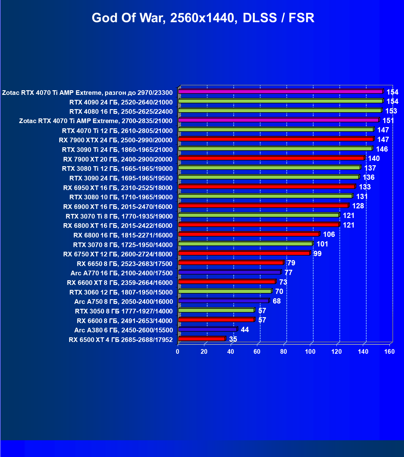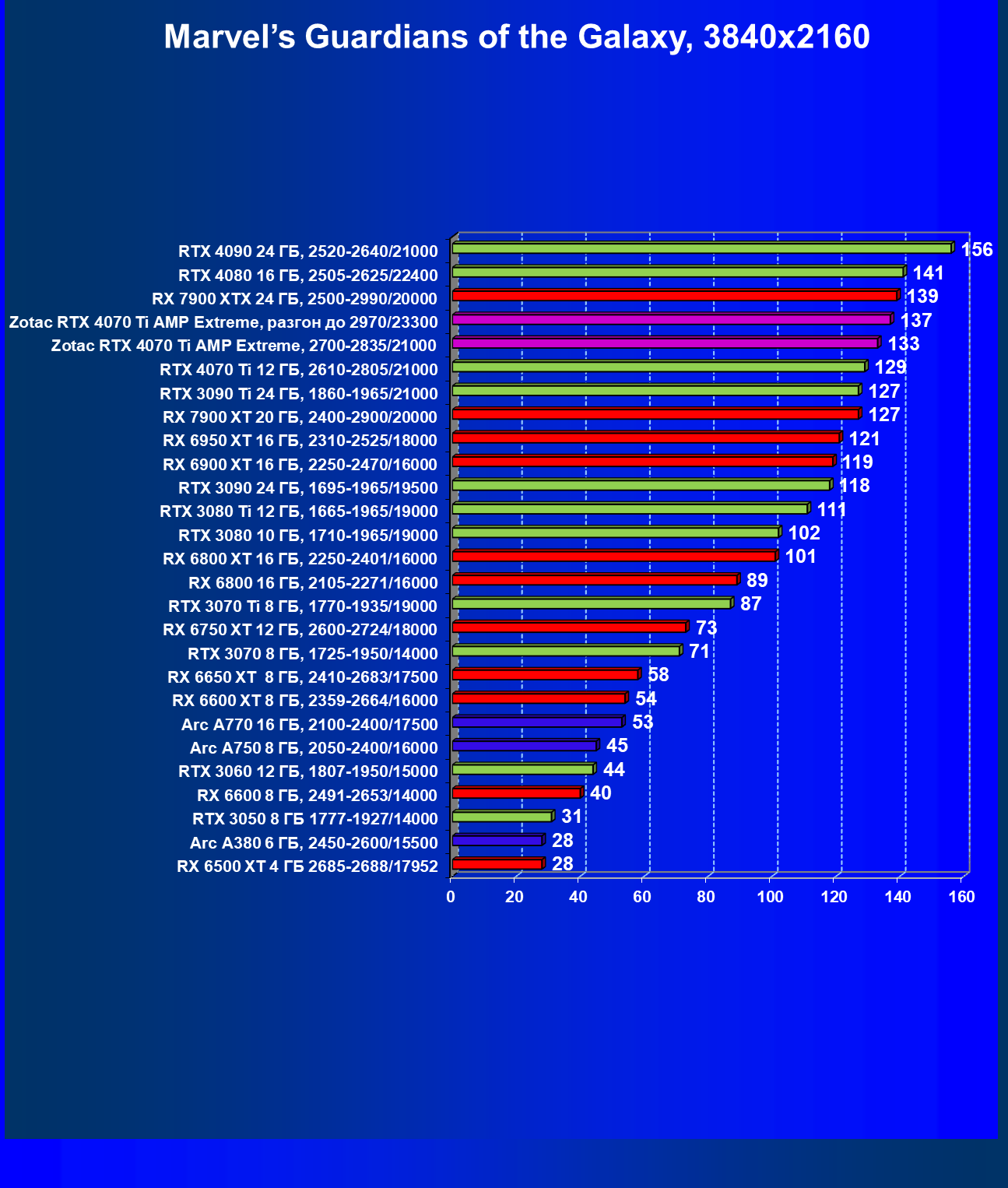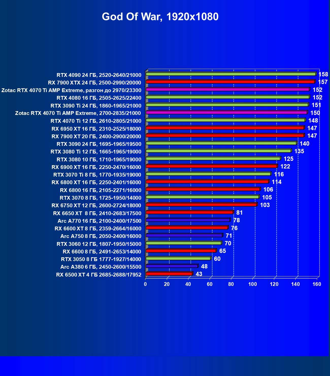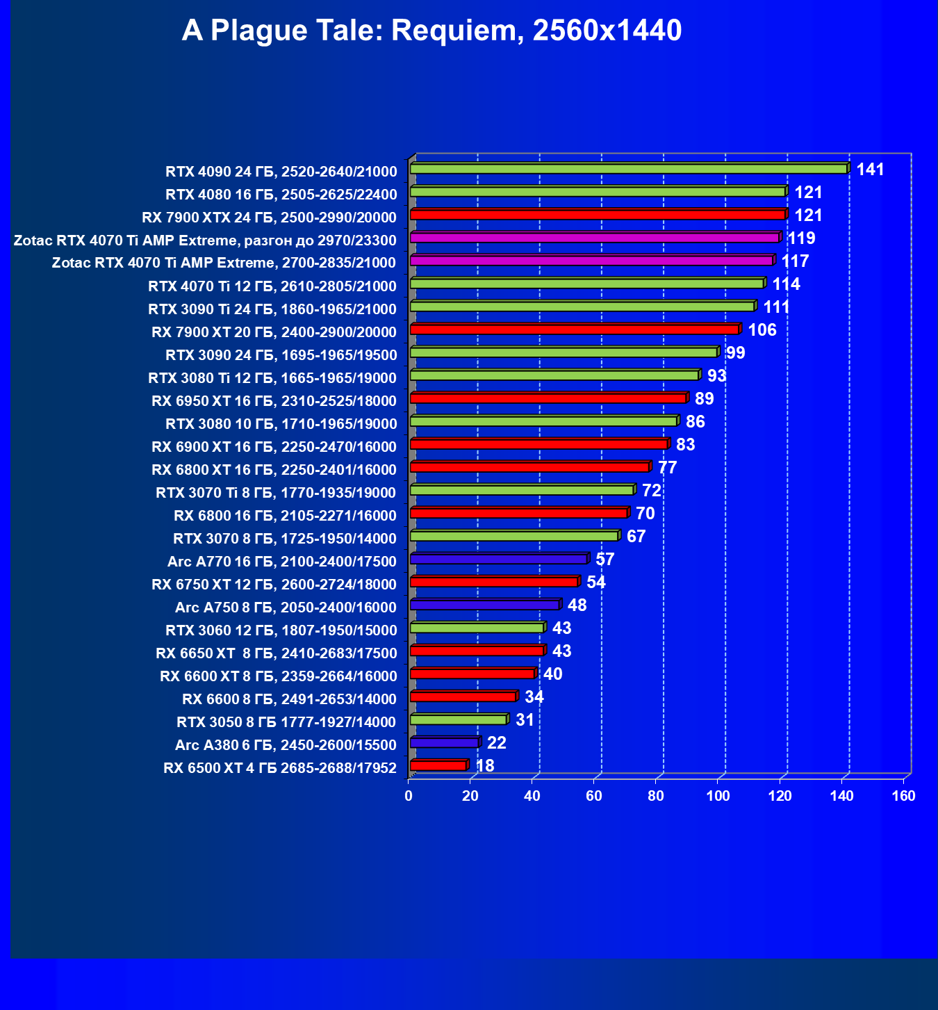 | 03 | Zotac RTX 4070 Ti Amp Extreme, разгон до 2970/23300 | 163 | 1340 | 82 000 |