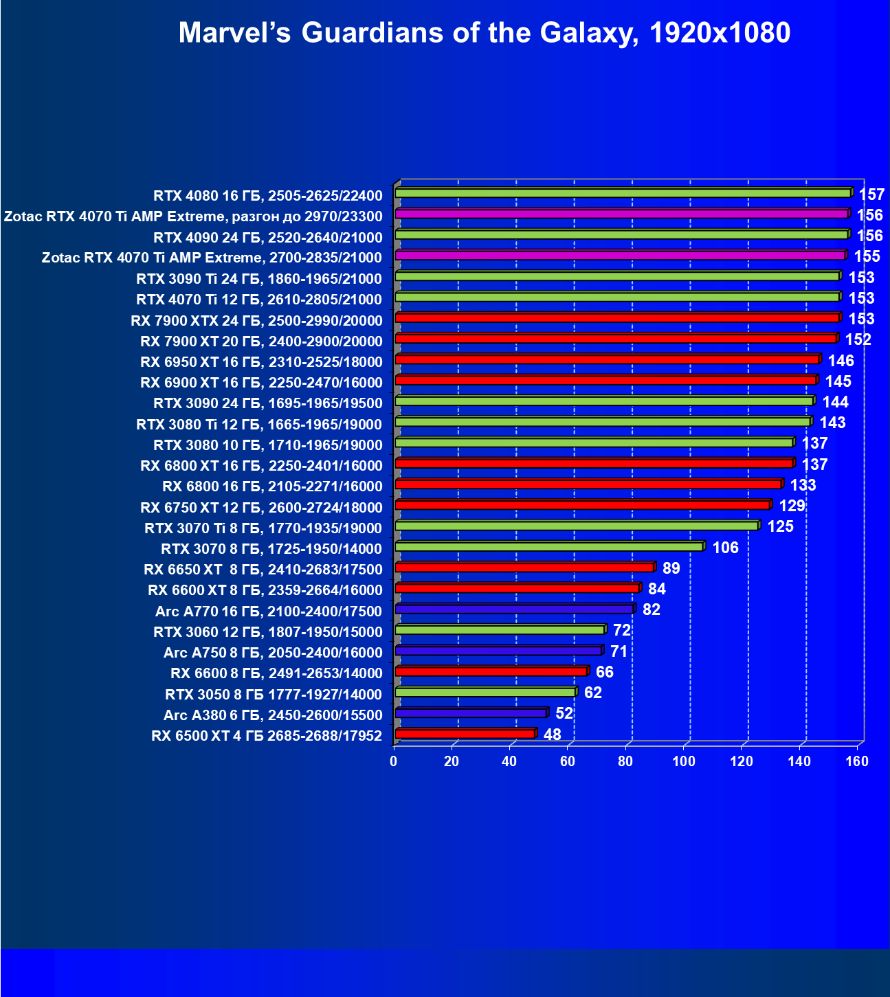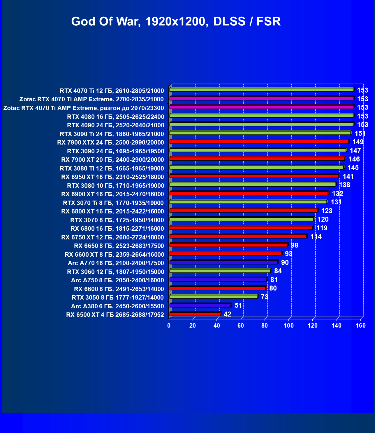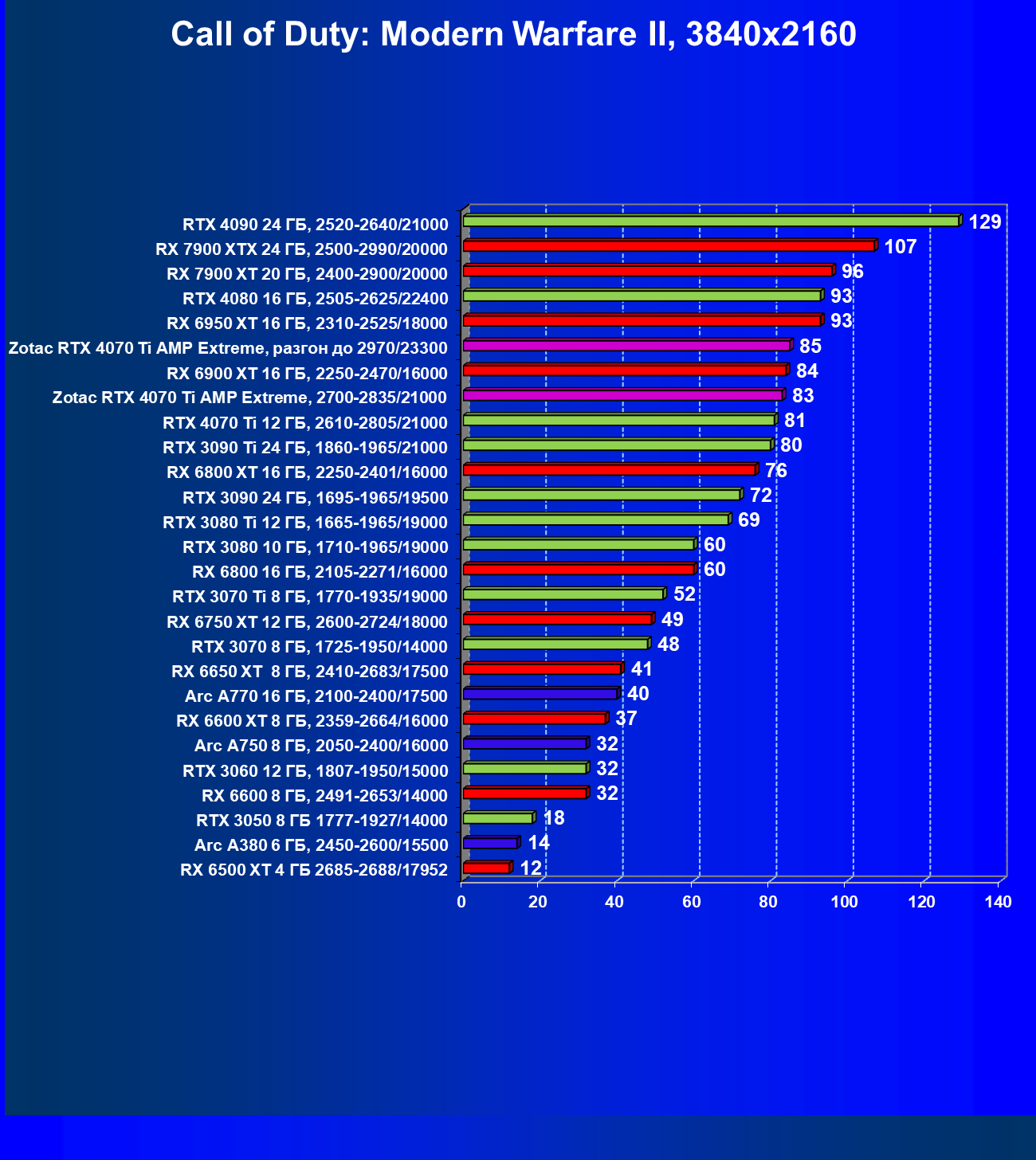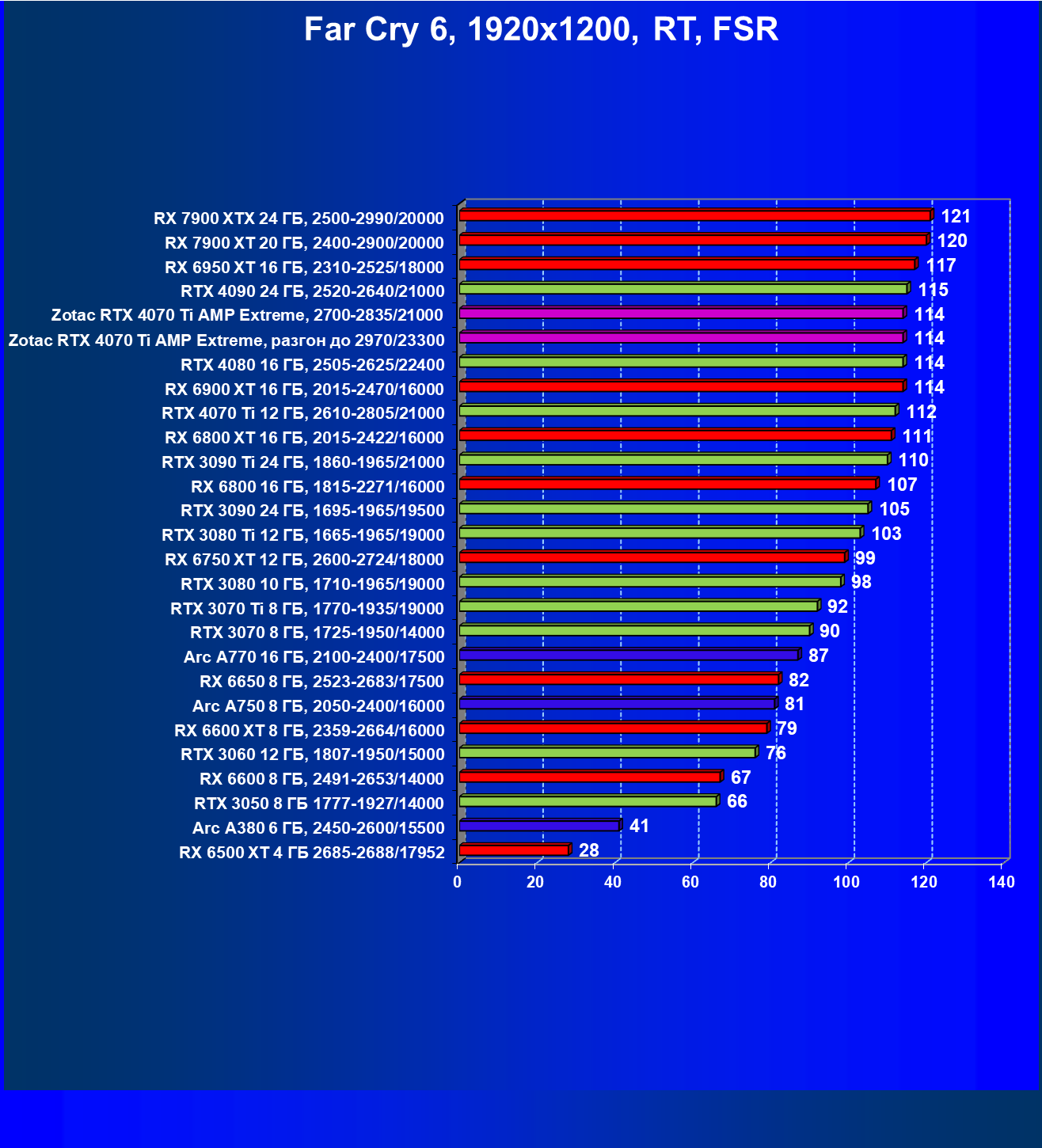 | 03 | Zotac RTX 4070 Ti Amp Extreme, разгон до 2970/23300 | 163 | 1340 | 82 000 |