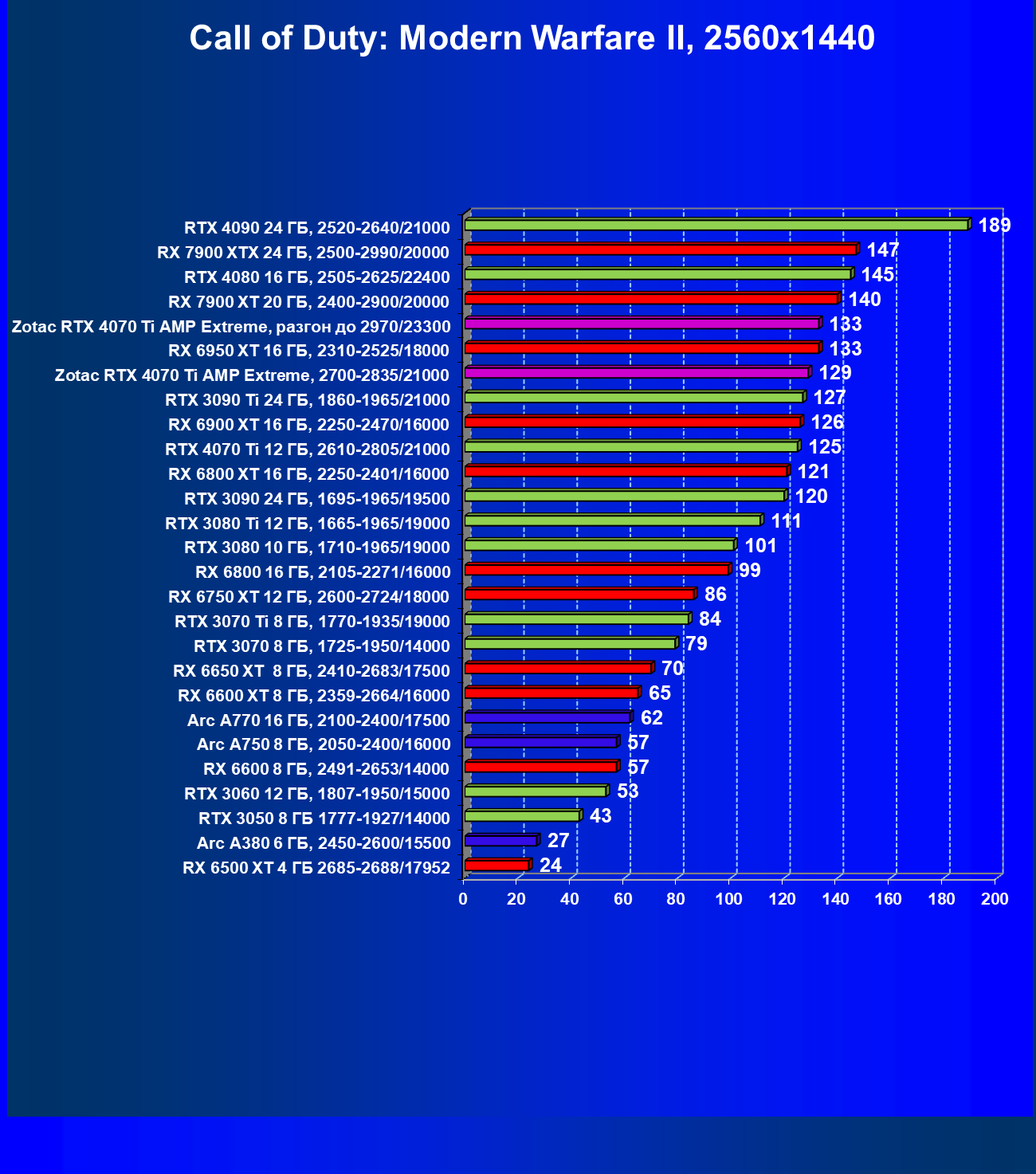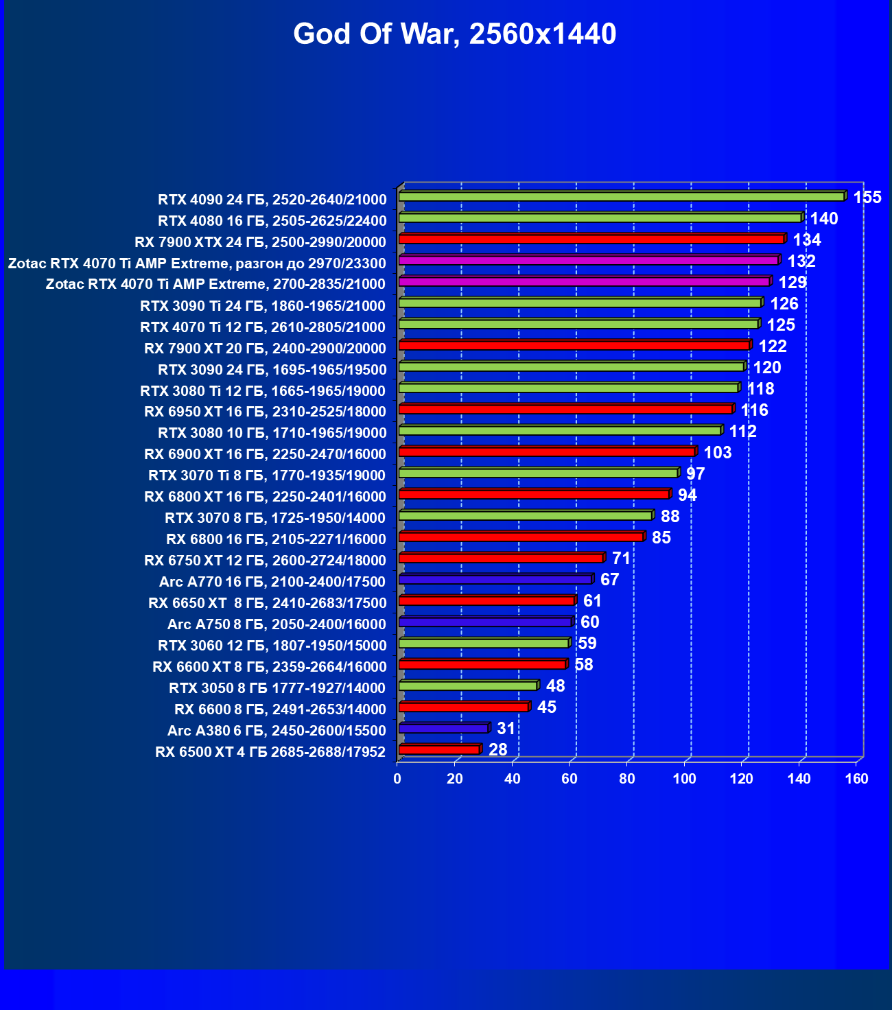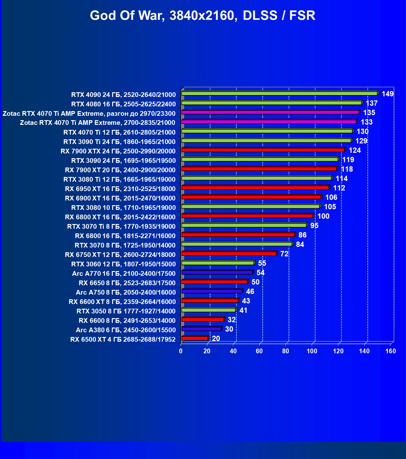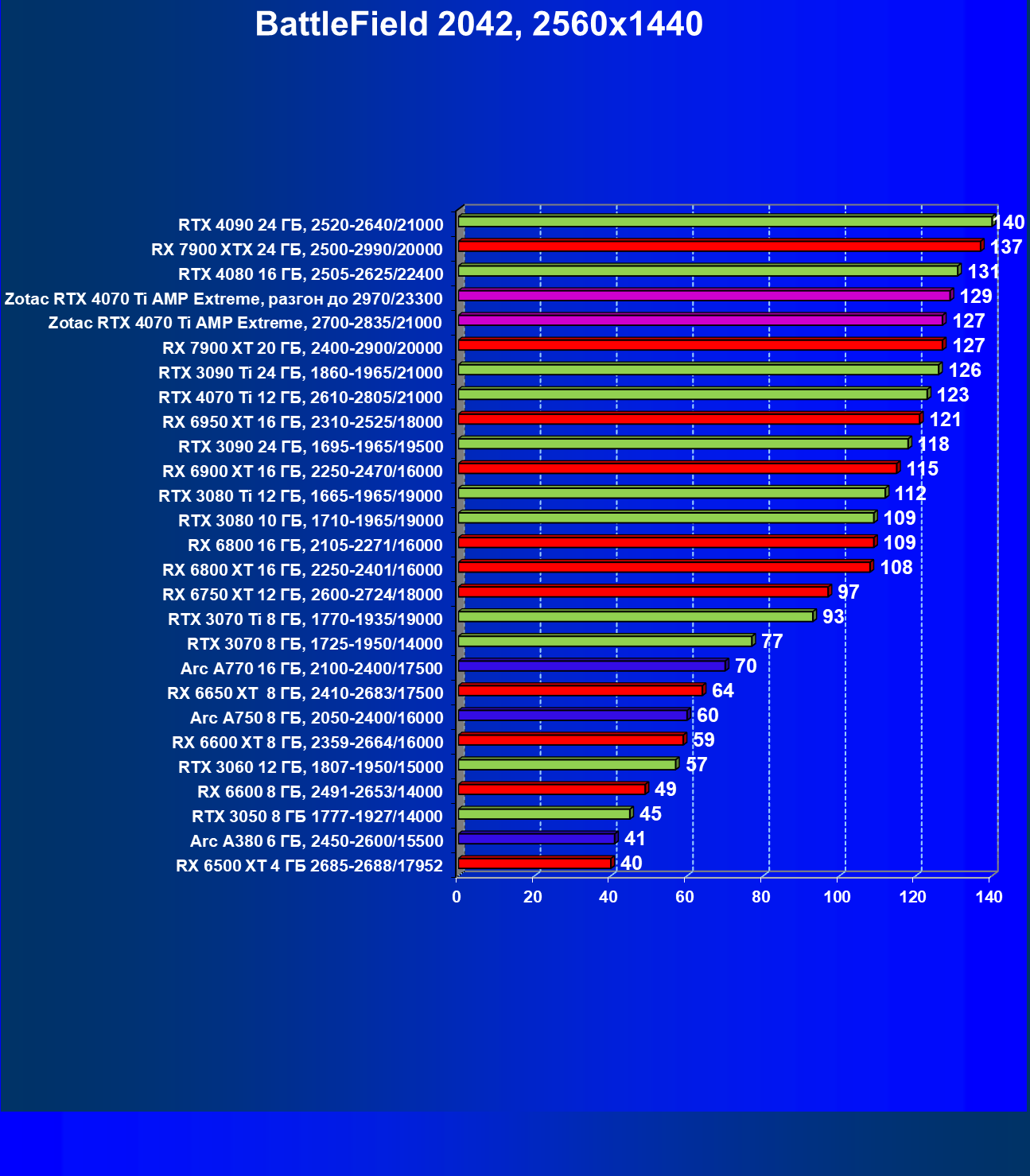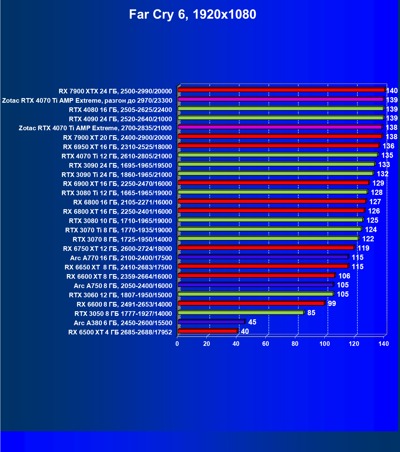 | 03 | Zotac RTX 4070 Ti Amp Extreme, разгон до 2970/23300 | 163 | 1340 | 82 000 |