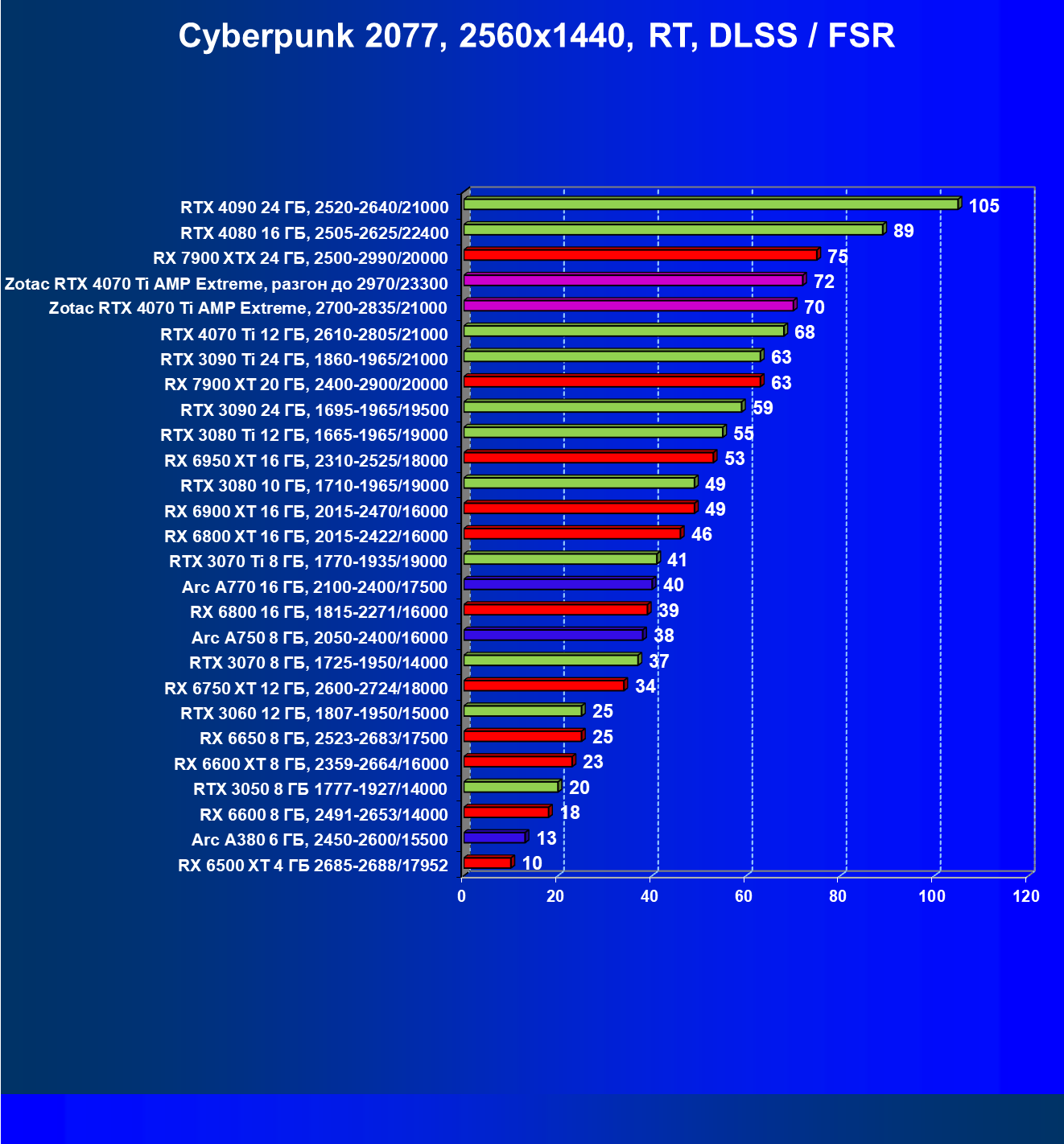 | 03 | Zotac RTX 4070 Ti Amp Extreme, разгон до 2970/23300 | 844 | 103 | 82 000 |