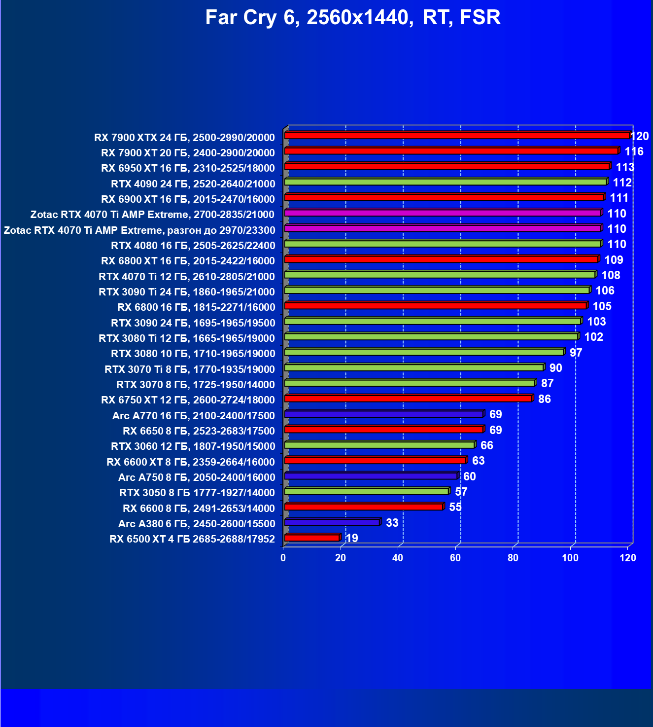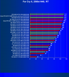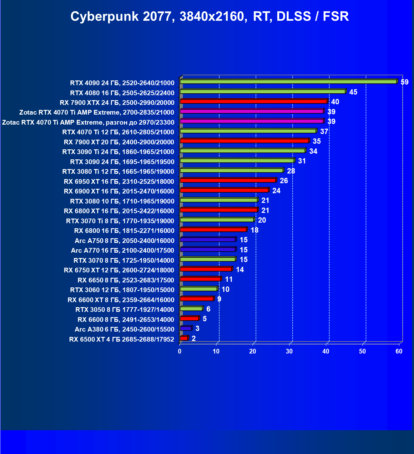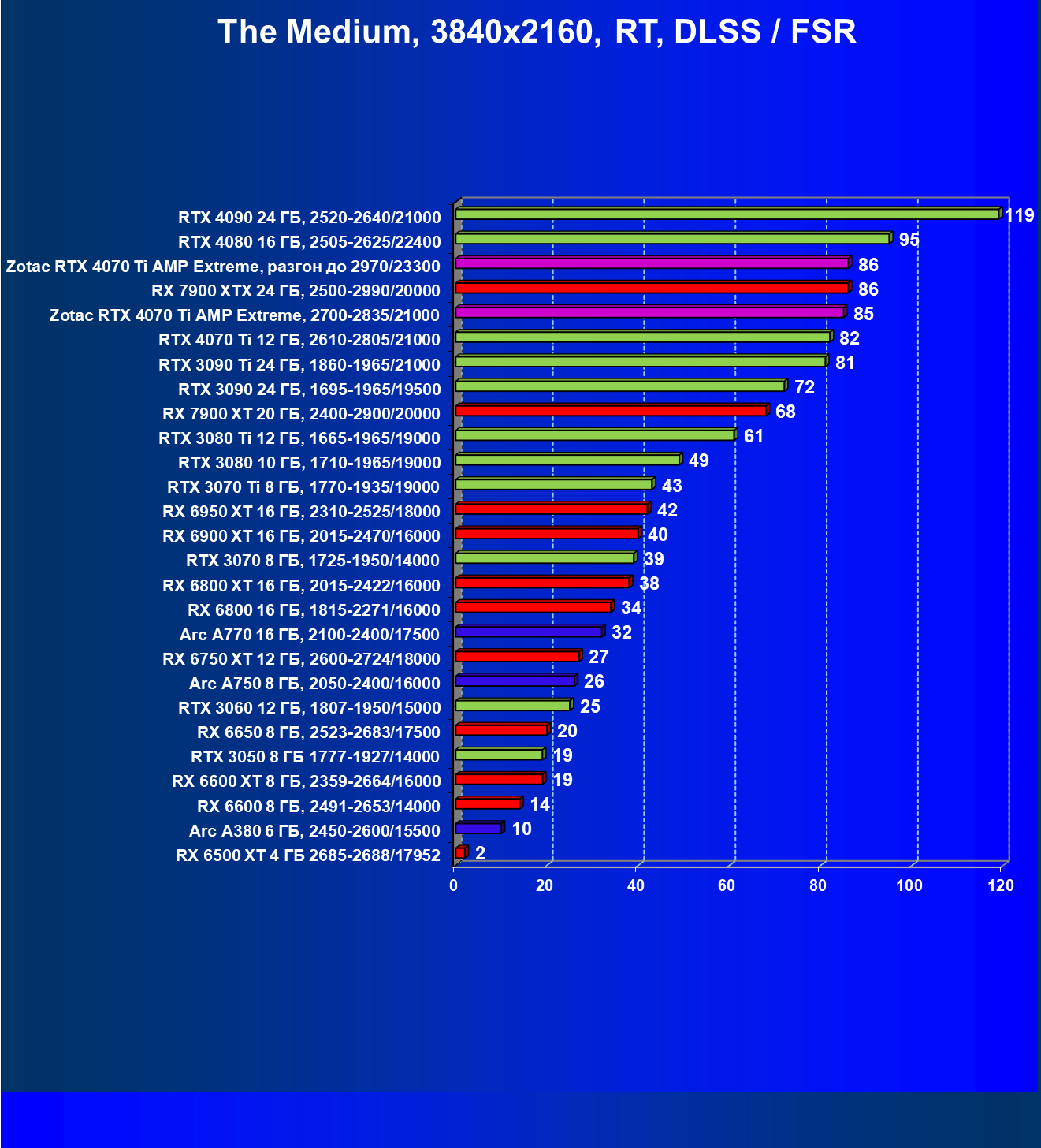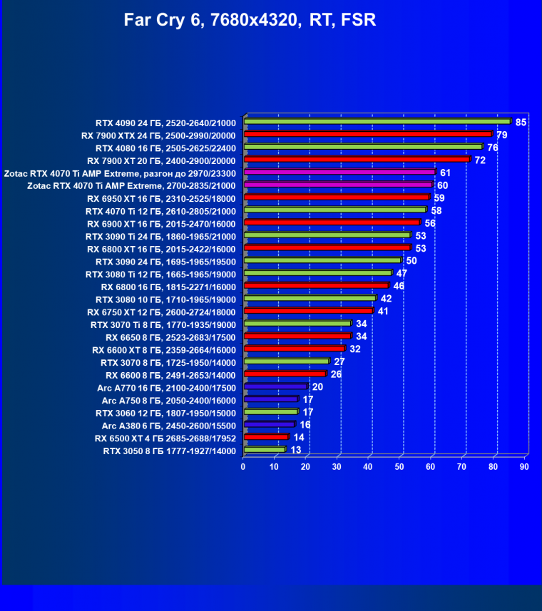 Падение FPS от активации рейтрейсинга до сих пор более ощутимо на решениях от AMD, поэтому в играх с RT (и DLSS) карта Zotac засчет фабричного разгона смогла догнать даже флагман AMD — Radeon RX 7900 XTX, который существенно дороже, когда как референс-аналог RTX 4070 Ti все же уступает лидеру из стана «красных».