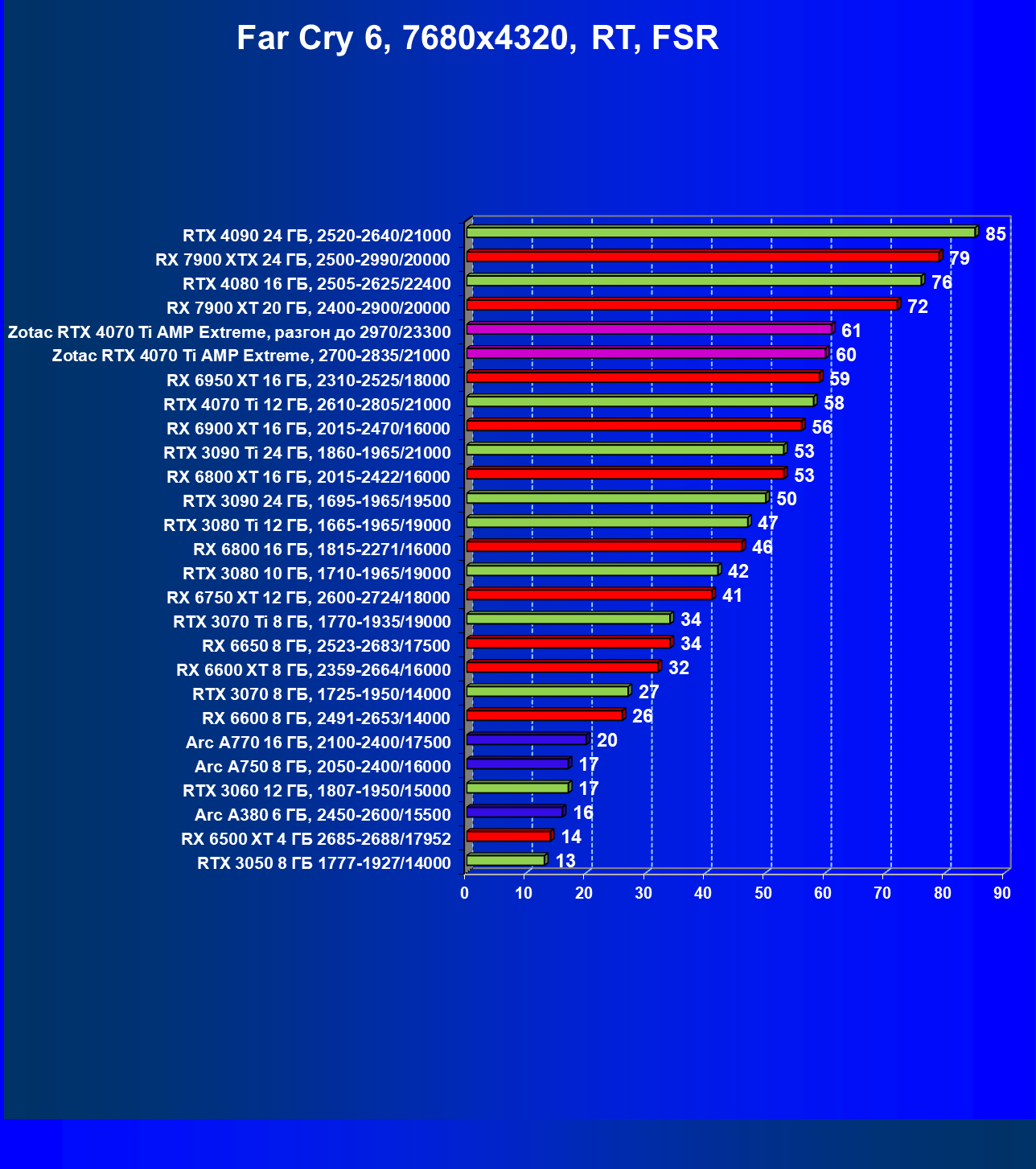 | 23 | RX 6950 XT 16 ГБ, 2310—2525/18000 | 77 | 644 | 83 500 |