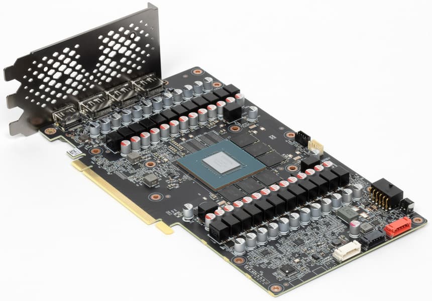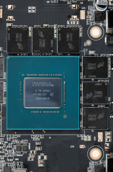 Карта имеет 12 ГБ памяти GDDR6X SDRAM, размещенной в 6 микросхемах по 16 Гбит на лицевой стороне PCB. Микросхемы памяти Micron (GDDR6X, MT61K512M32KPA-21 / D8BZC) рассчитаны на номинальную частоту работы в 2625 (21000) МГц.