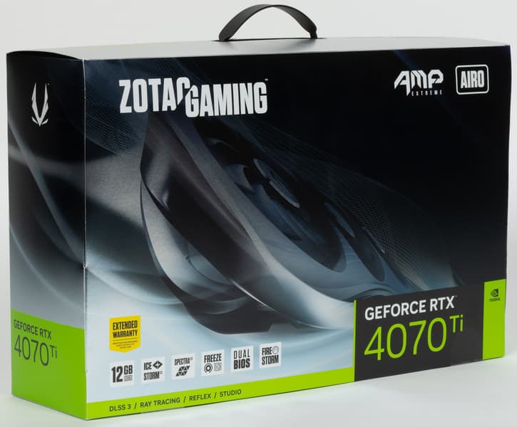 Zotac Gaming GeForce RTX 4070 Ti Amp Extreme Airo (12 ГБ) — интересный и симпатичный представитель серии GeForce RTX 40, находящийся на третьей ступени сверху. GeForce RTX 4070 Ti практически равен по производительности флагману предыдущего поколения GeForce RTX 3090 Ti, но дополнительно имеет потенциал в виде DLSS 3.0.