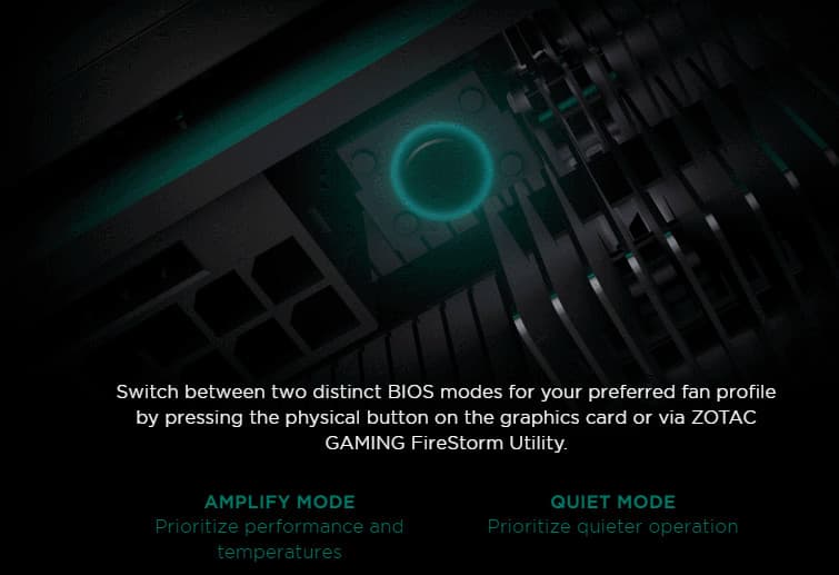Особо следует отметить, что данный переключатель BIOS представляет собой просто кнопку, и текущую (актуальную) версию BIOS никак не узнать, кроме как через программные средства (фирменную утилиту Zotac и др.) Работает переключатель только во время работы карты (следует нажать на кнопку, при этом подсветка мигнет красным цветом — переключение свершилось), затем надо перезагрузить ПК, чтобы новая версия BIOS вступила в силу. Также можно переключать режимы BIOS напрямую через утилиту Zotac, но все равно потребуется перезагрузка.