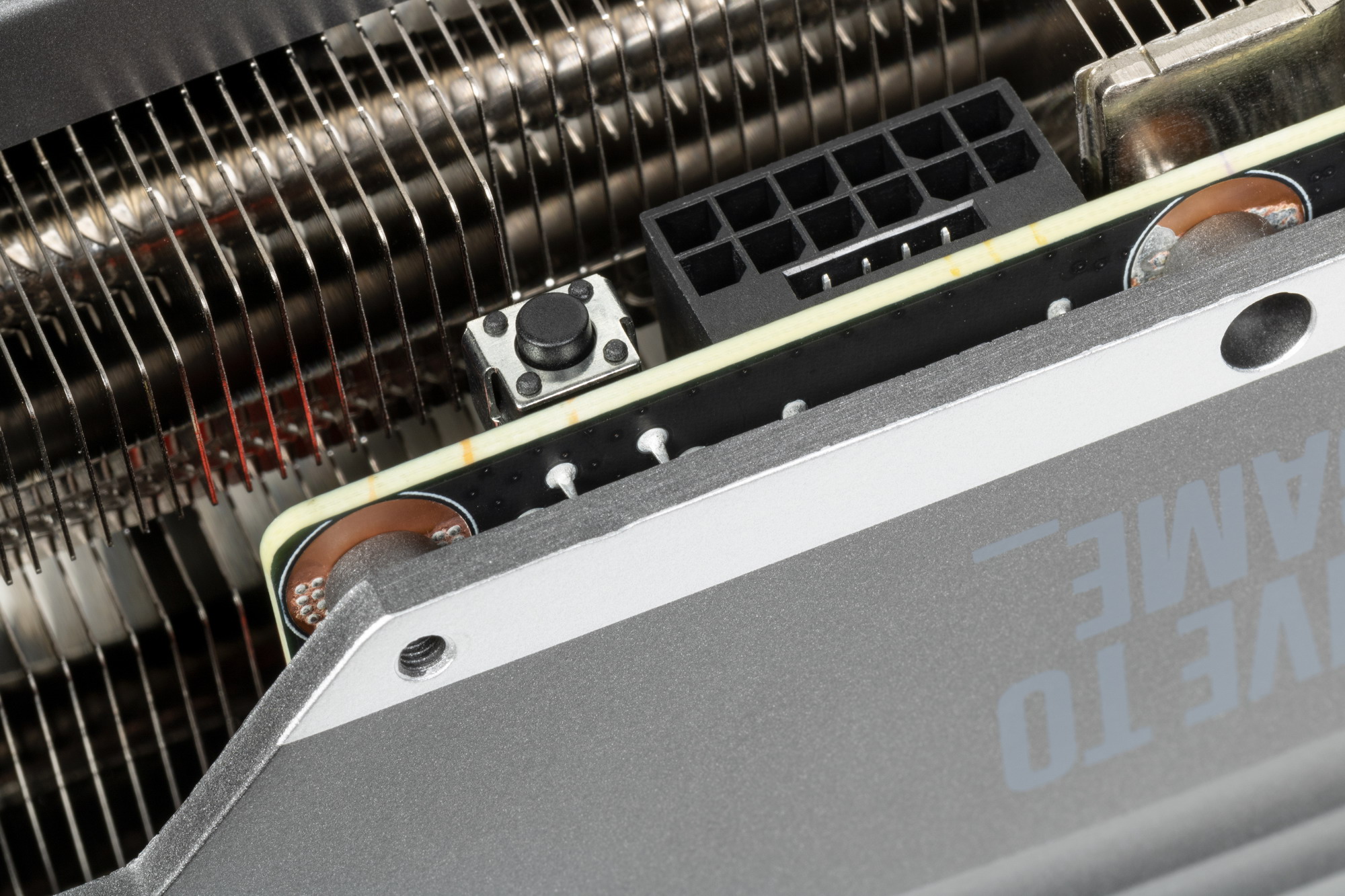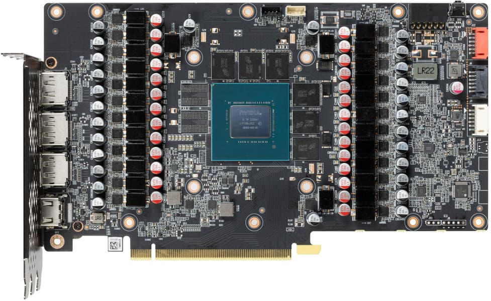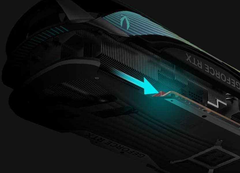 Еще в 2020 году возникла новая концепция охлаждения видеокарт, продвигаемая Nvidia: видеокарты имеют относительно компактную PCB, при этом радиатор системы охлаждения намного более длинный, так что правый вентилятор СО может продувать радиатор насквозь. Здесь мы видим кулер, выполненный именно по этой концепции: его основой является огромный многосекционный пластинчатый никелированный радиатор с тепловыми трубками, распределяющими тепло по ребрам радиатора.