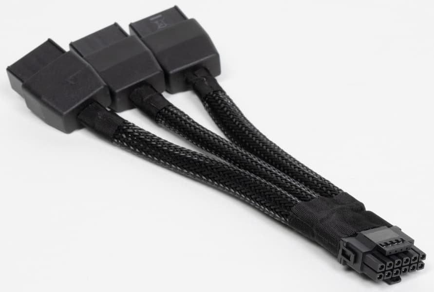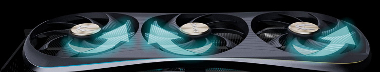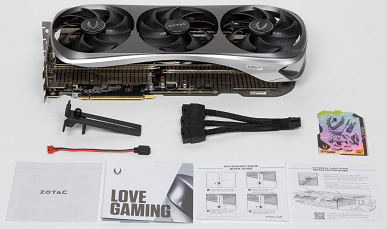 Карта Zotac имеет 16-контактный разъем питания версии PCIe 5.0. Хотя в комплекте поставки имеется адаптер-переходник для подключения разъемов питания типа PCIe 2.0 (с 3 таких разъемов), лучше все же использовать блоки питания стандарта ATX 3.0 с полноценной поддержкой питания PCIe 5.0 (с кабелем 12VHPWR). Имеющийся же переходник питания ни в коем случае нельзя изгибать непосредственно после 16-контактного разъема.