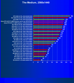 Хорошо видно, что RTX 4070 Ti в целом идет практически на равных с флагманом прежнего поколения RTX 3090 Ti, опережая Radeon RX 6950 XT на 6%. При этом карта Zotac засчет фабричного разгона уже обходит в среднем референс-аналог RTX 4070 Ti на 3%, а RX 6950 XT — на 9%. Более дорогой Radeon RX 7900 XT выдает чуть большую производительность, однако ручной разгон карты Zotac позволил догнать RX 7900 XT и даже чуть обойти.